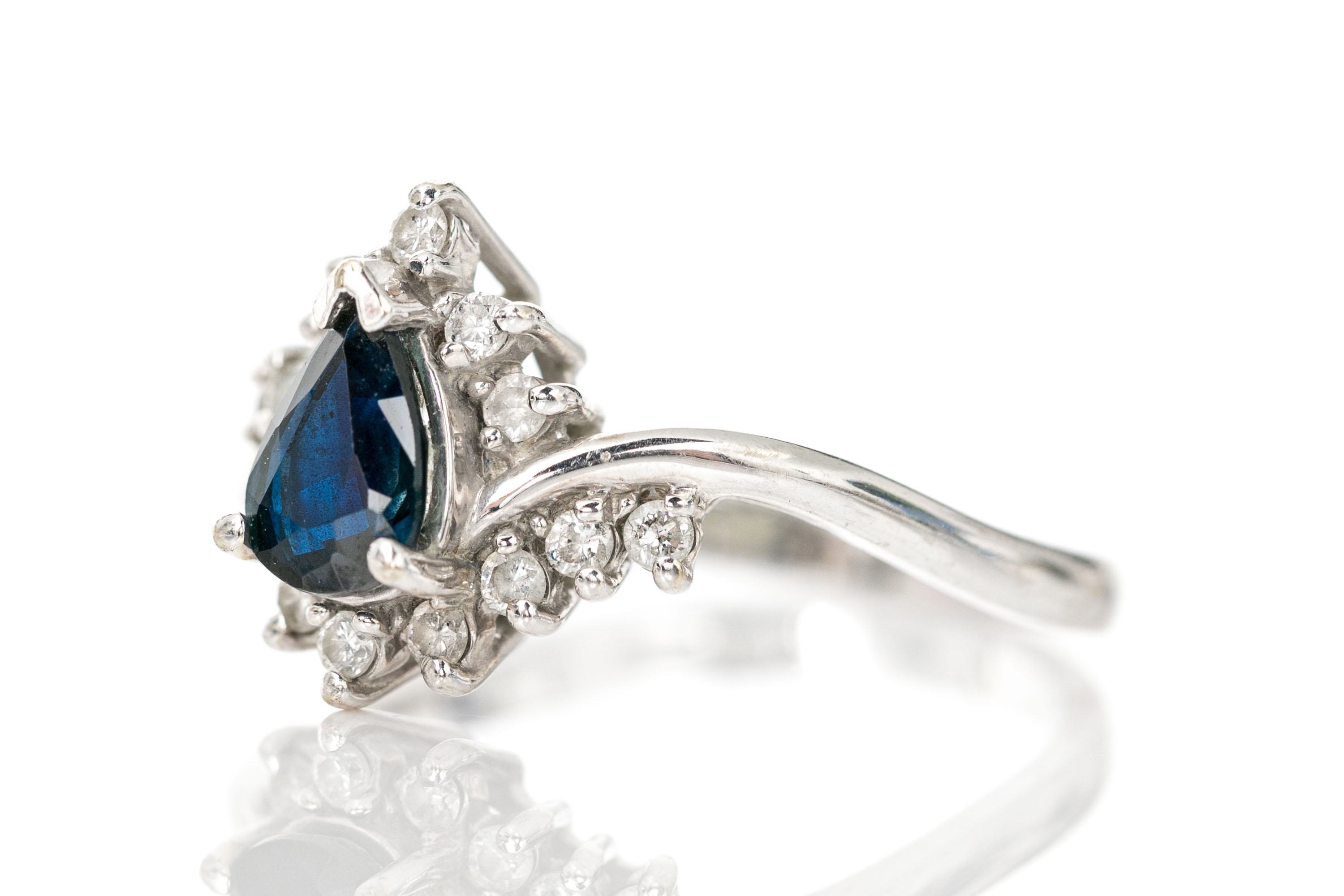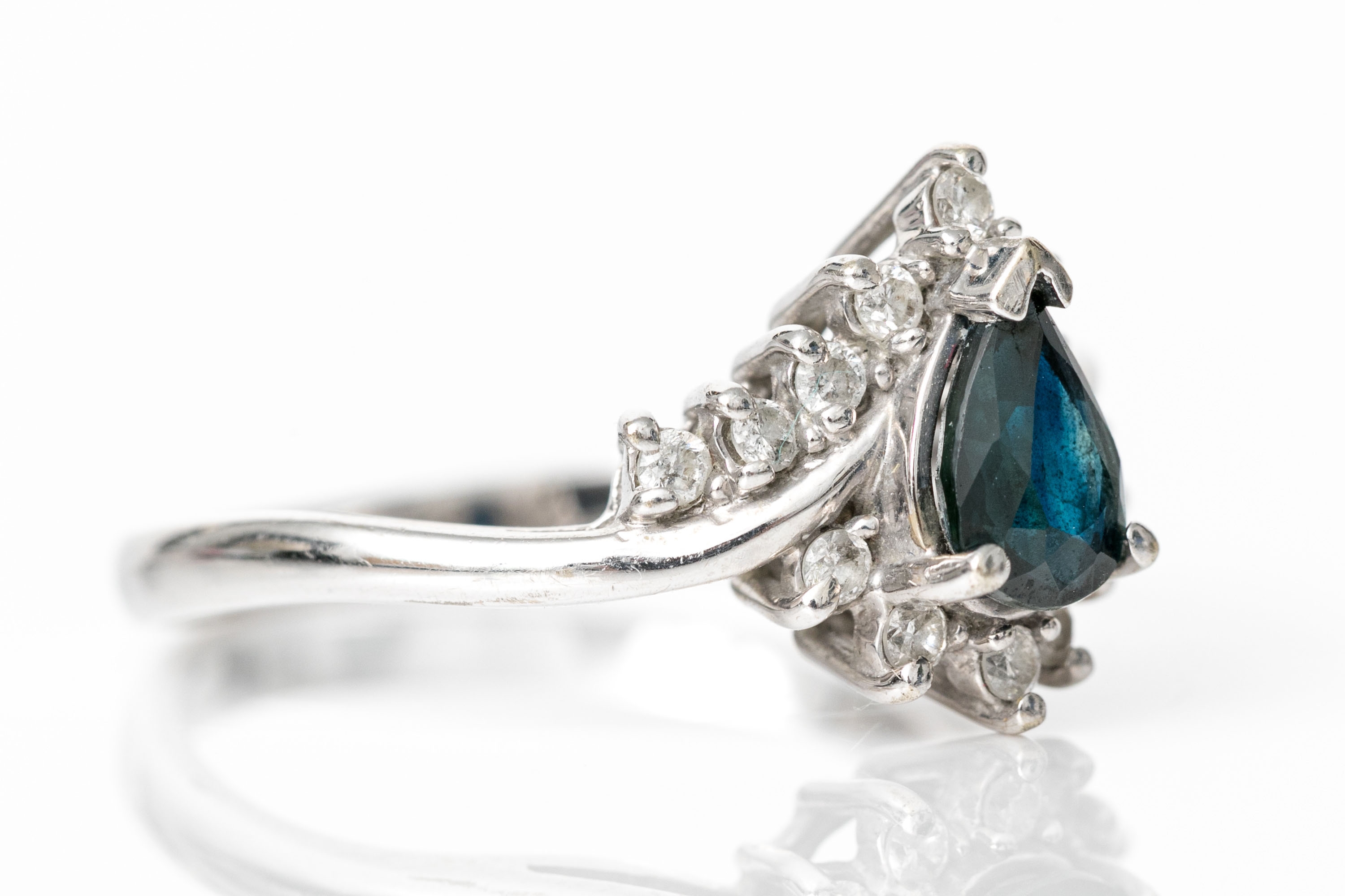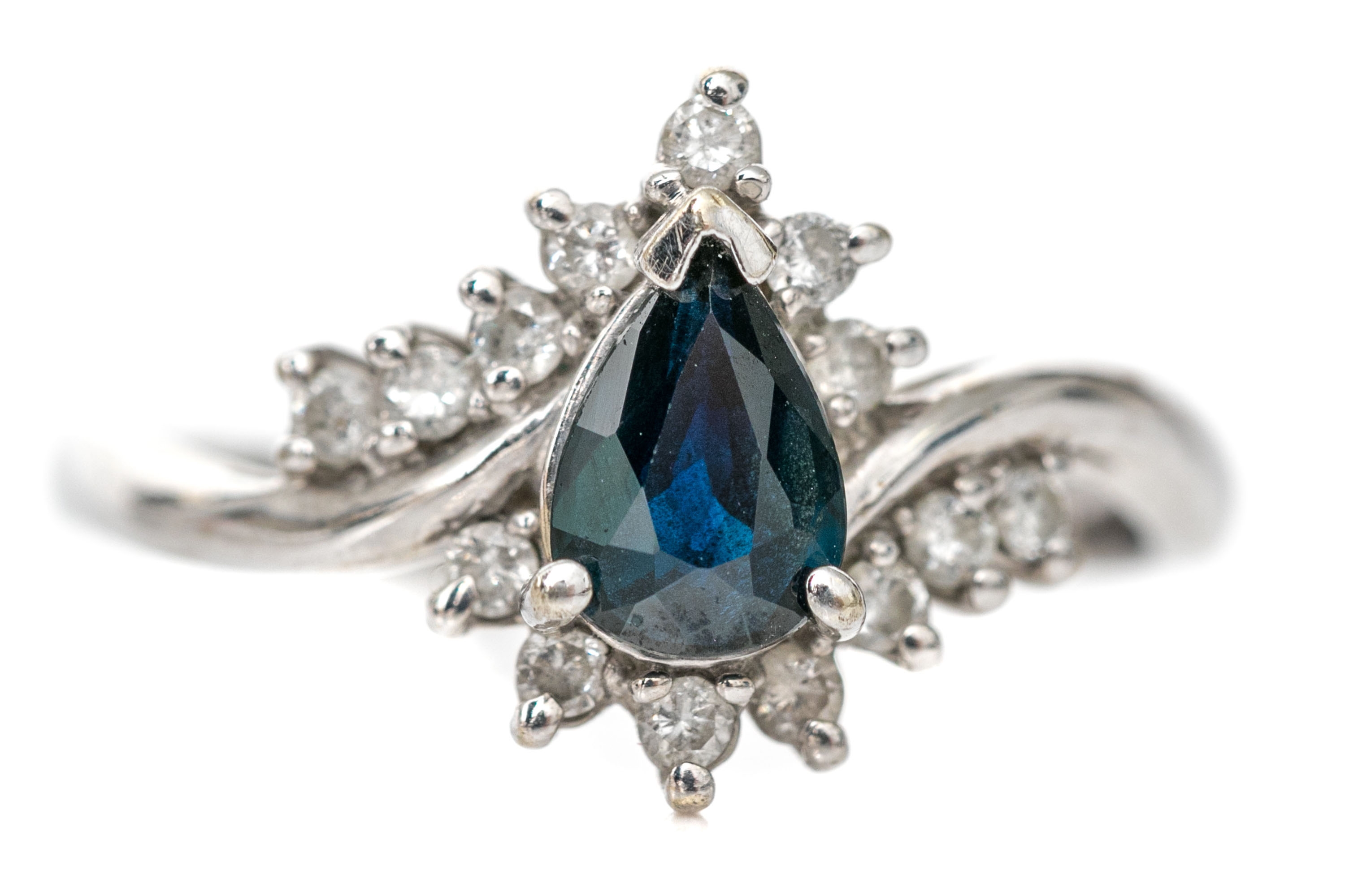 14k white gold sapphire and diamond bypass cluster ring, app. 0.14 TCW in diamonds, size 6.5