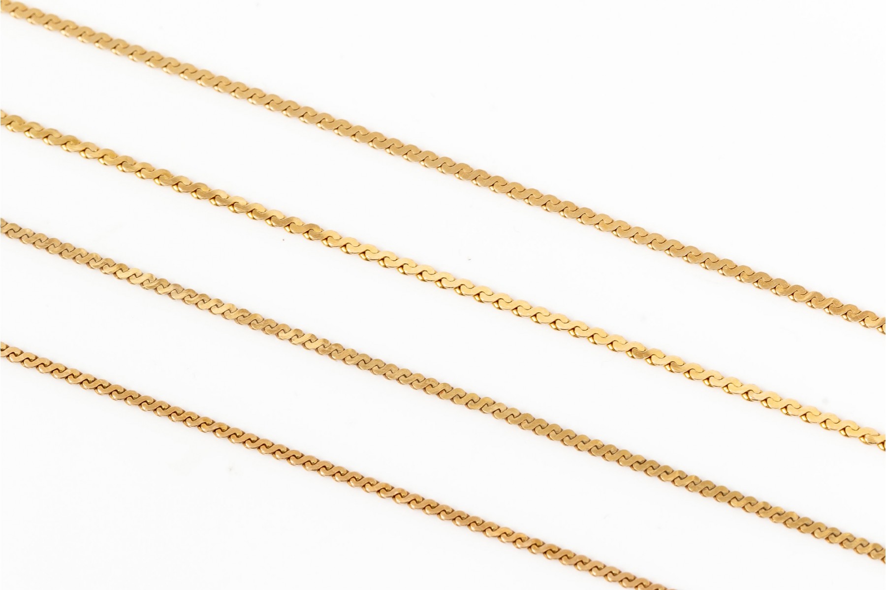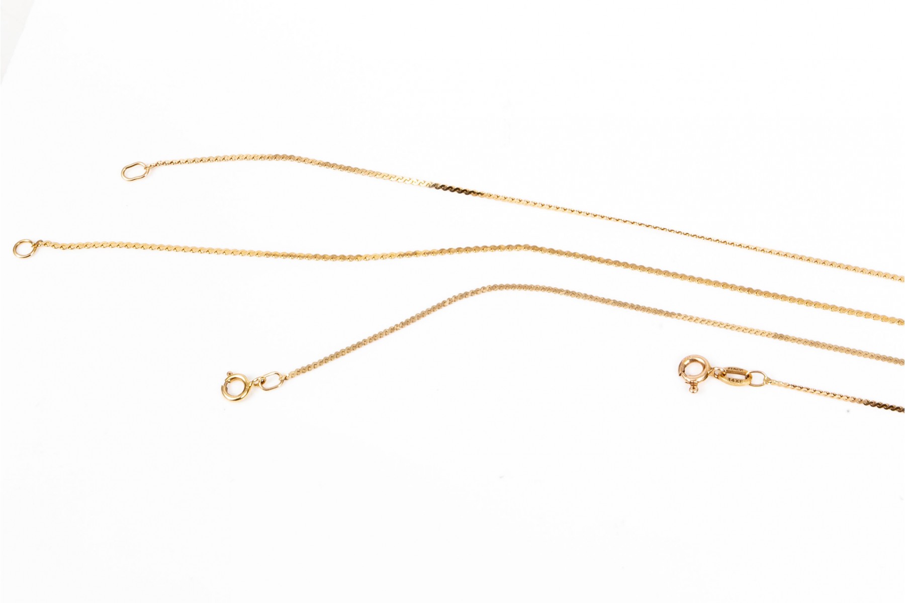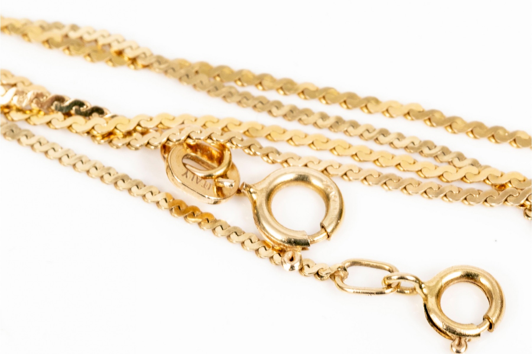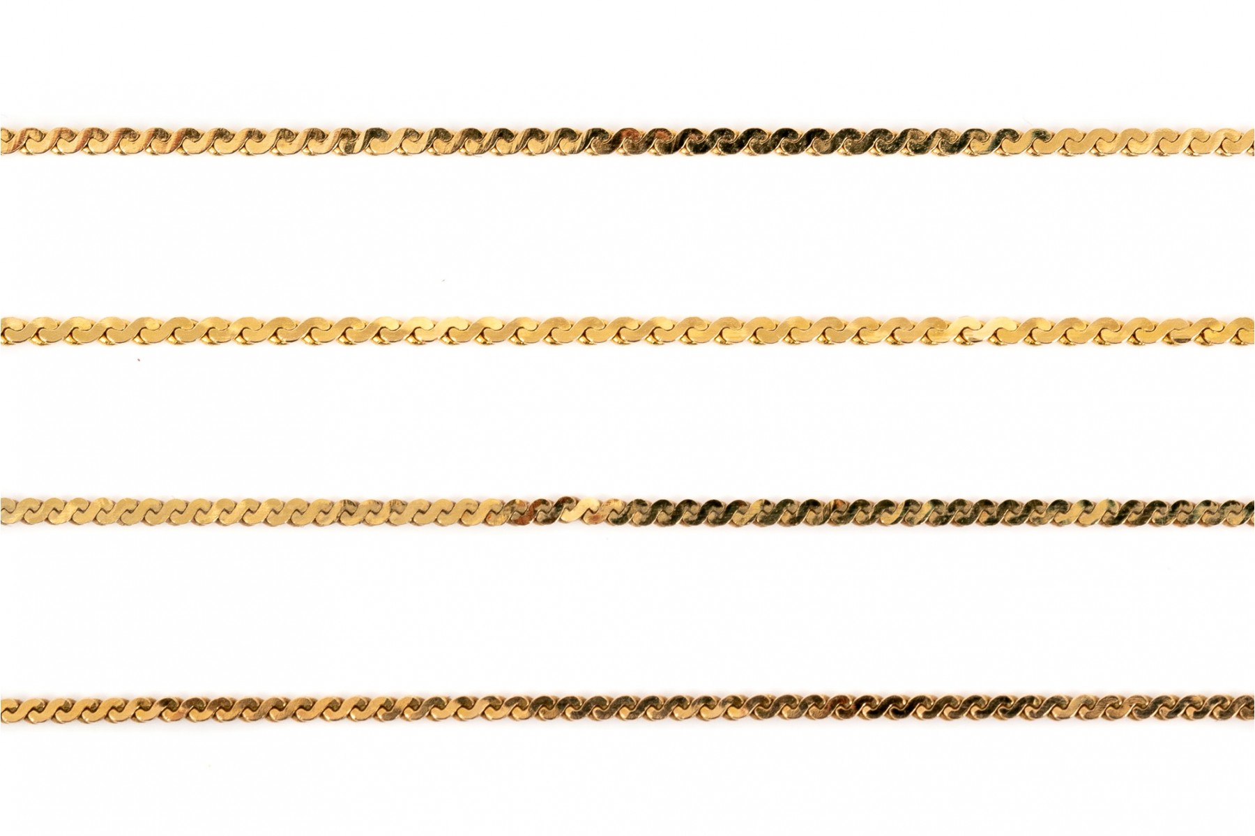 14K yellow gold necklaces and bracelet. Two serpentine chain necklaces and one bracelet with a slim delicate design. With the 14K necklaces and bracelet is a third fashion herringbone chain necklace. All secure with spring ring clasps.