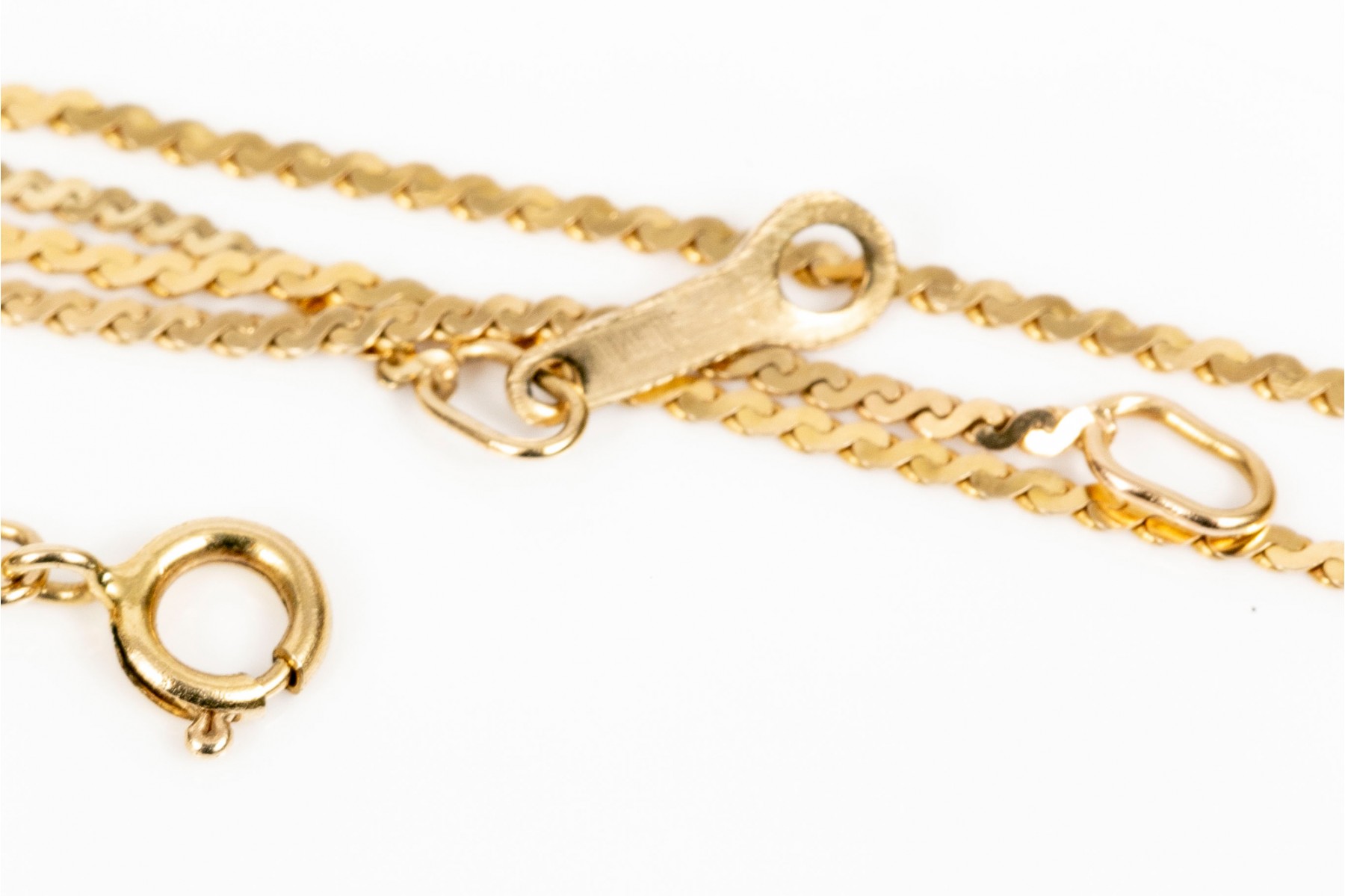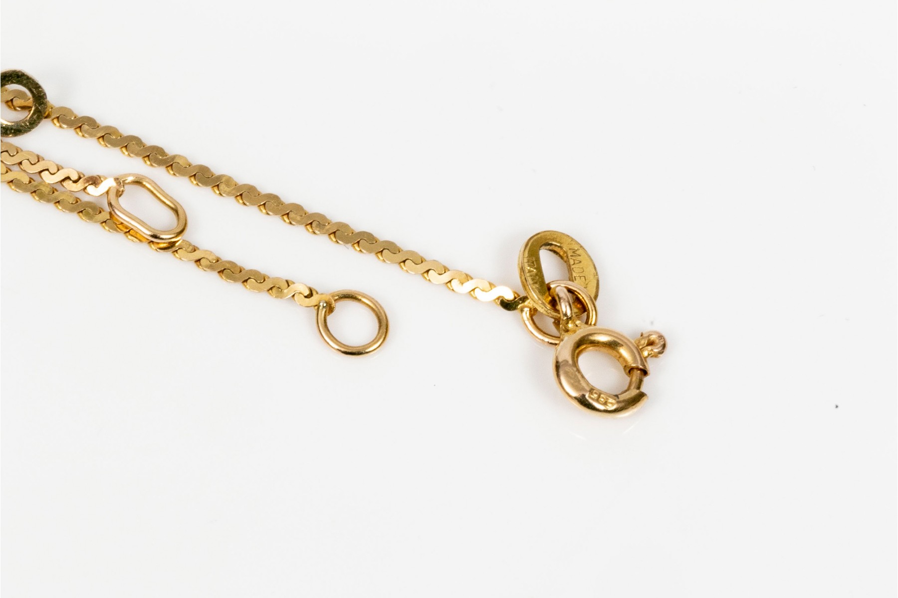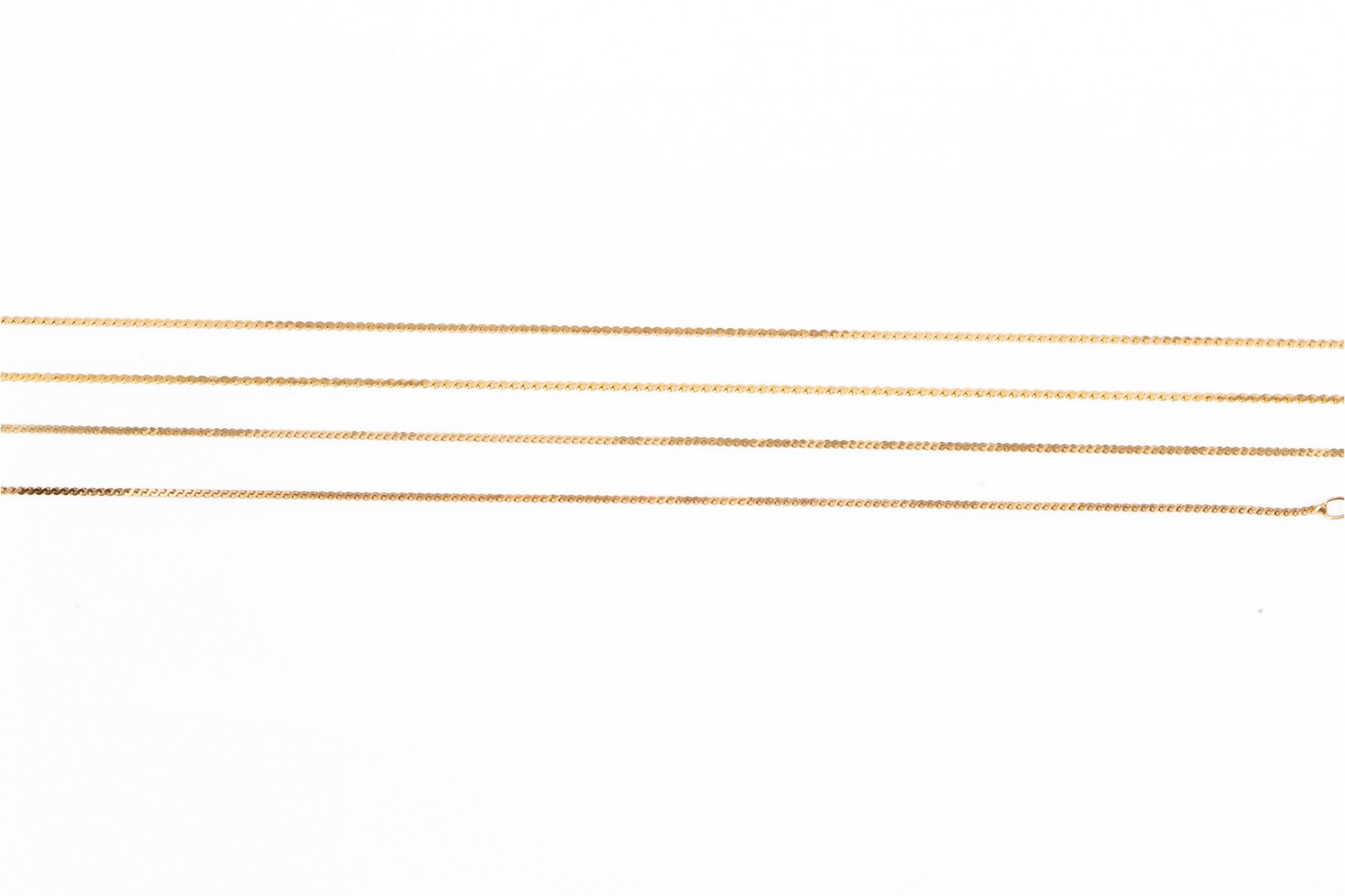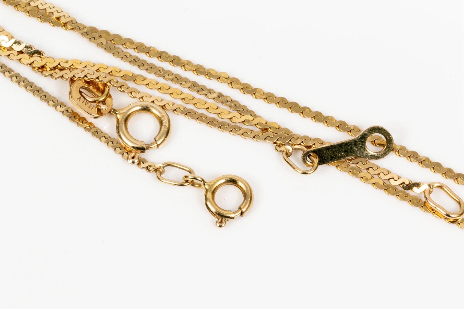 14K yellow gold necklaces and bracelet. Two serpentine chain necklaces and one bracelet with a slim delicate design. With the 14K necklaces and bracelet is a third fashion herringbone chain necklace. All secure with spring ring clasps.