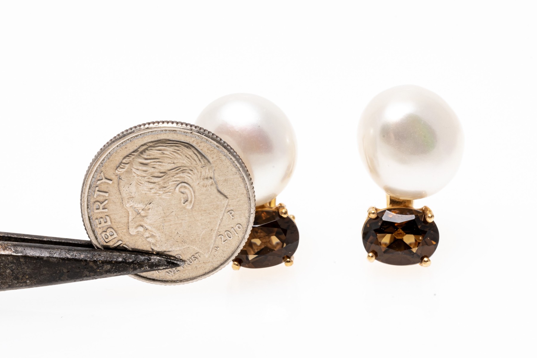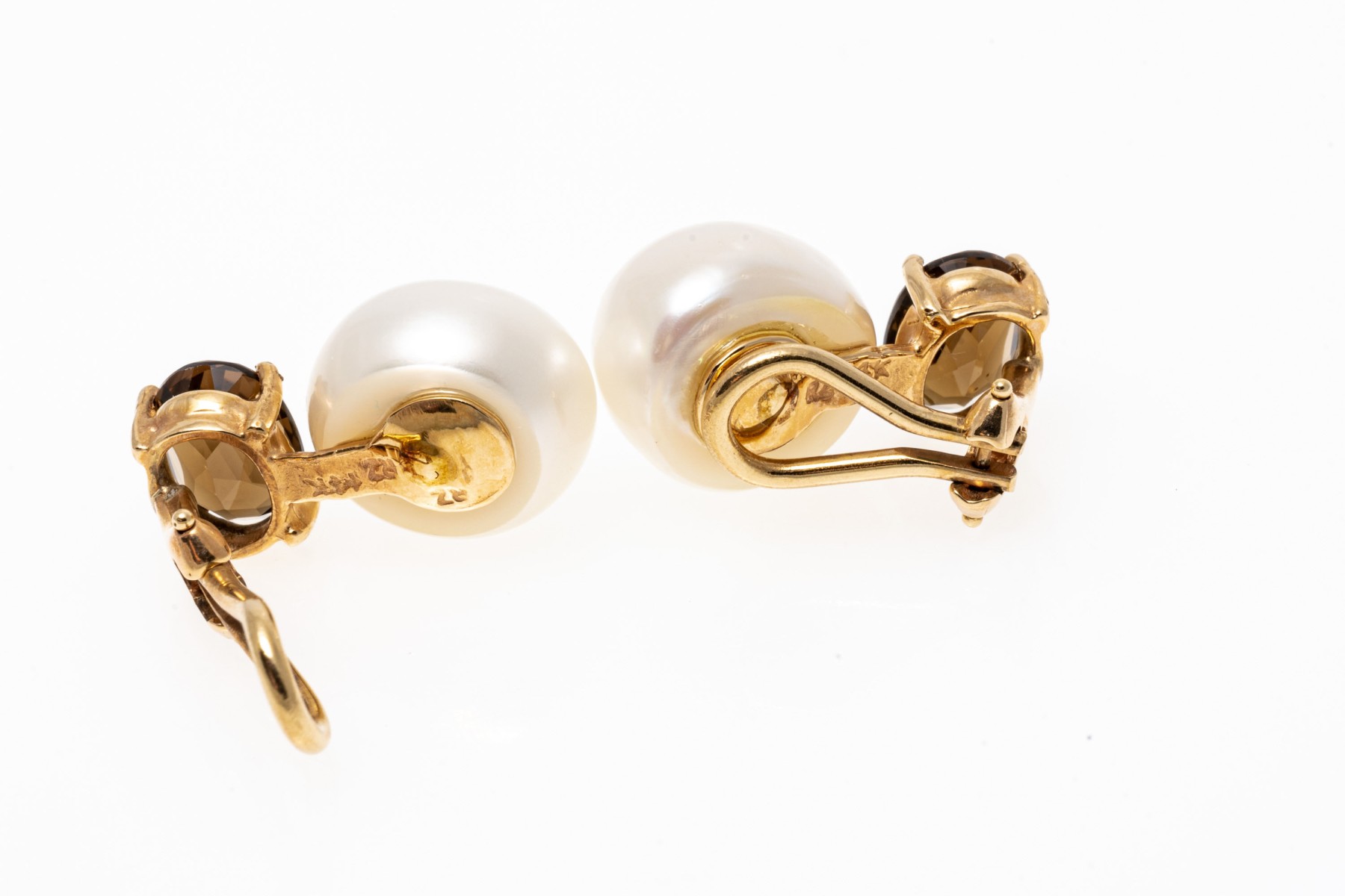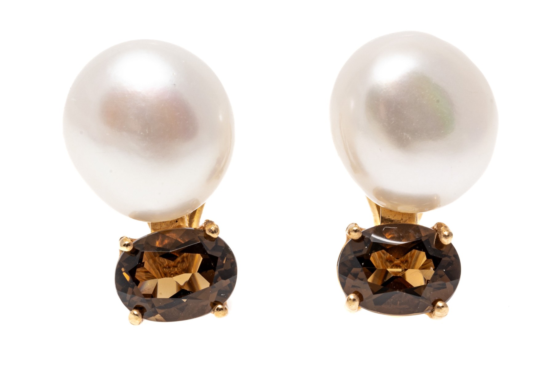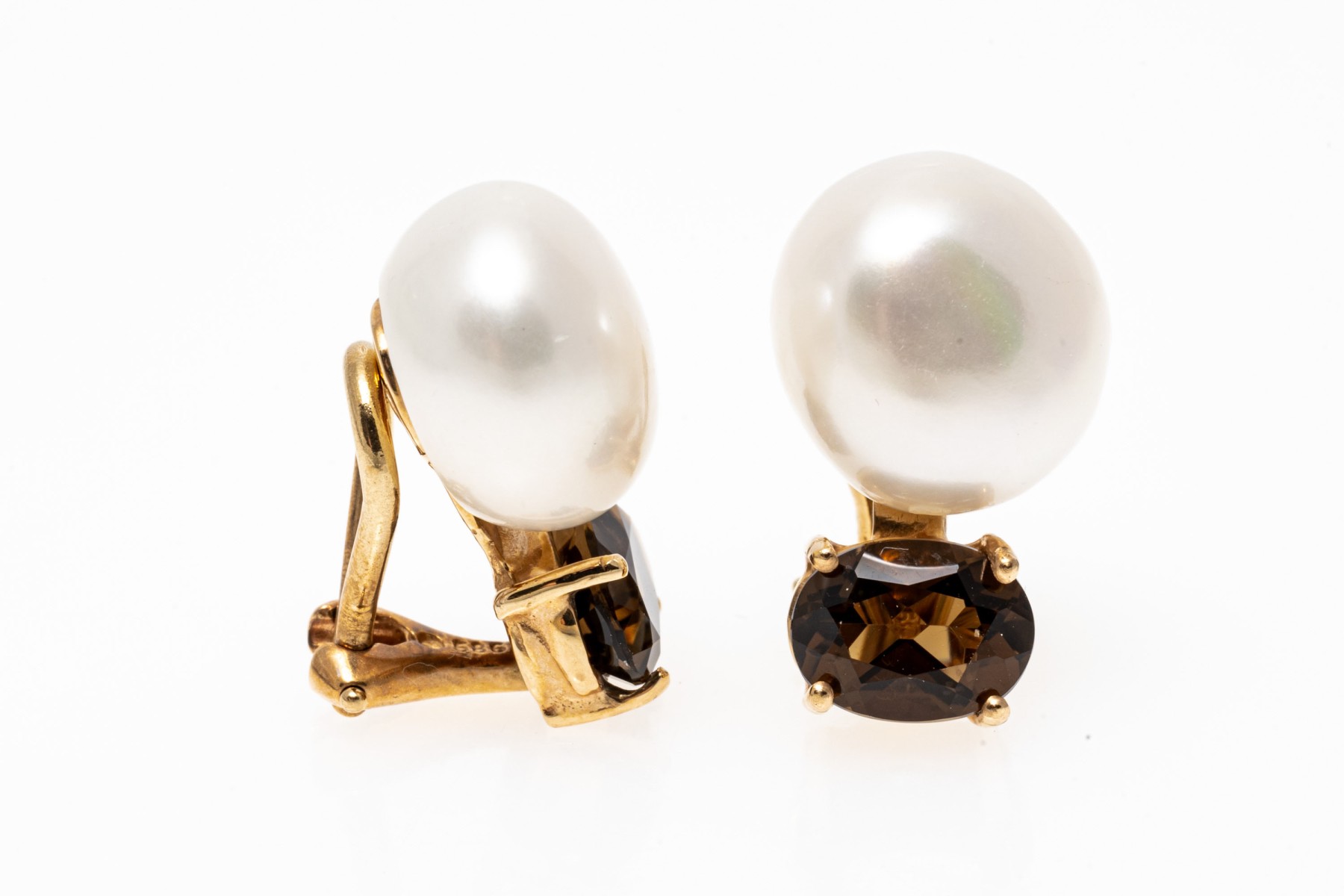 A pair of 14K yellow gold earrings. These earrings display large approximately 11.5mm cultured freshwater pearls. Below these are oval cut smoky quartz stones, approximately 2.28 TCW. Clip style backings.