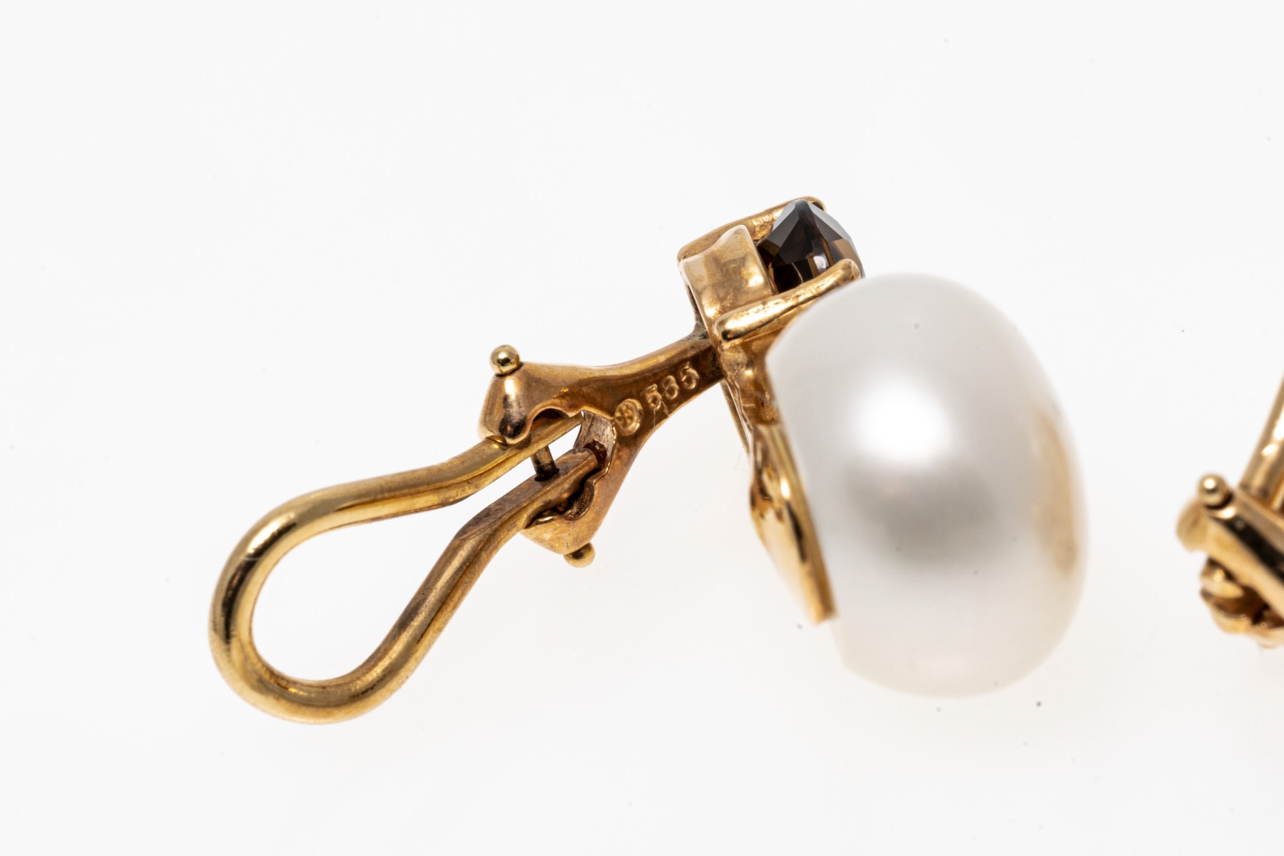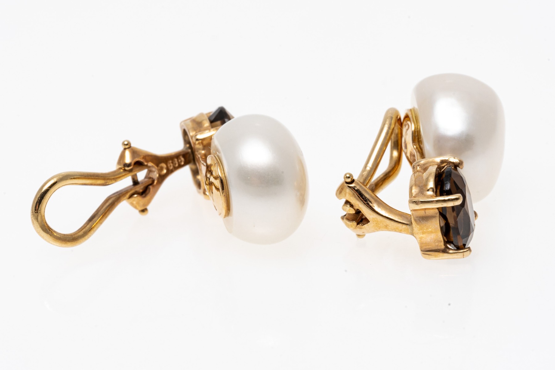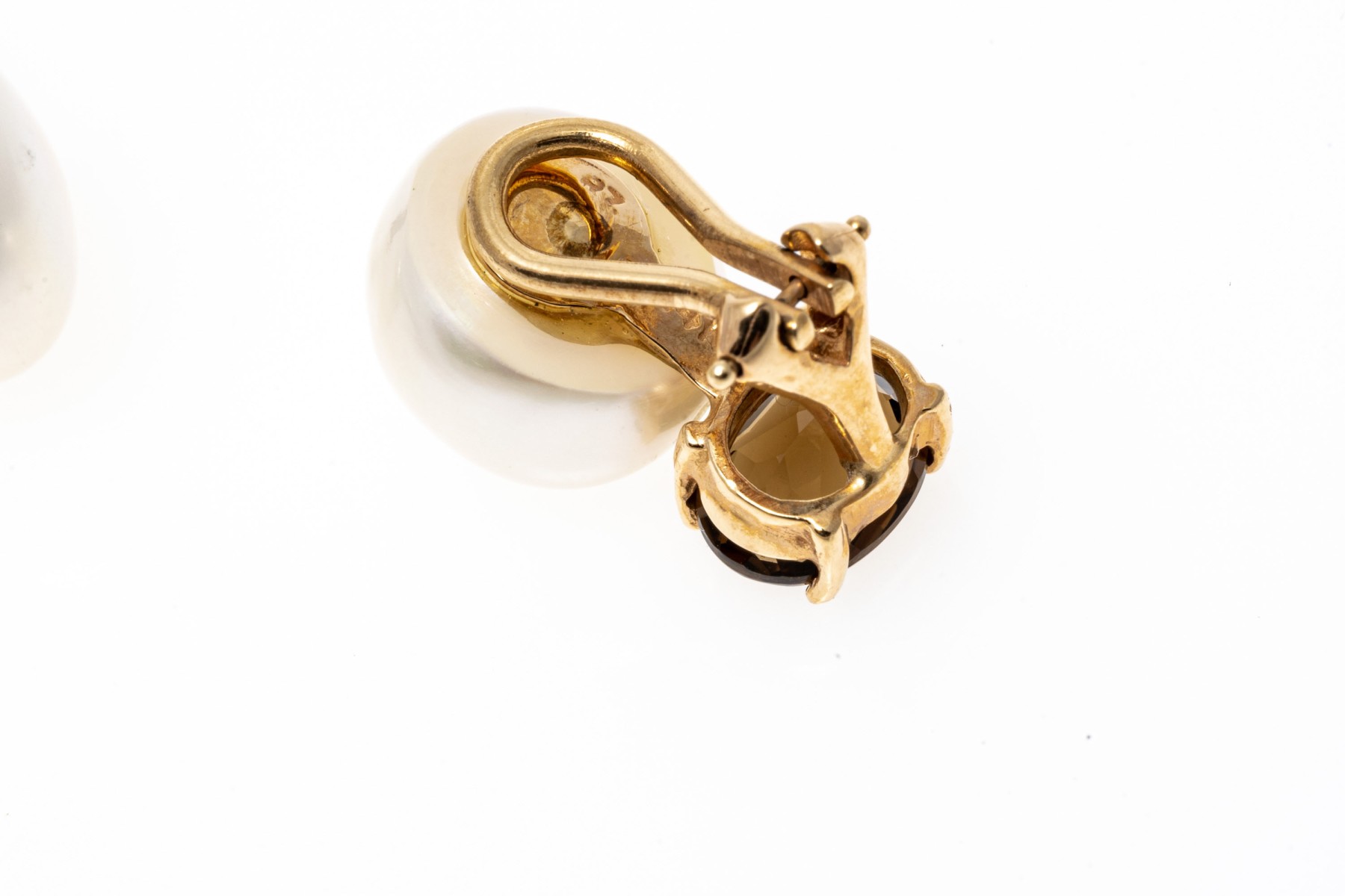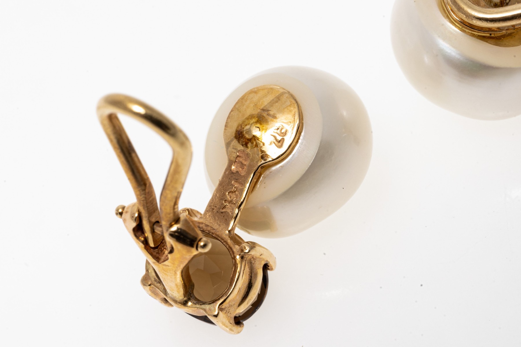 A pair of 14K yellow gold earrings. These earrings display large approximately 11.5mm cultured freshwater pearls. Below these are oval cut smoky quartz stones, approximately 2.28 TCW. Clip style backings.