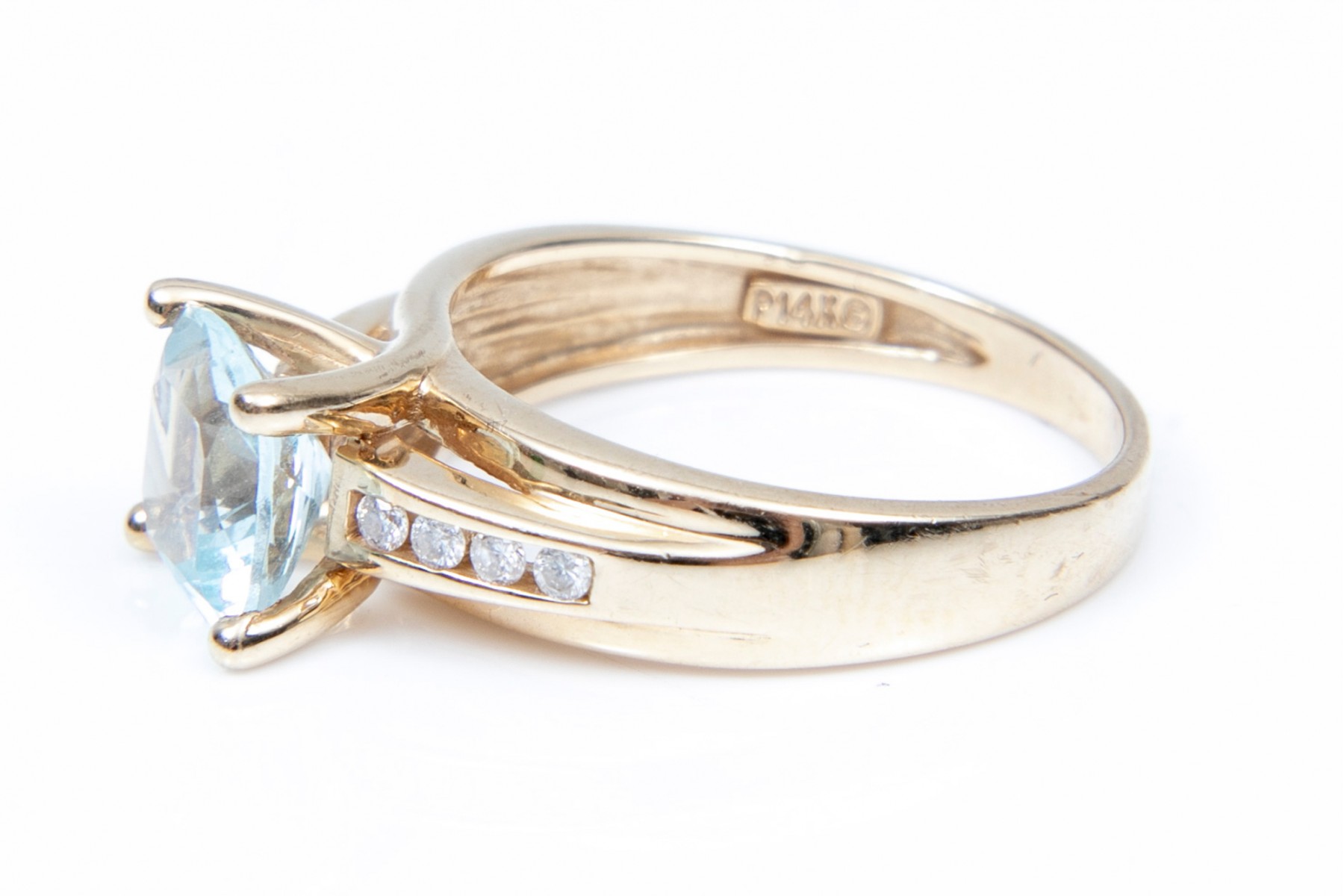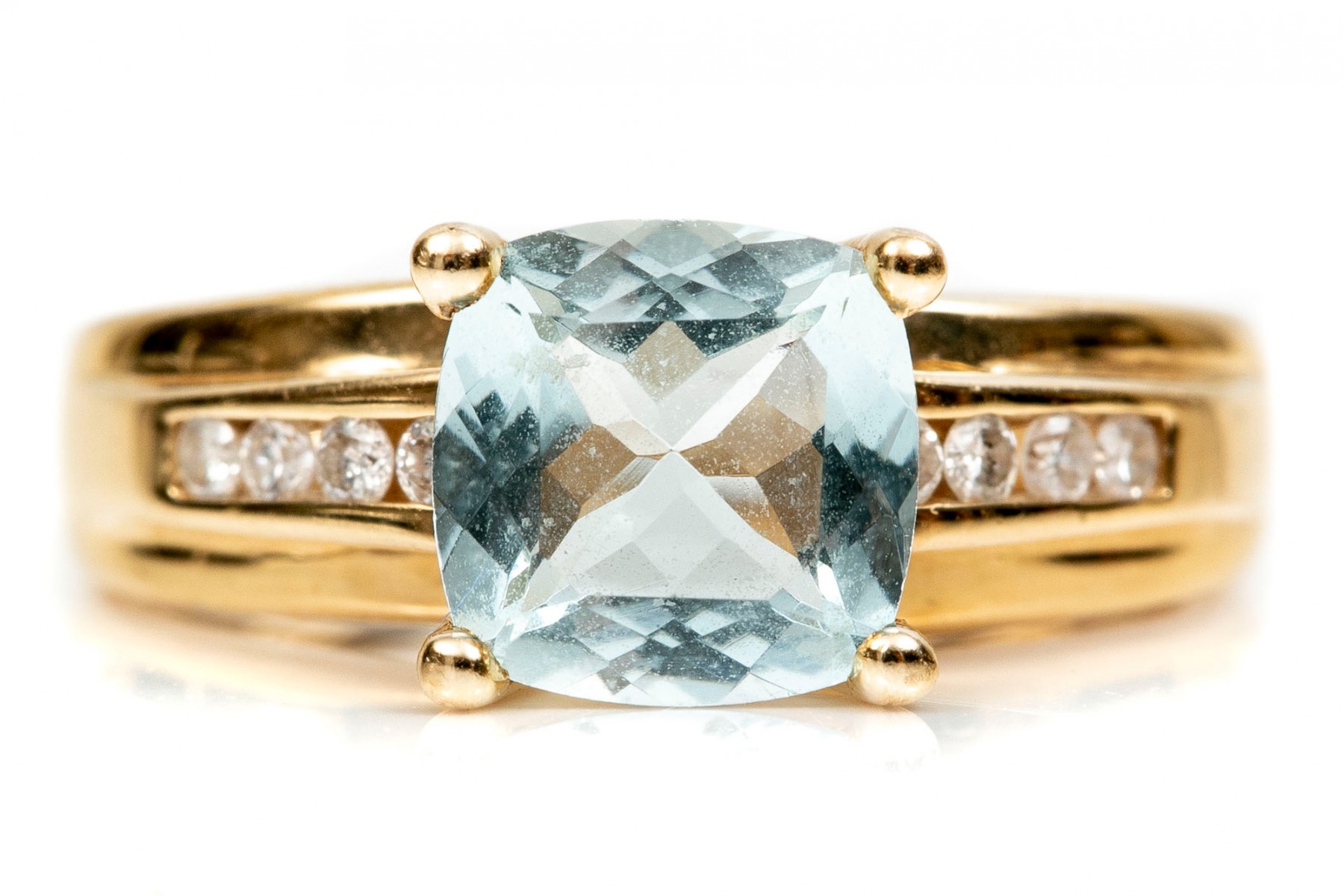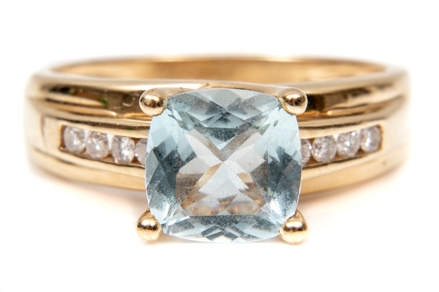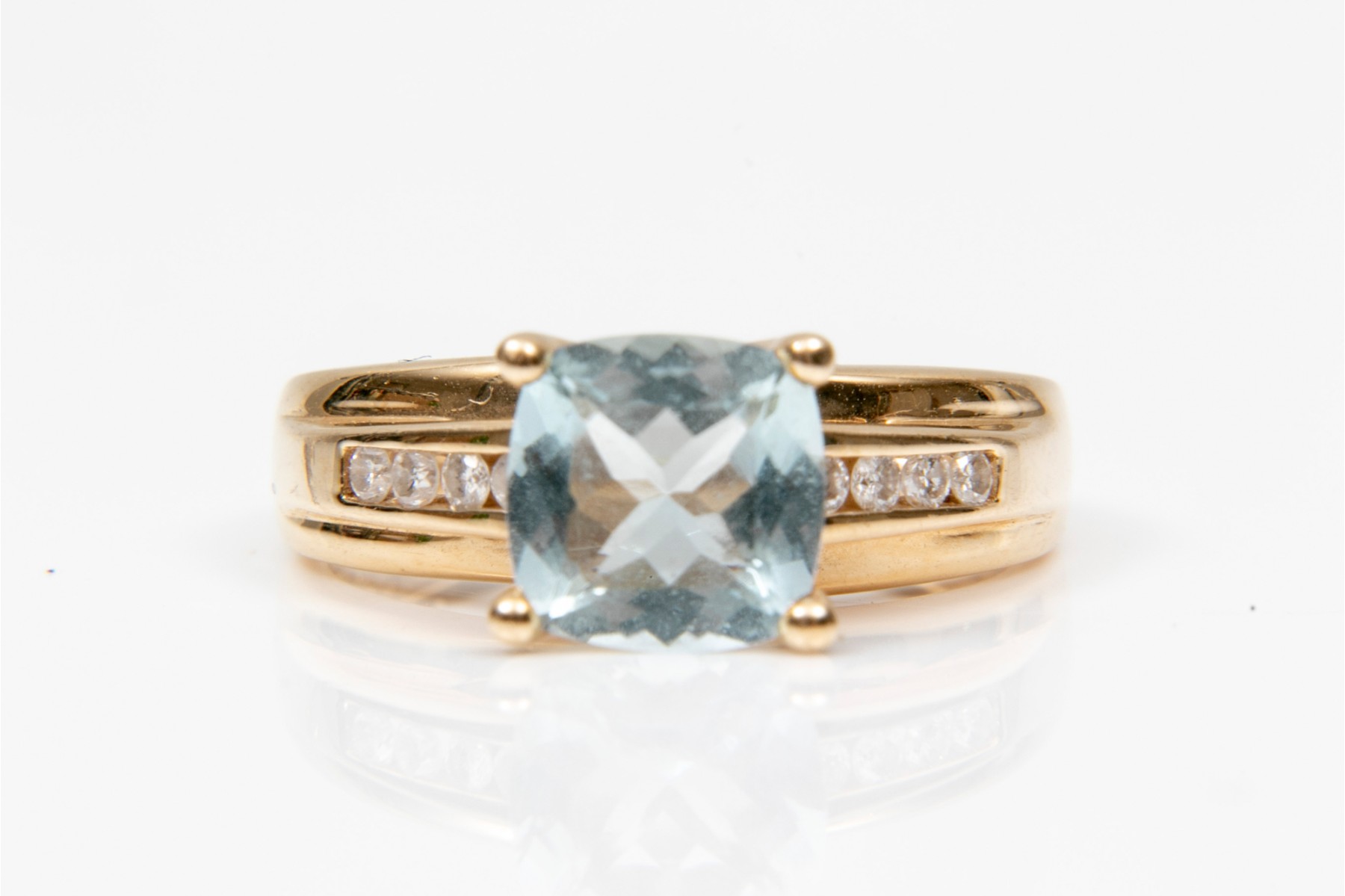 This stunning 14K yellow gold ring is set with a single square cushion cut aquamarine stone. Channel set into each of the ring shanks are three round brilliant diamonds. The aquamarine is approximately 0.83 cts., and the diamonds approximately 0.16 TCW. Ring size 5.25.