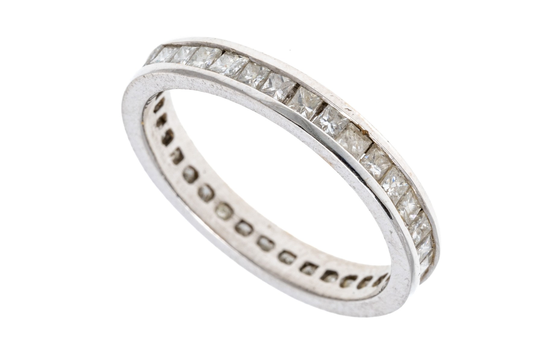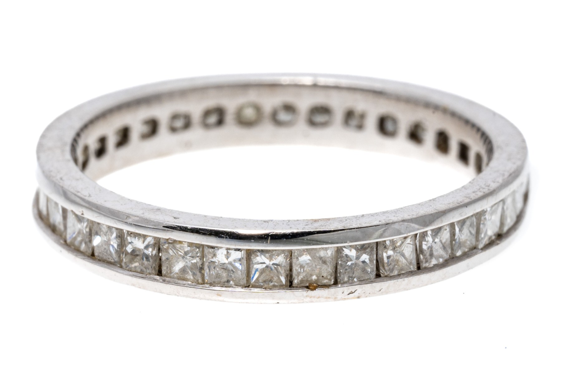 14k white gold stunning princess cut diamond eternity band, approximately 1.05 TCW, size 4.75. Please note, the ring cannot be sized
