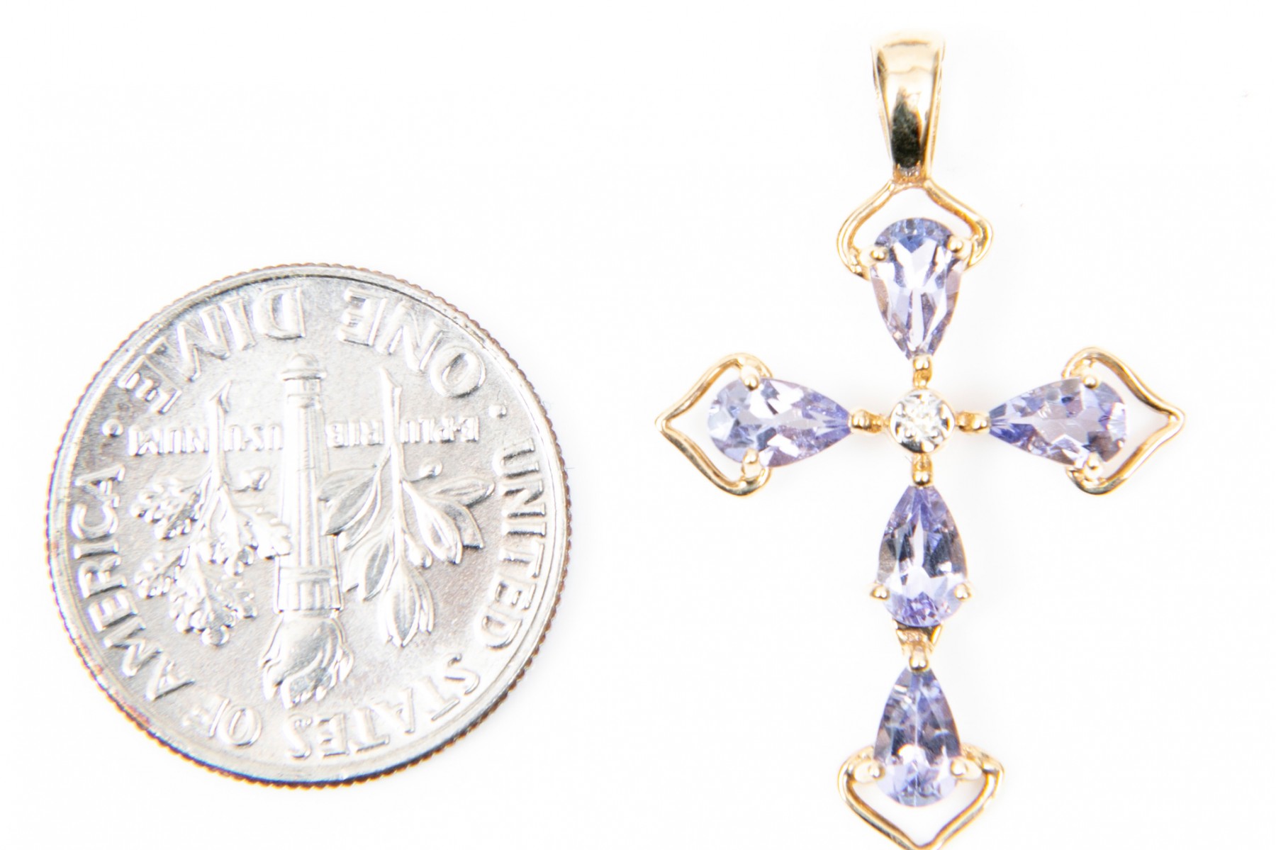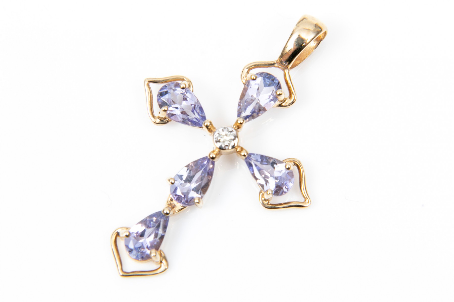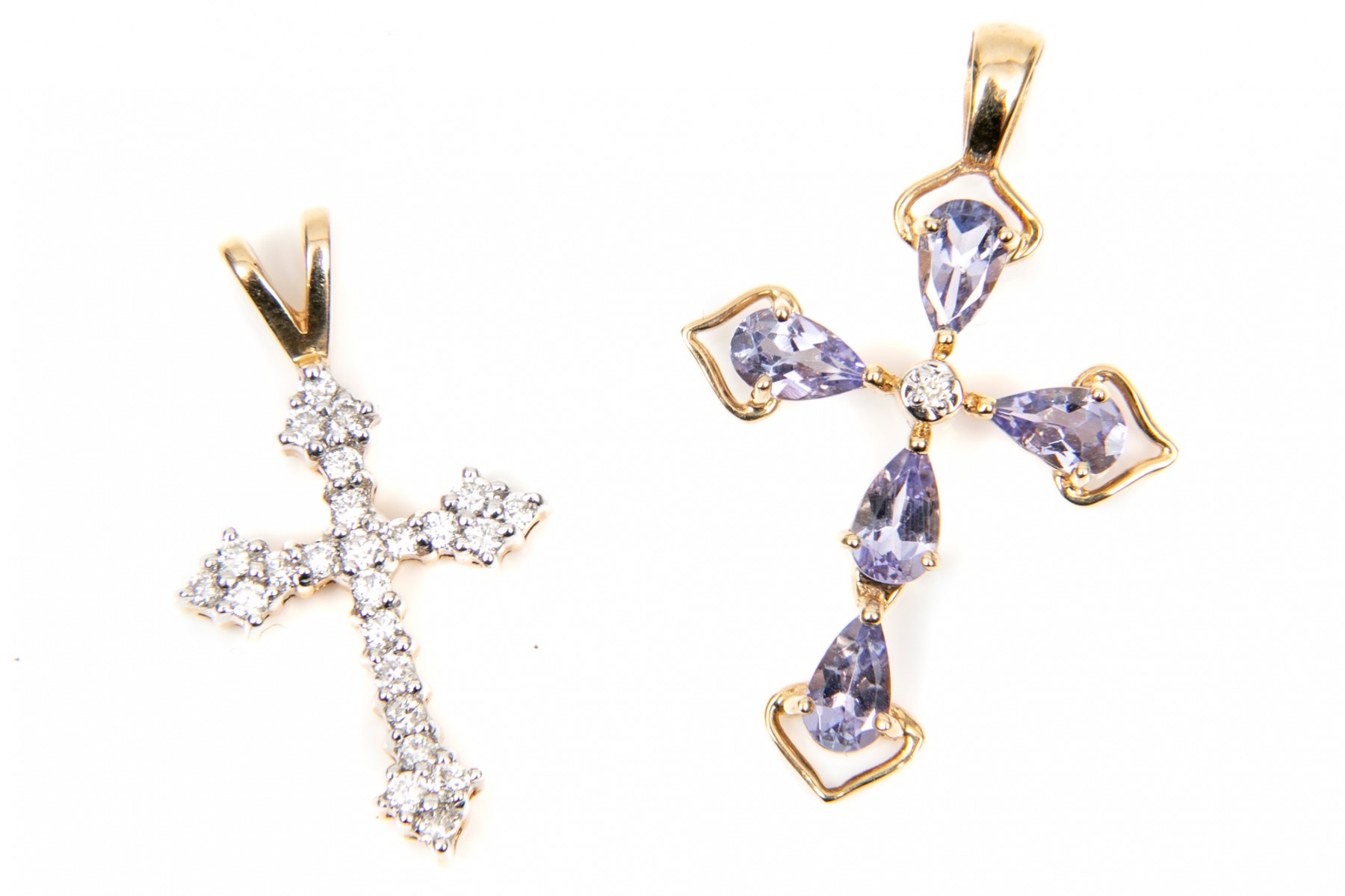 Two 14K yellow gold cross pendants. Set into the first pendant are pear cut tanzanites, approximately 0.8 TCW, while a single accent diamond at the center. The second pendant is set rows of round brilliant cut diamonds, approximately 0.21 TCW.