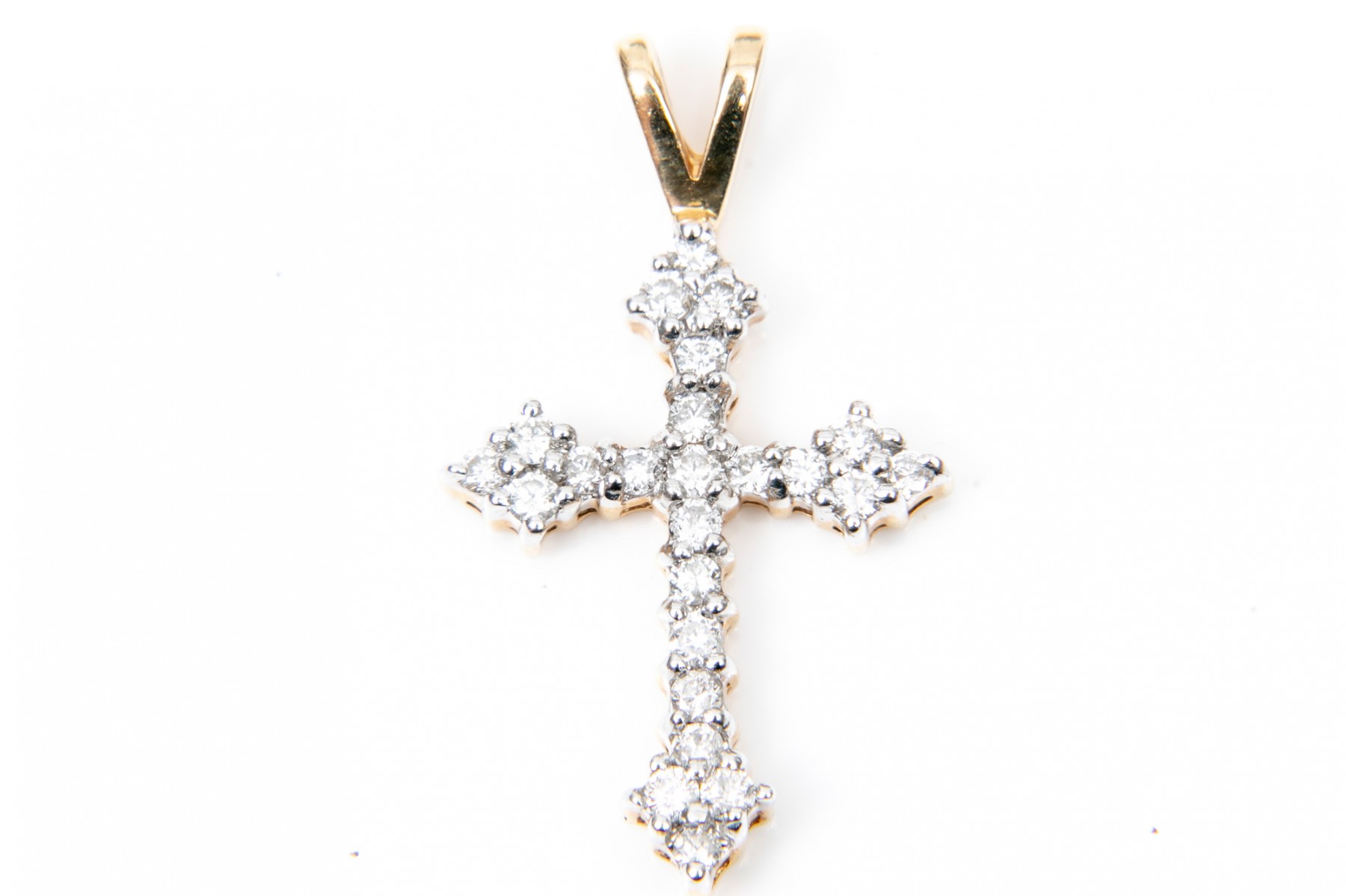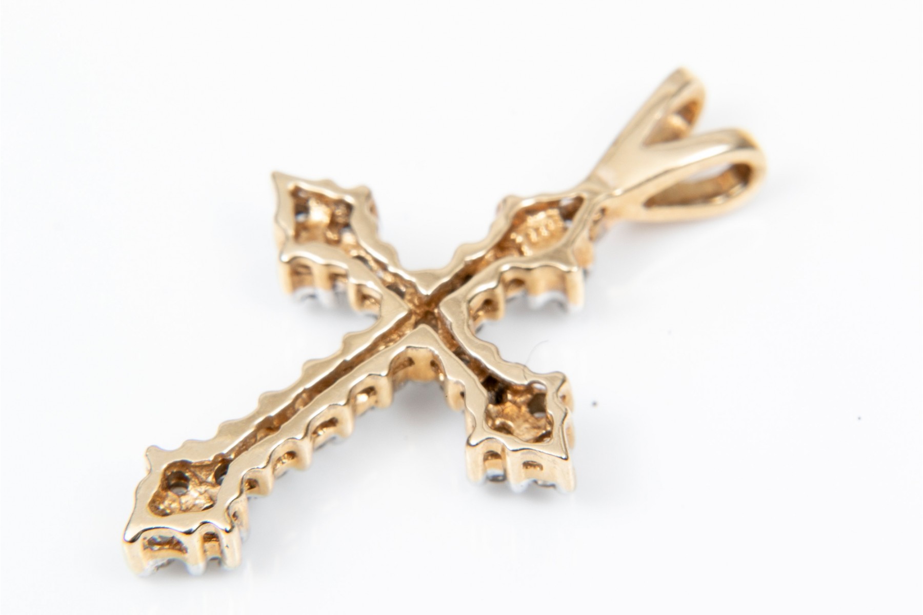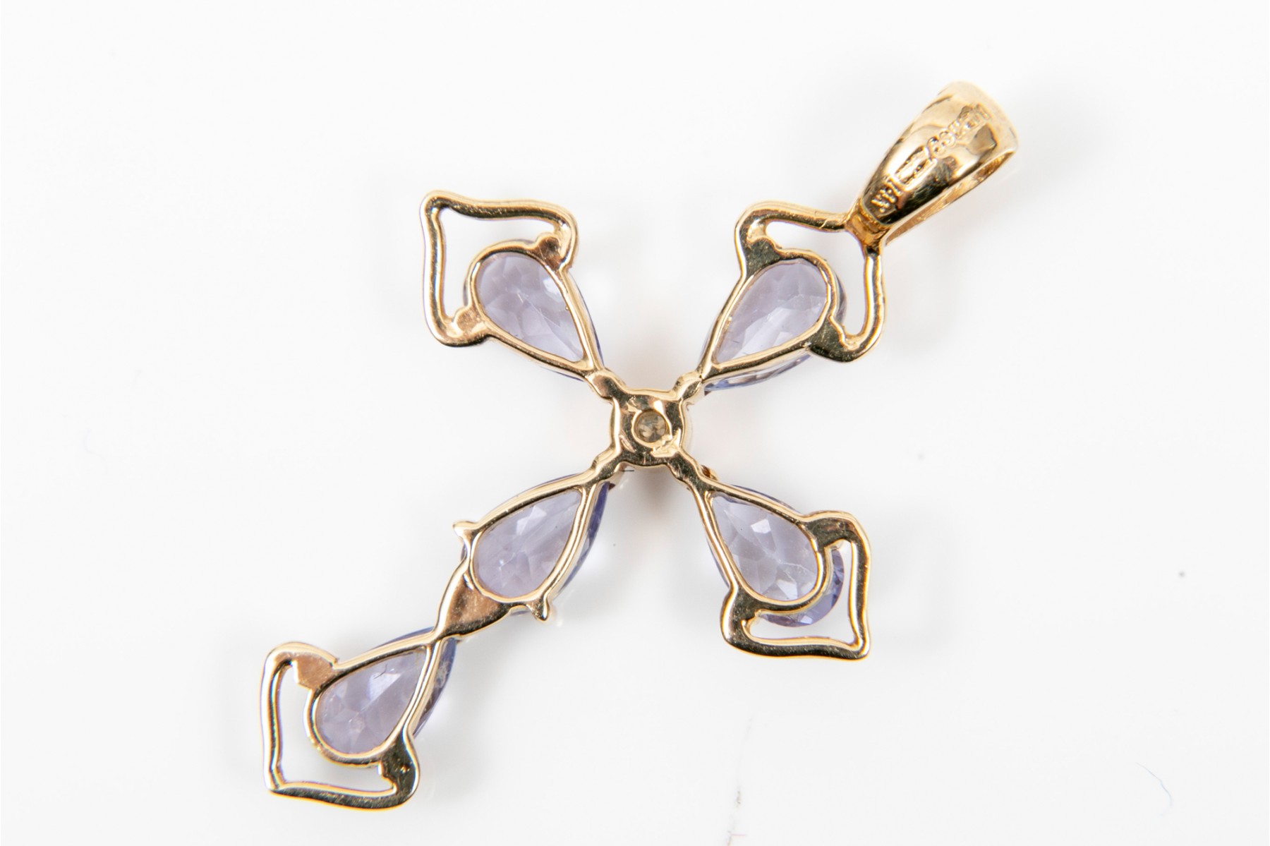 Two 14K yellow gold cross pendants. Set into the first pendant are pear cut tanzanites, approximately 0.8 TCW, while a single accent diamond at the center. The second pendant is set rows of round brilliant cut diamonds, approximately 0.21 TCW.