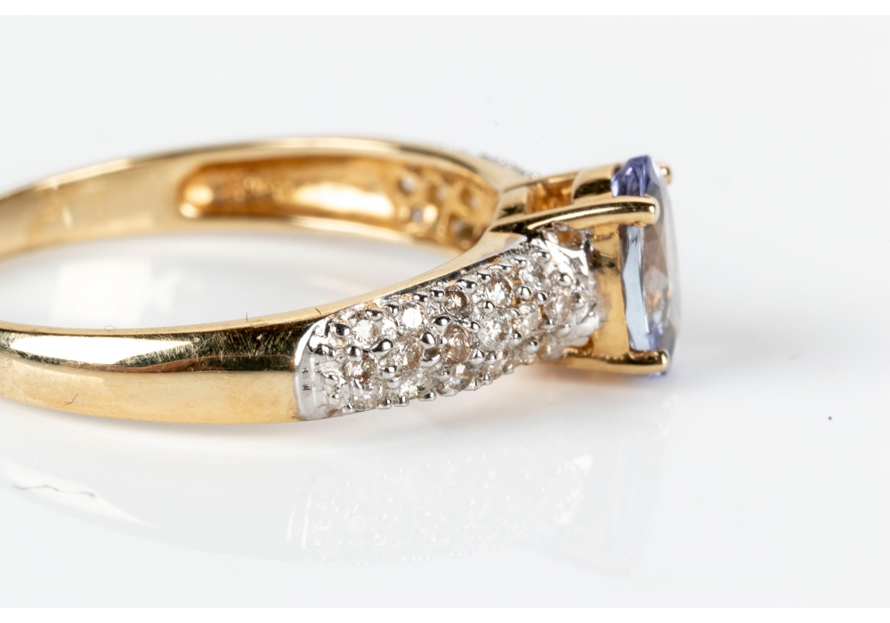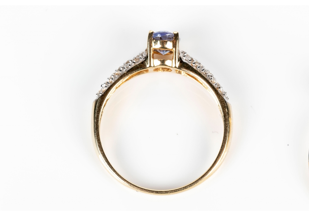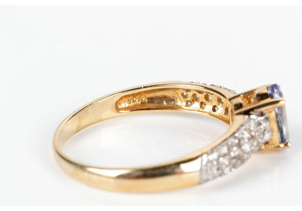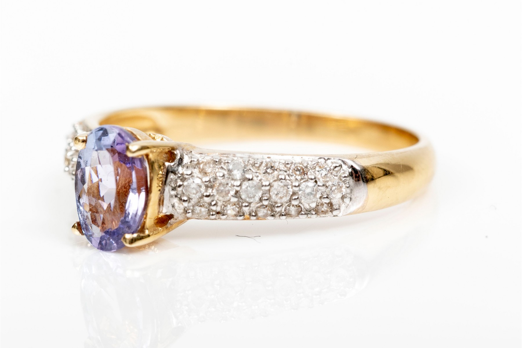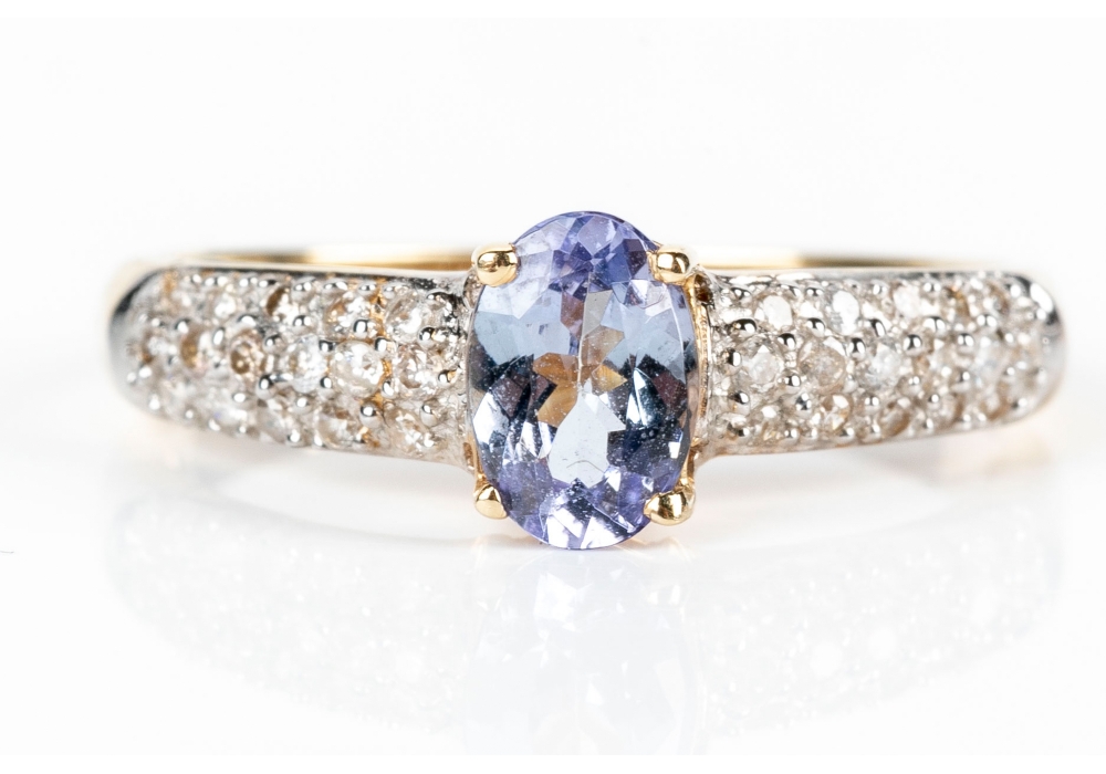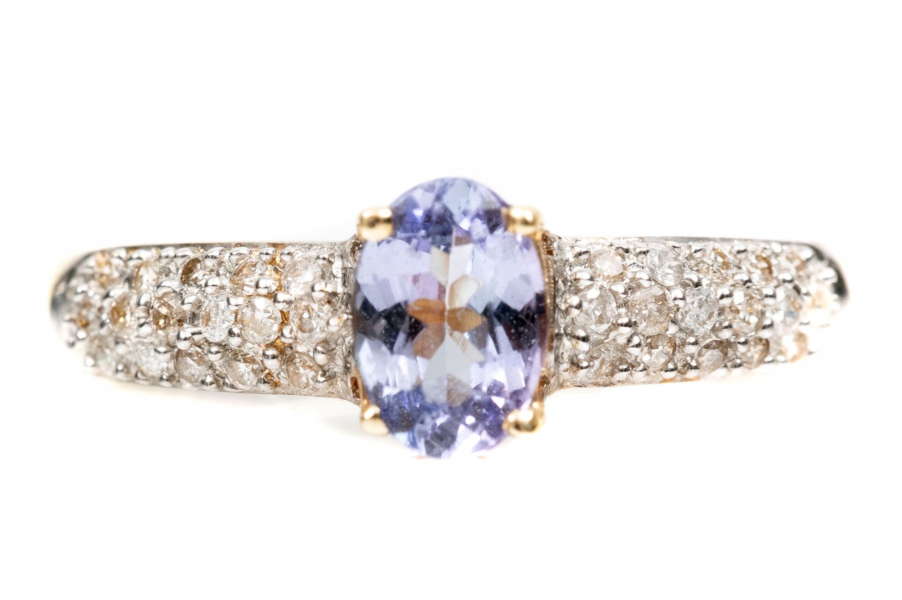 The ring is set with a single oval cut tanzanite, approximately 0.48 cts, flanked by pave diamond set shanks, approximately 0.16 TCW. Ring size 6.