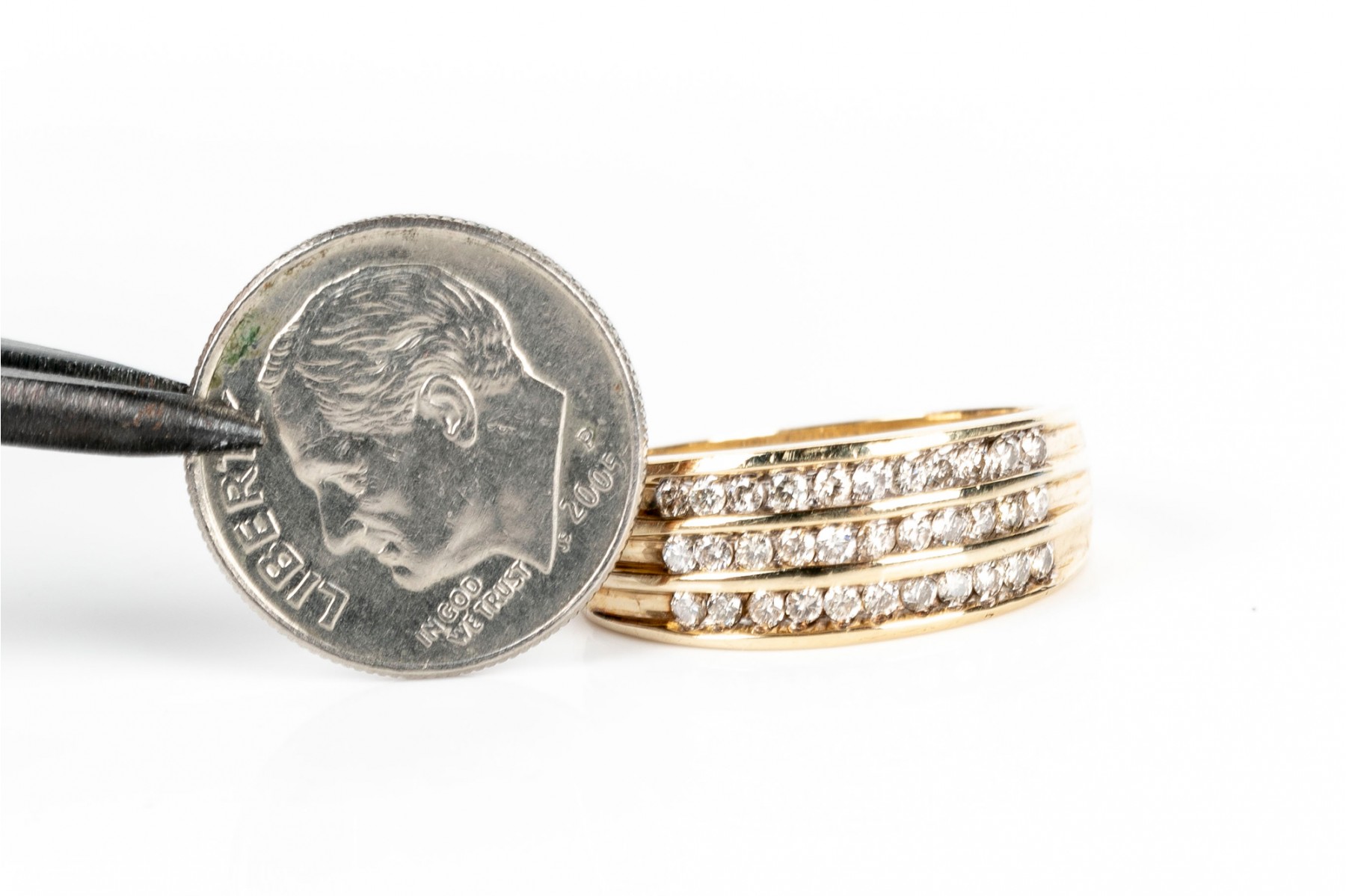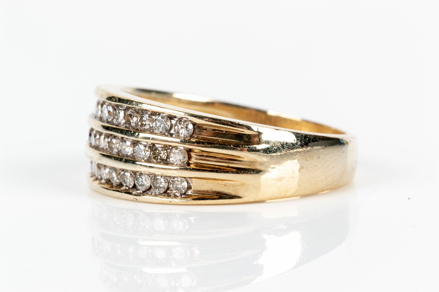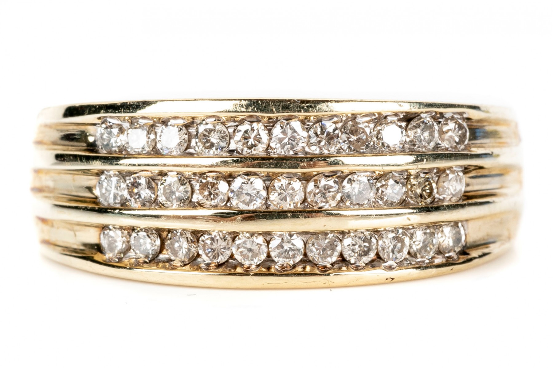 A 10K yellow gold polished ring. Three rows of round faceted channels set diamonds trail over the face of the ring. The diamonds are approximately 0.52 TCW. Ring size 7.25-.