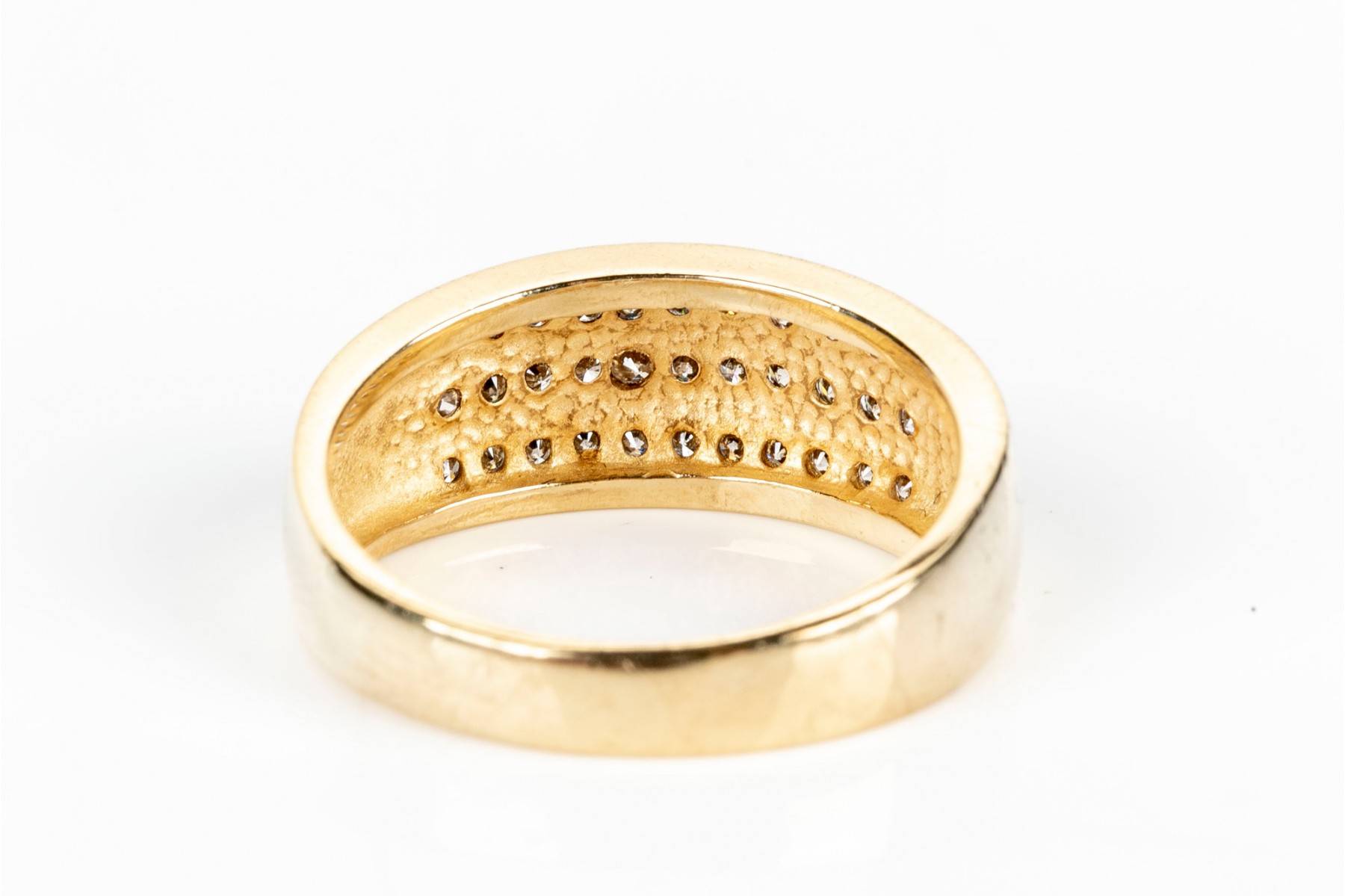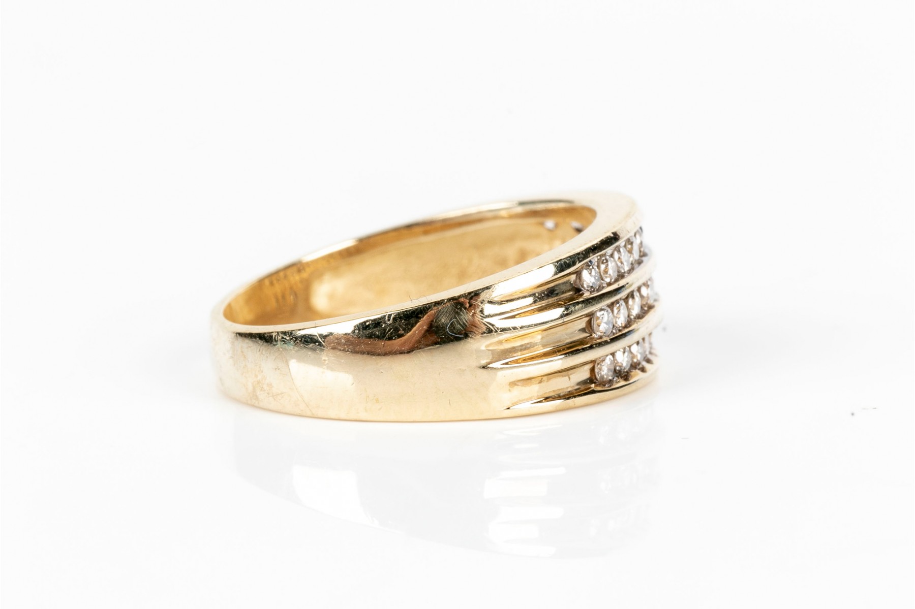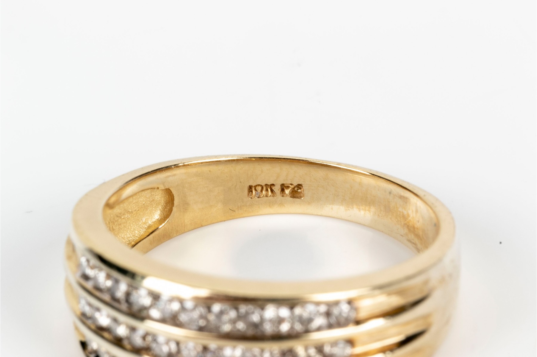 A 10K yellow gold polished ring. Three rows of round faceted channels set diamonds trail over the face of the ring. The diamonds are approximately 0.52 TCW. Ring size 7.25-.