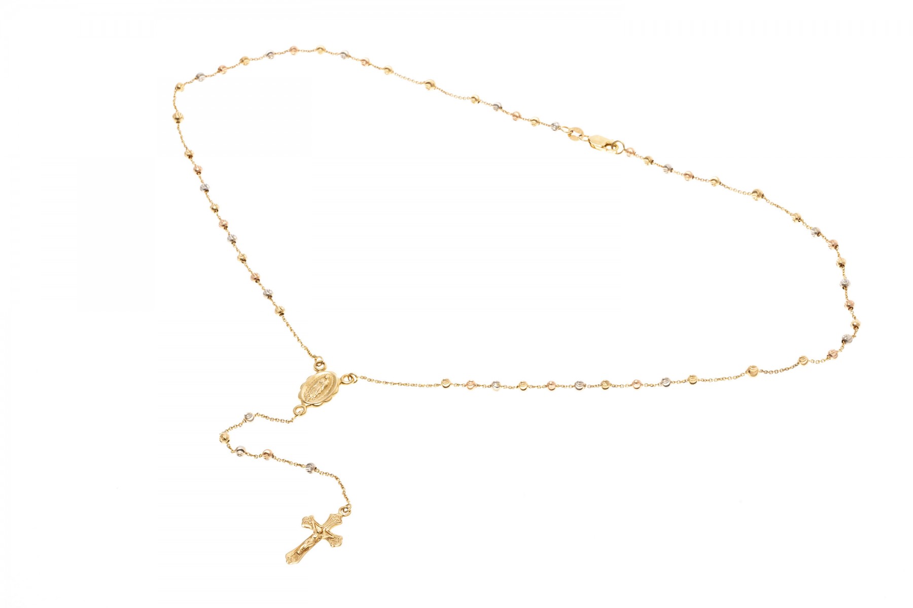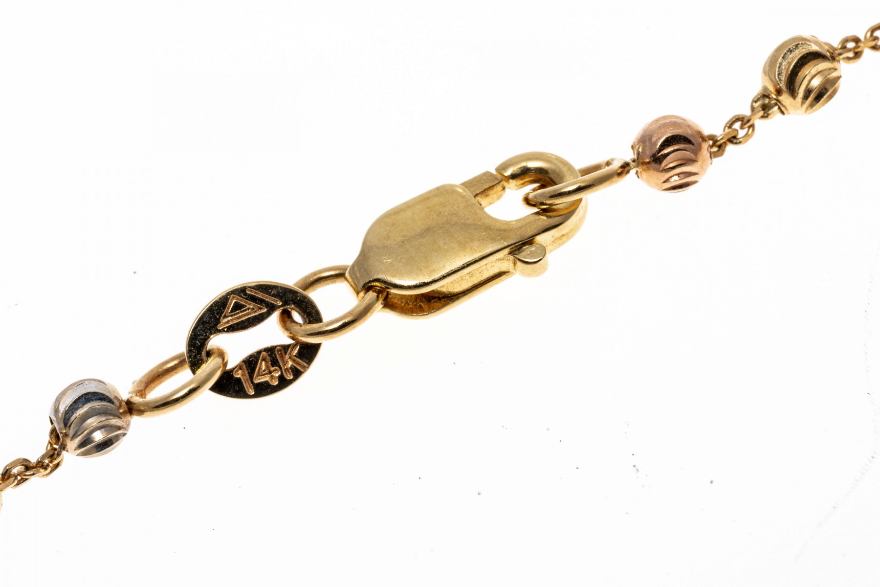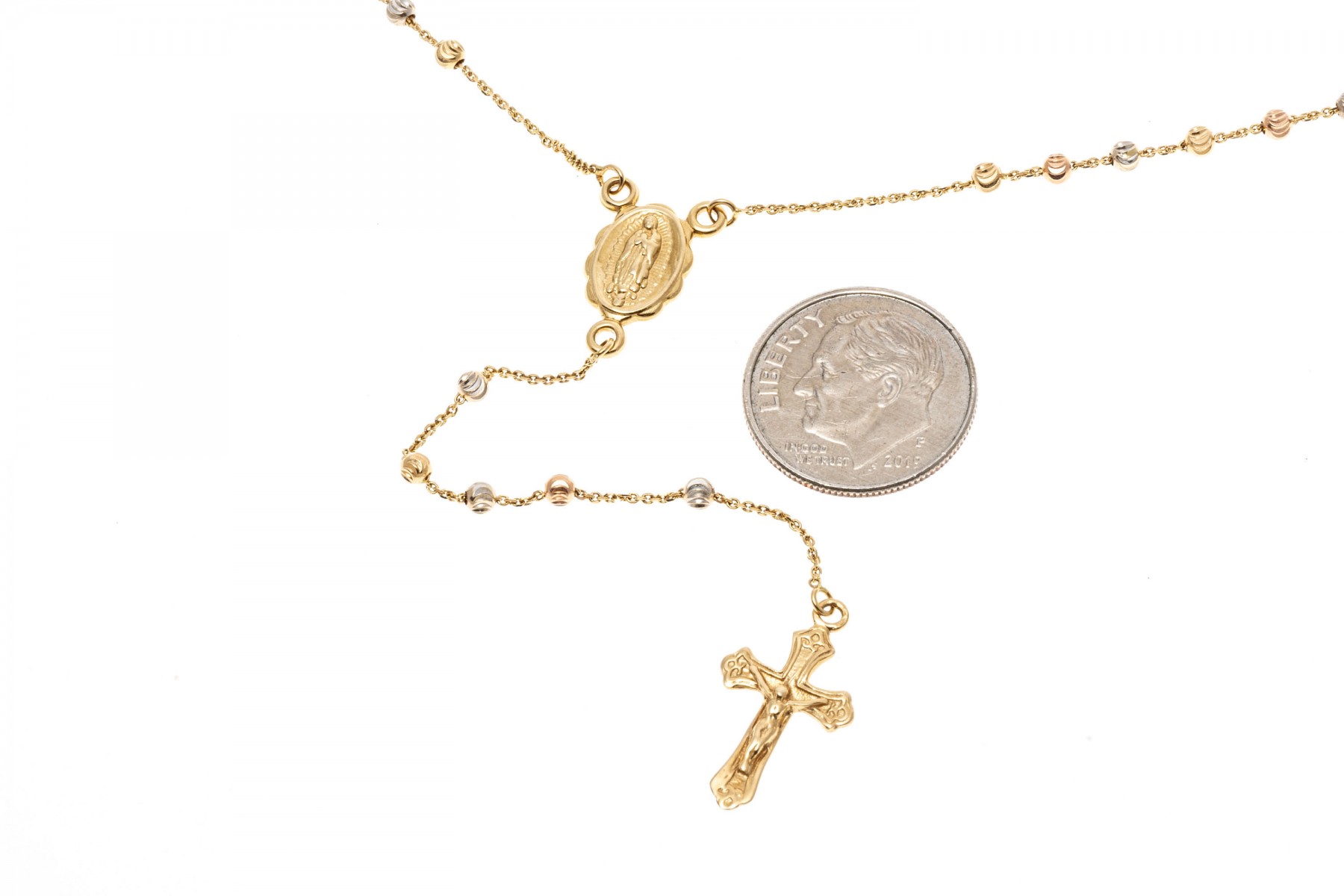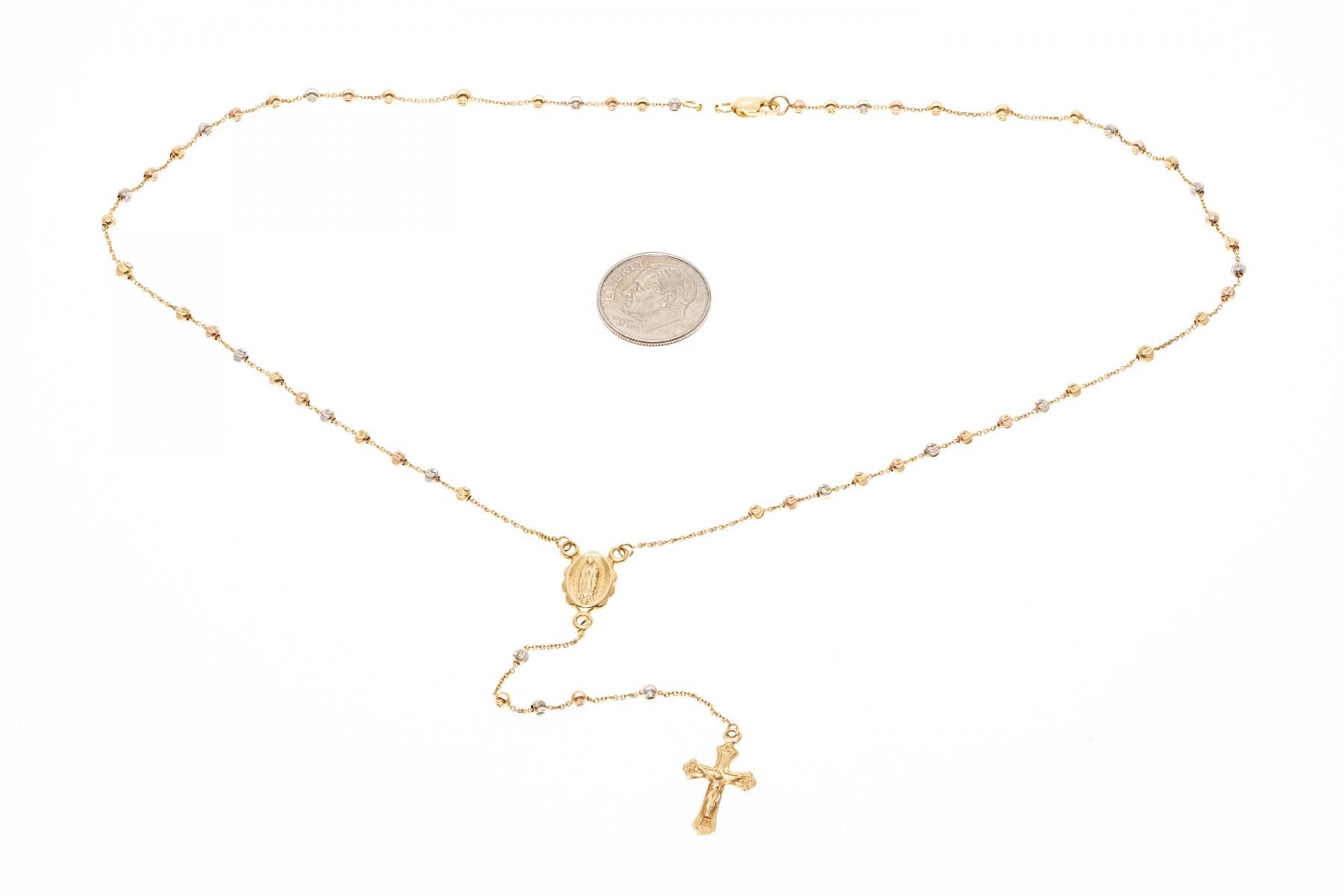 14K yellow gold cross drop necklace. Set along the chain are stationed diamond cut beads in white, yellow and rose gold. A drop suspends from the necklace and ends in a cross pendant. Lobster claw clasp.