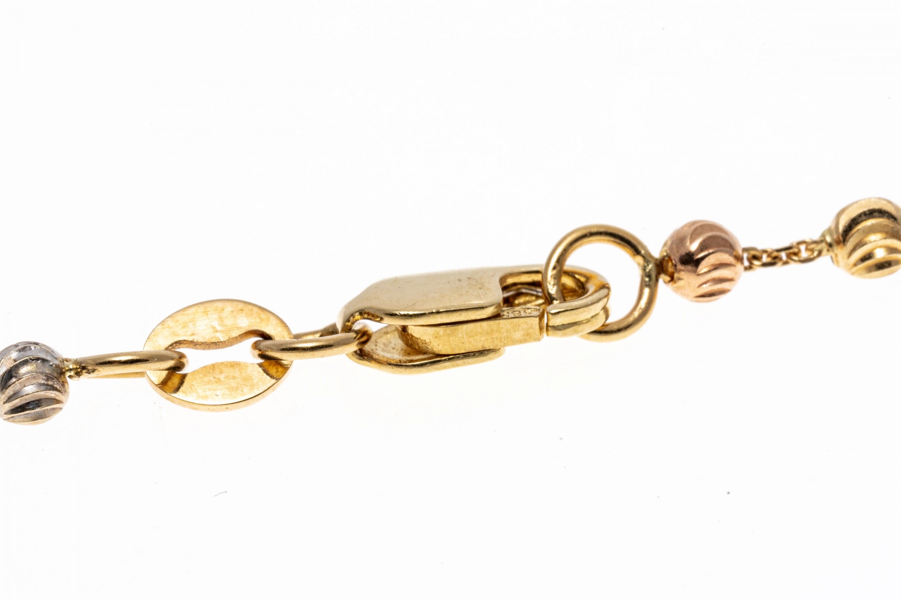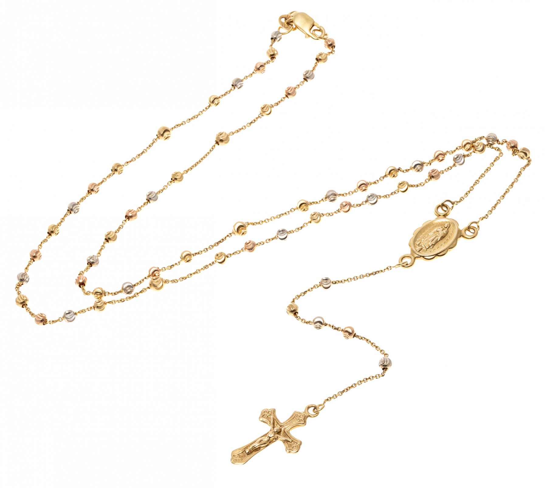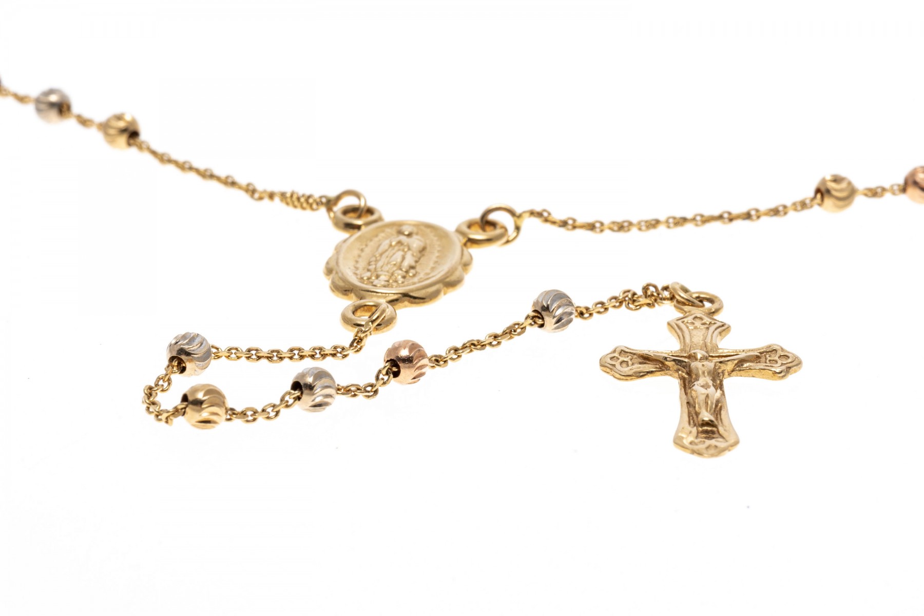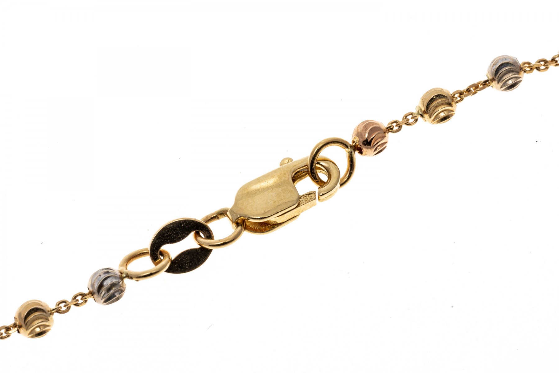14K yellow gold cross drop necklace. Set along the chain are stationed diamond cut beads in white, yellow and rose gold. A drop suspends from the necklace and ends in a cross pendant. Lobster claw clasp.