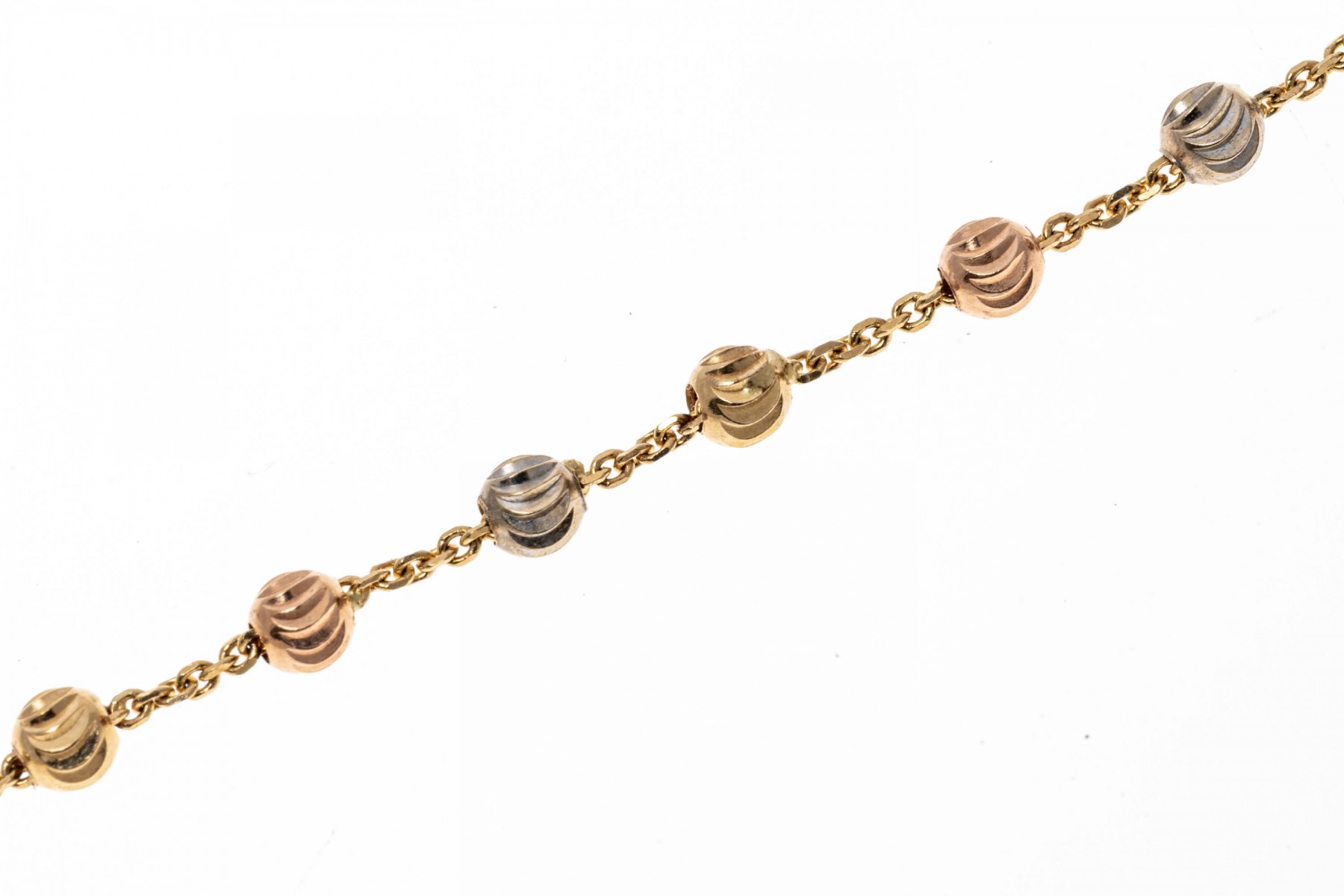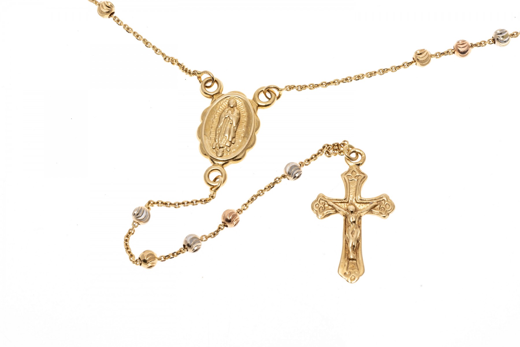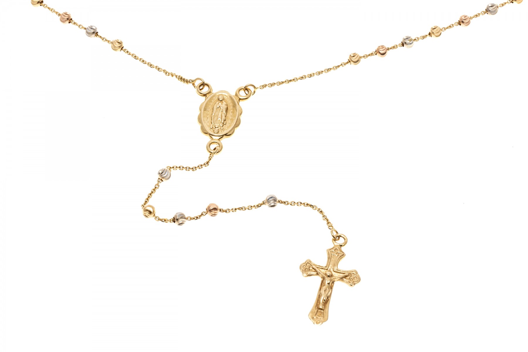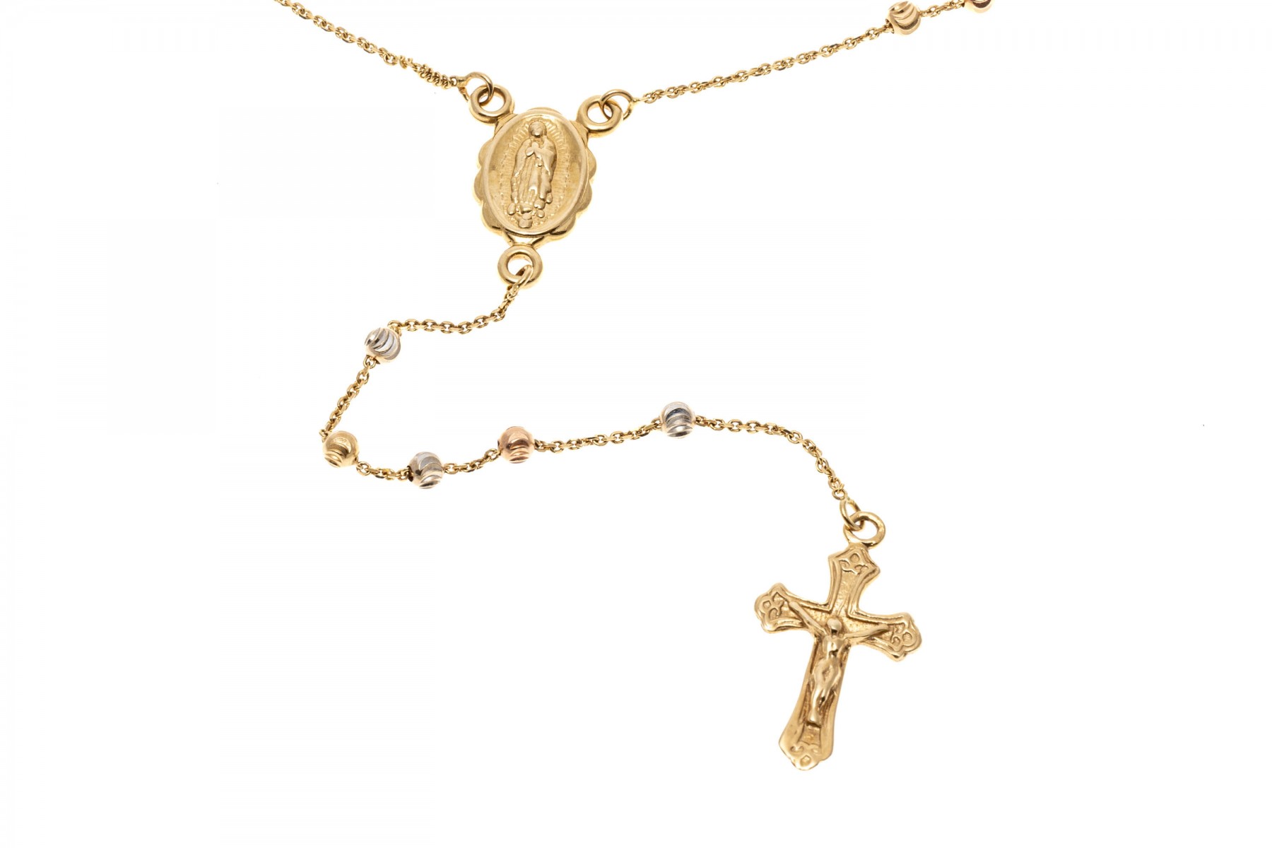 14K yellow gold cross drop necklace. Set along the chain are stationed diamond cut beads in white, yellow and rose gold. A drop suspends from the necklace and ends in a cross pendant. Lobster claw clasp.