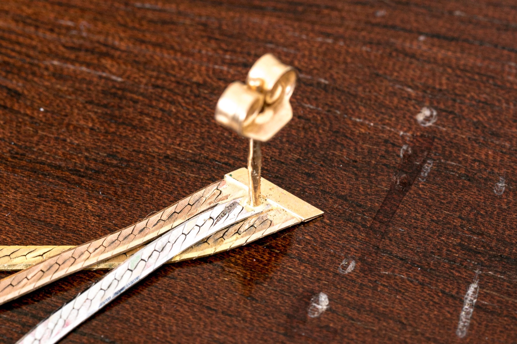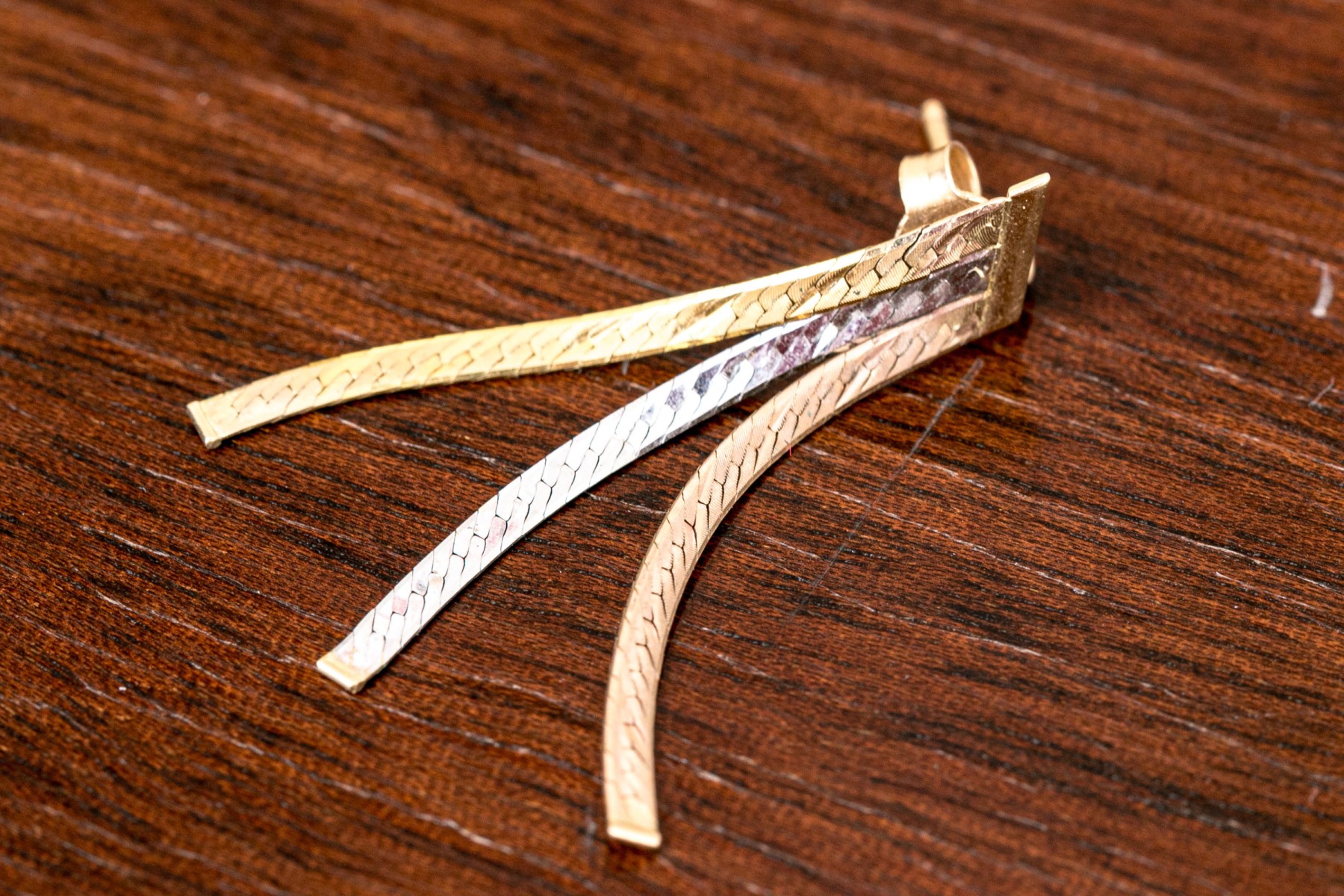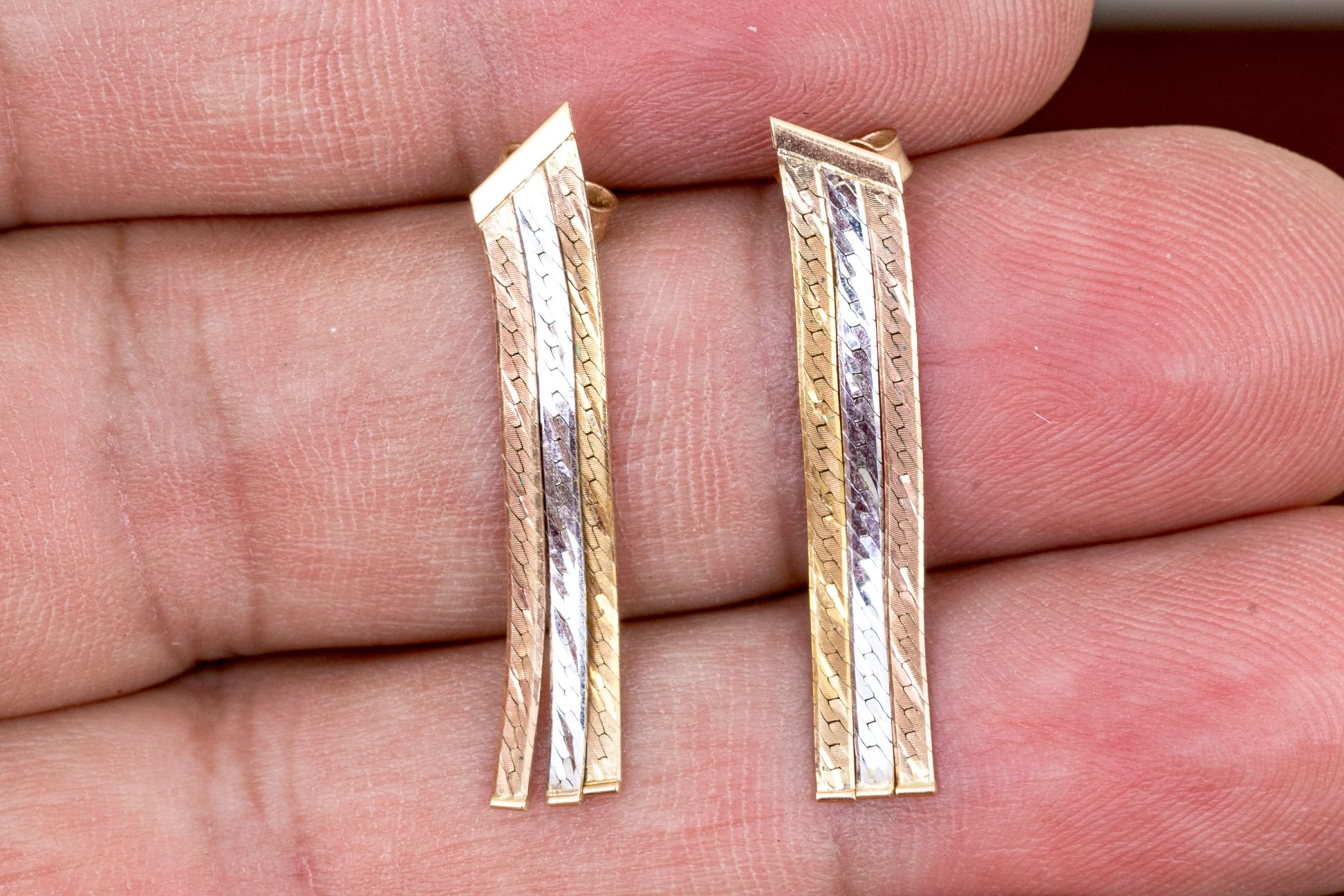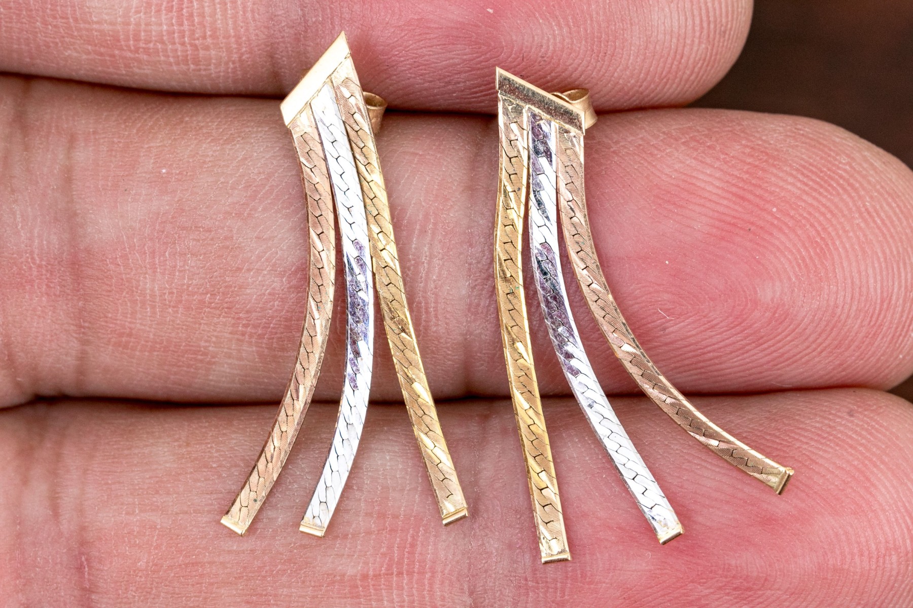 A dazzling pair of earrings each displaying tricolor ribbons of herringbone chain dangling from an angled bar along the top. Posts with clutch backs.