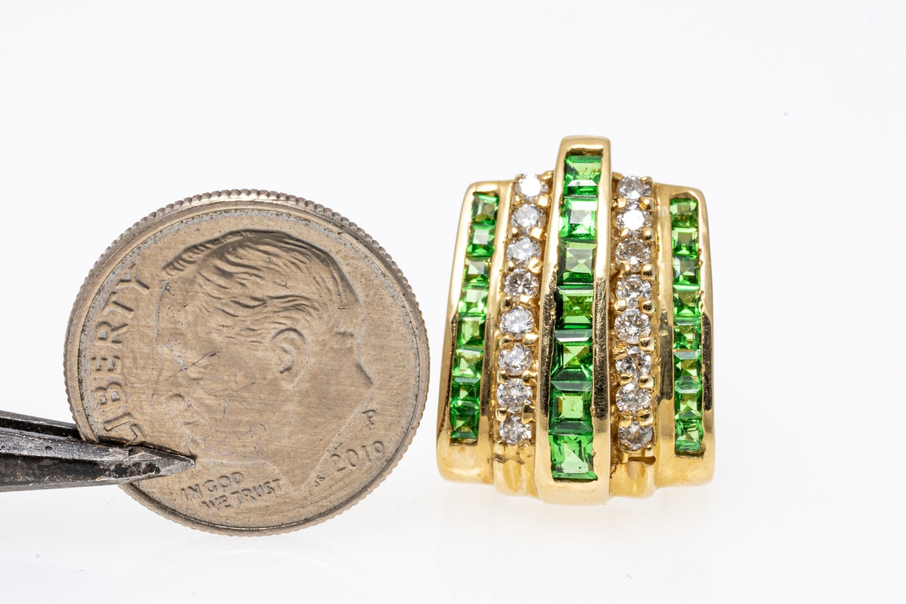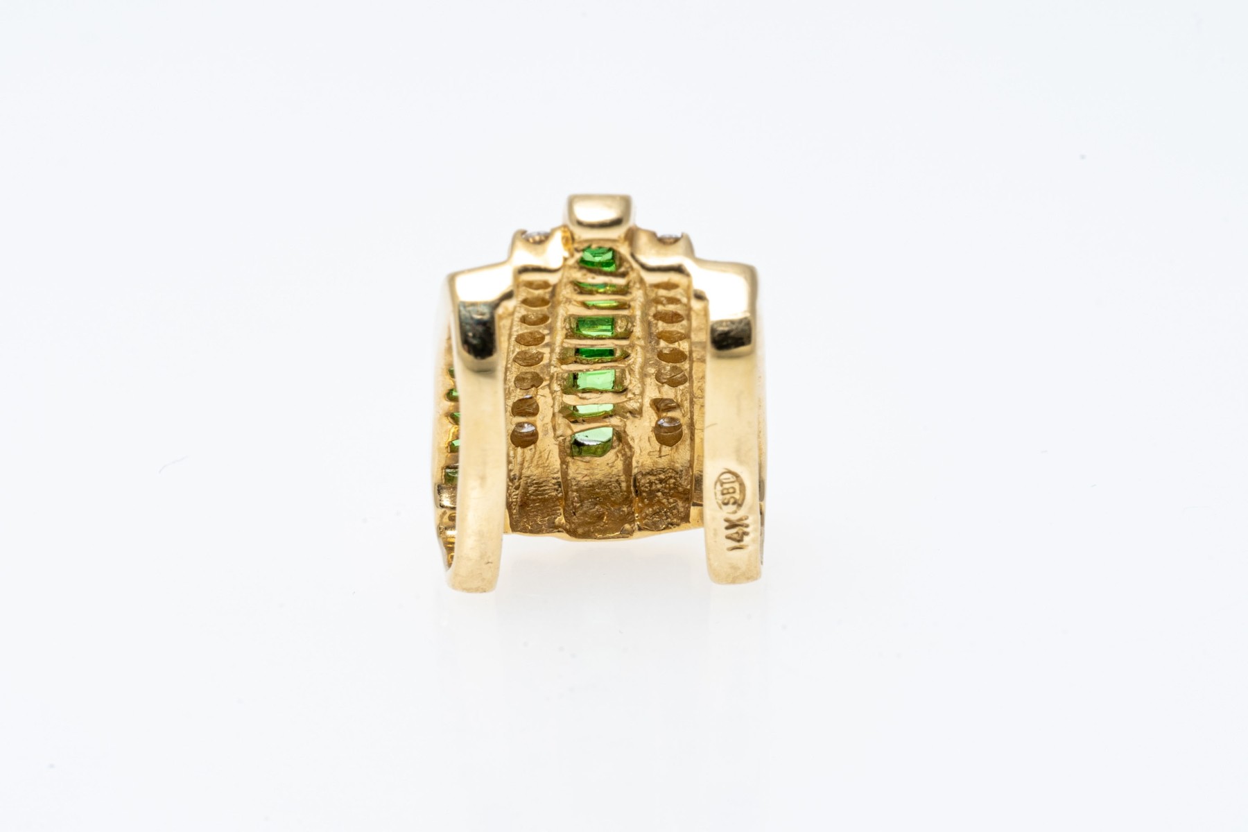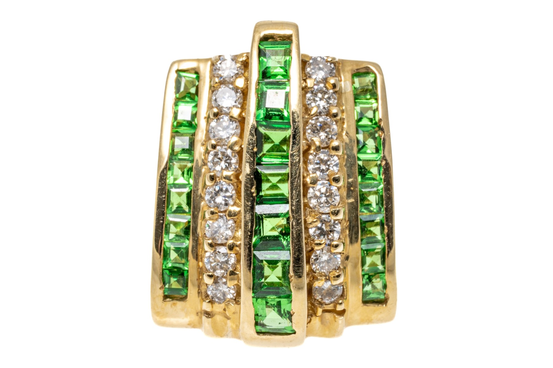 14K yellow gold pendant. The pendant is set with a trail of square cut tsavorite stones down the center and edges. Alternating with this are two rows of round brilliant cut diamonds. The tsavorite are approximately 0.69 TCW and the diamonds are approximately 0.33 TCW.
