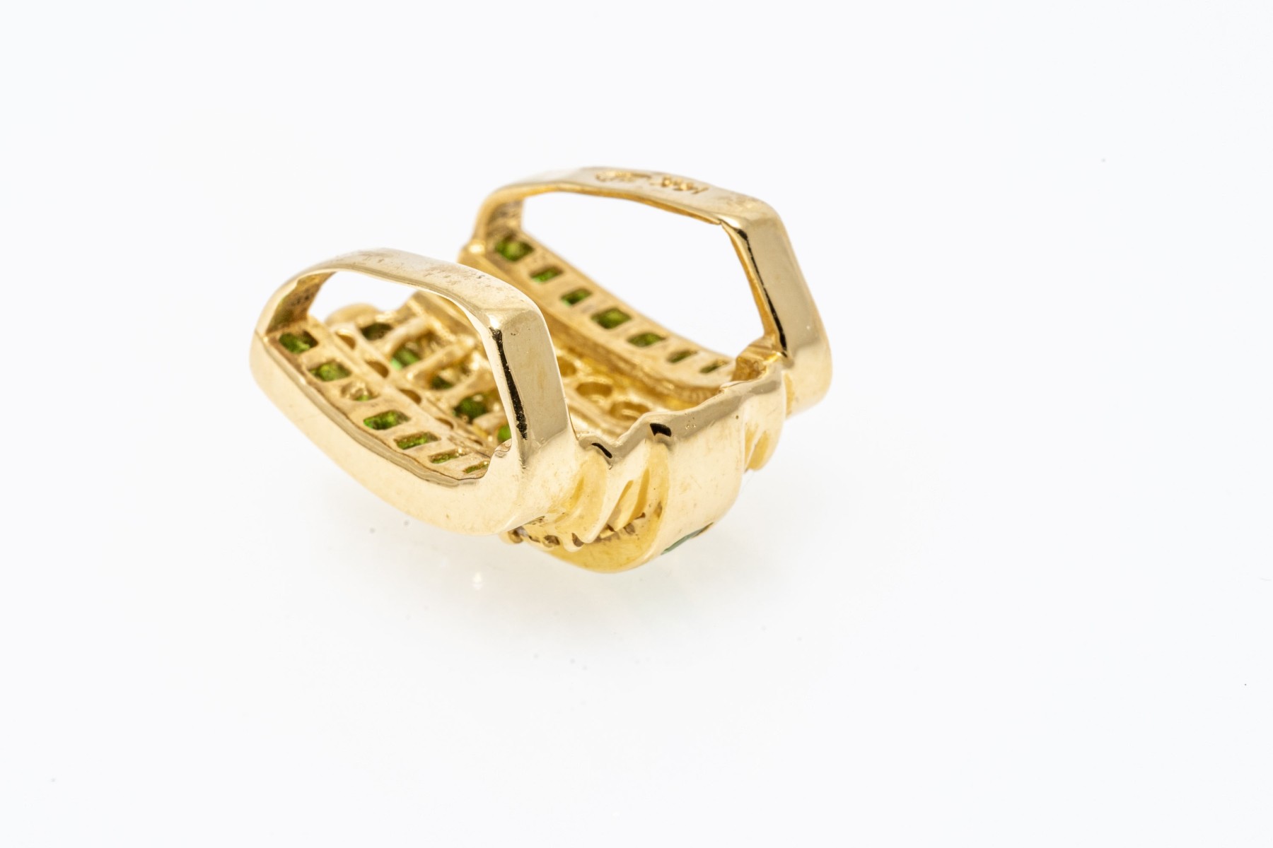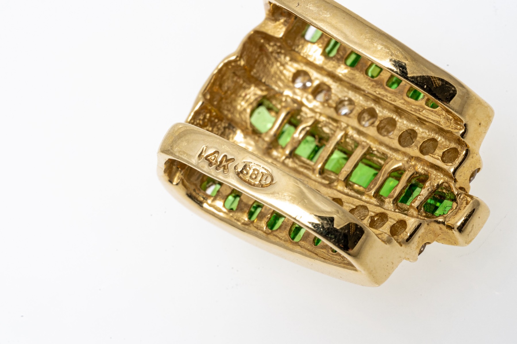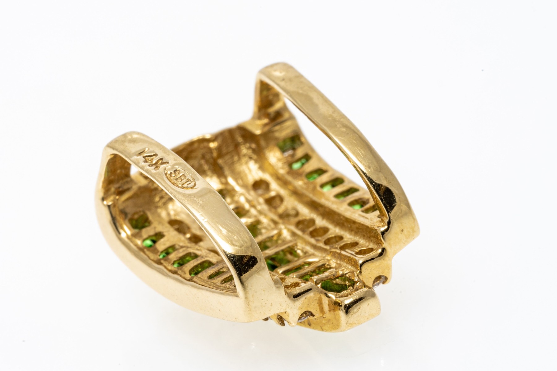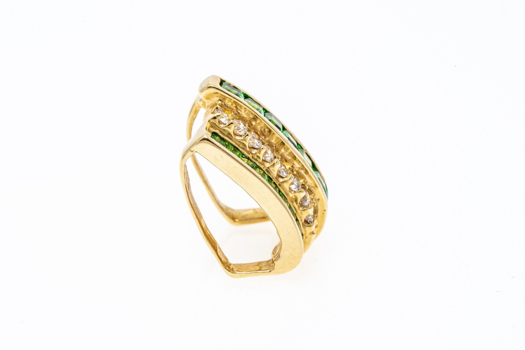 14K yellow gold pendant. The pendant is set with a trail of square cut tsavorite stones down the center and edges. Alternating with this are two rows of round brilliant cut diamonds. The tsavorite are approximately 0.69 TCW and the diamonds are approximately 0.33 TCW.