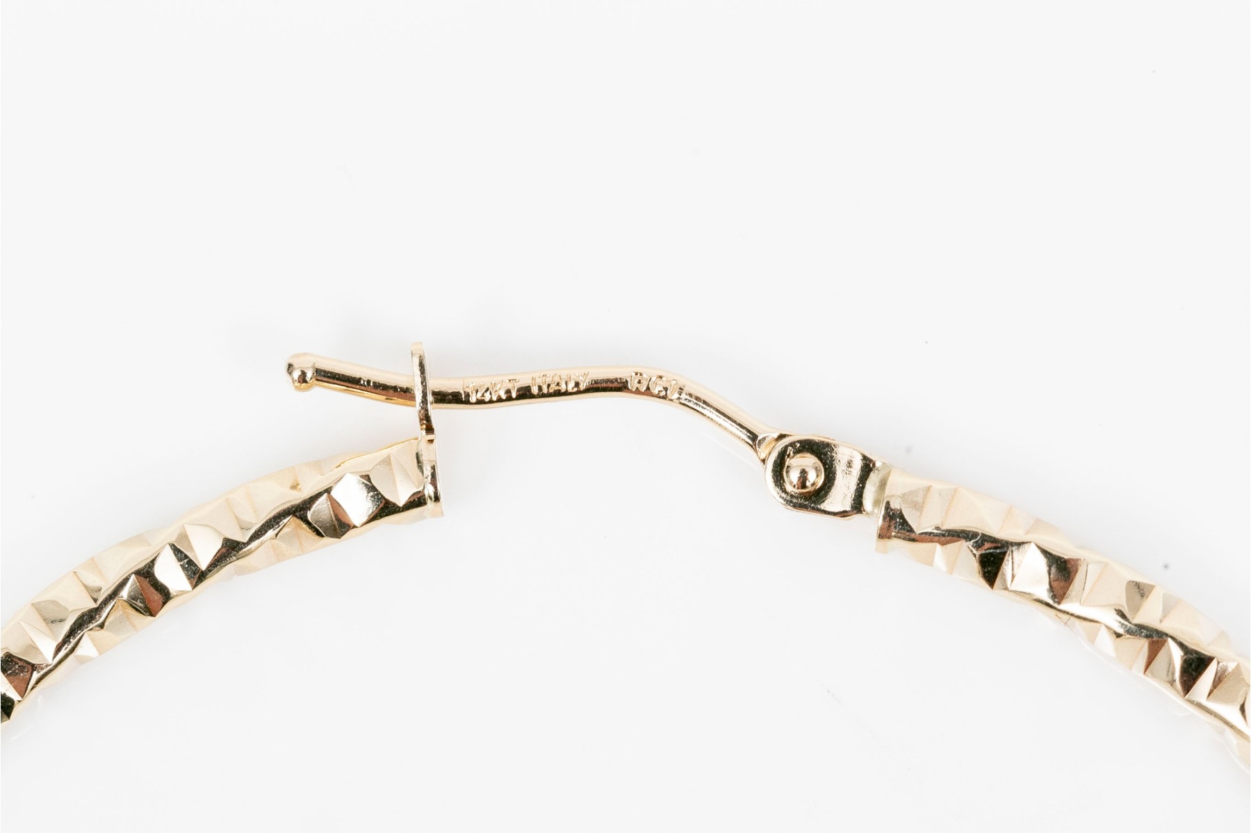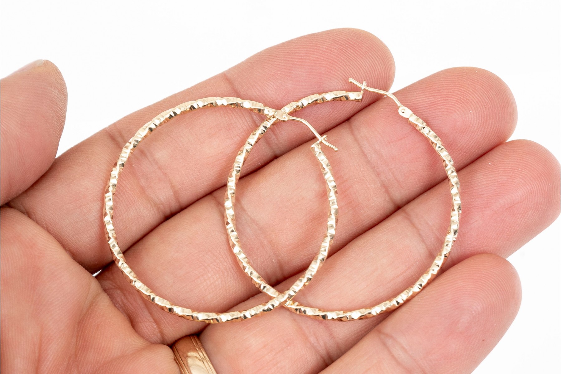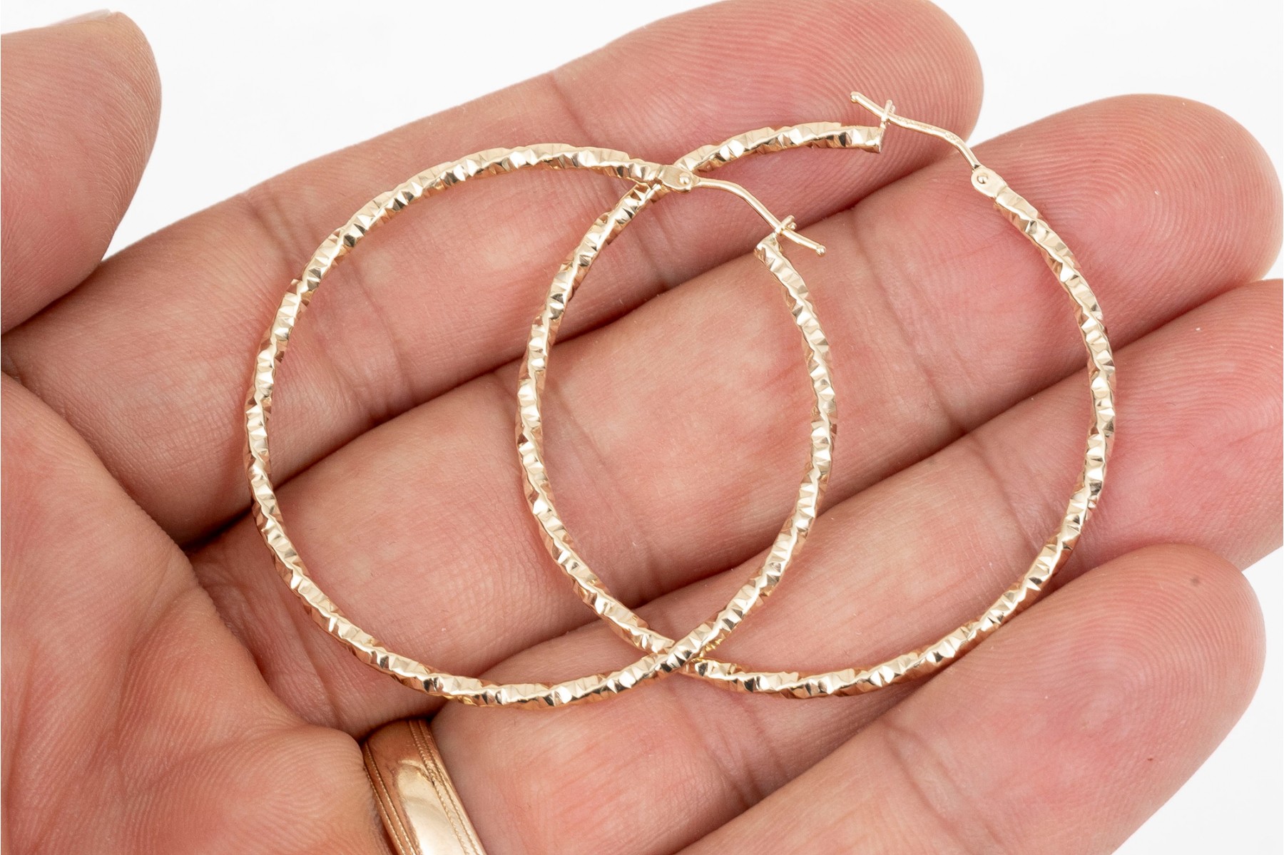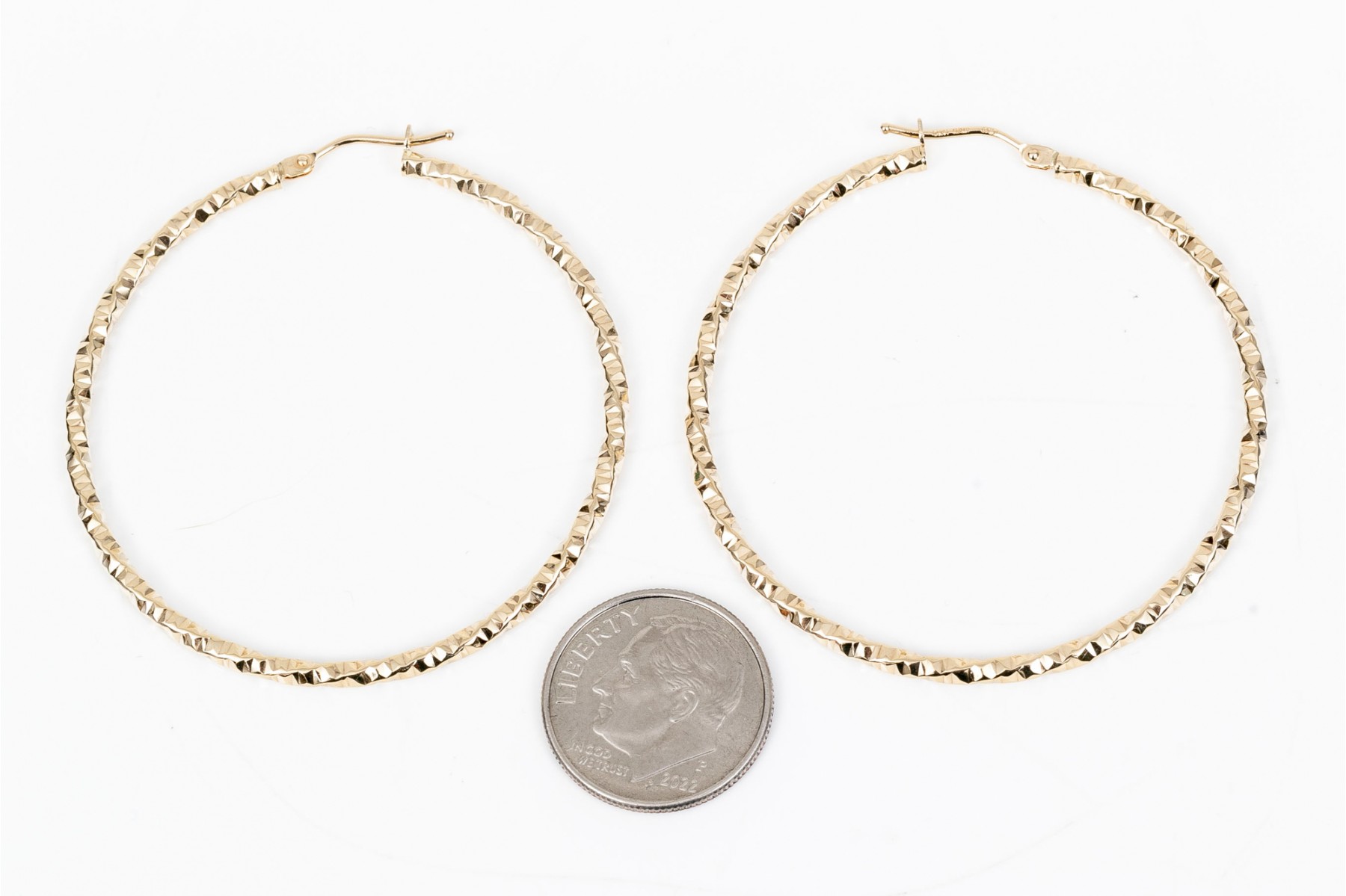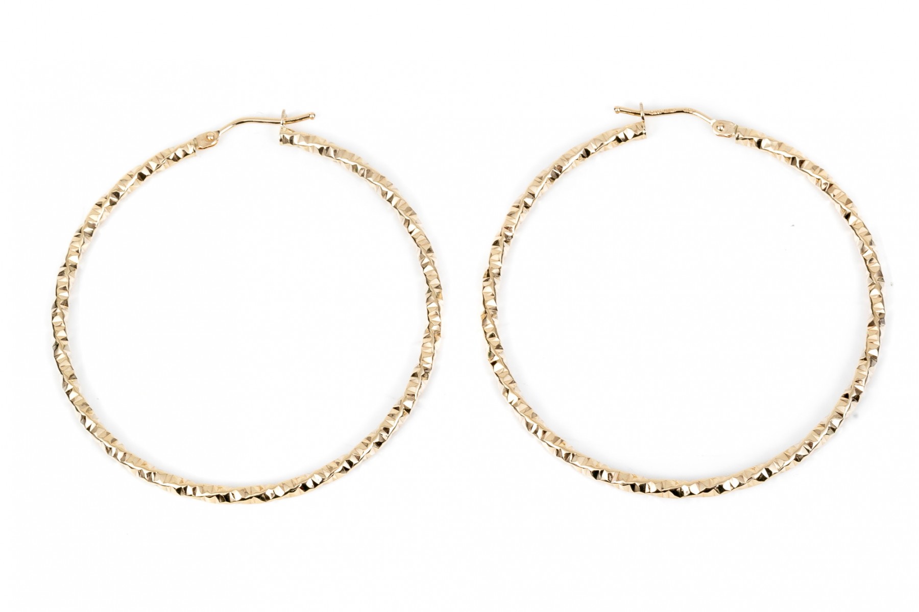 A large pair of splendid hoop earrings. 14K yellow gold hoops with a twist and bright polished design. Post leaver backings.