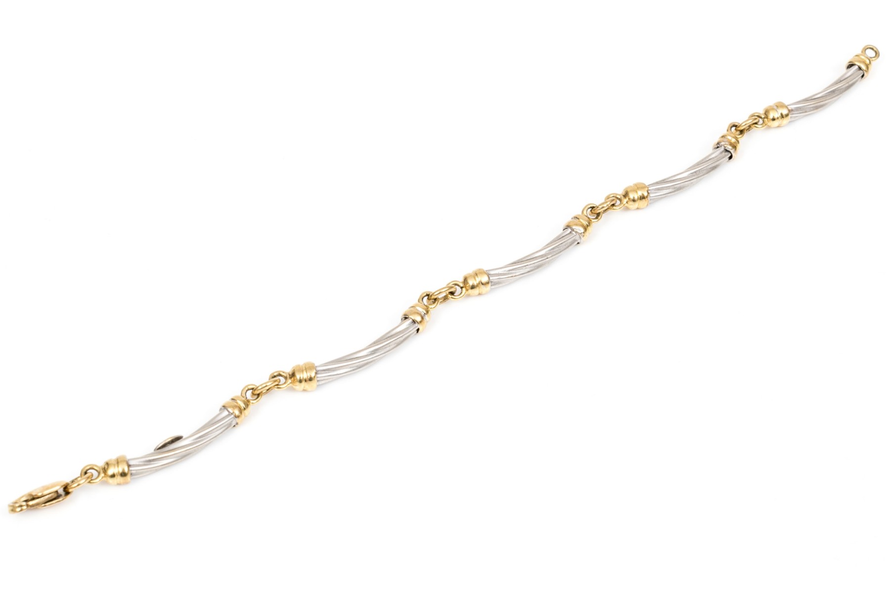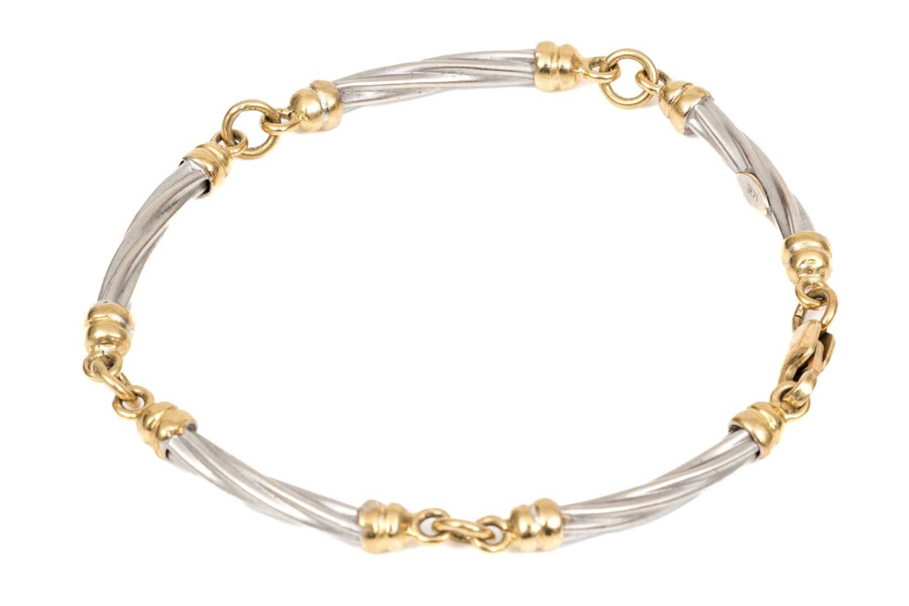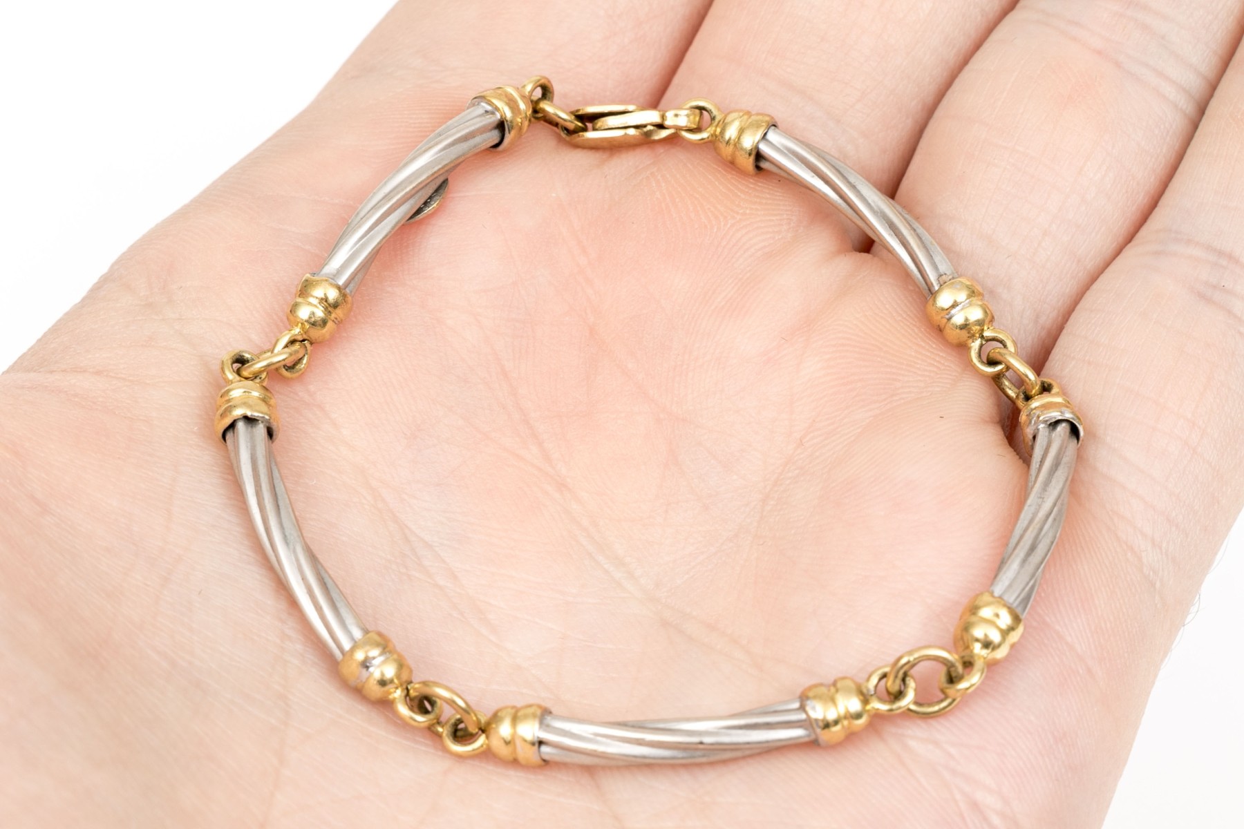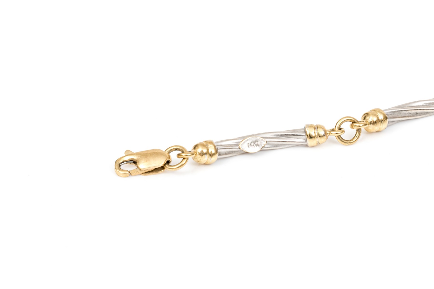 14k two tone striking twisted tube link bracelet, capped with ribbed ends and finished with a lobster claw style clasp