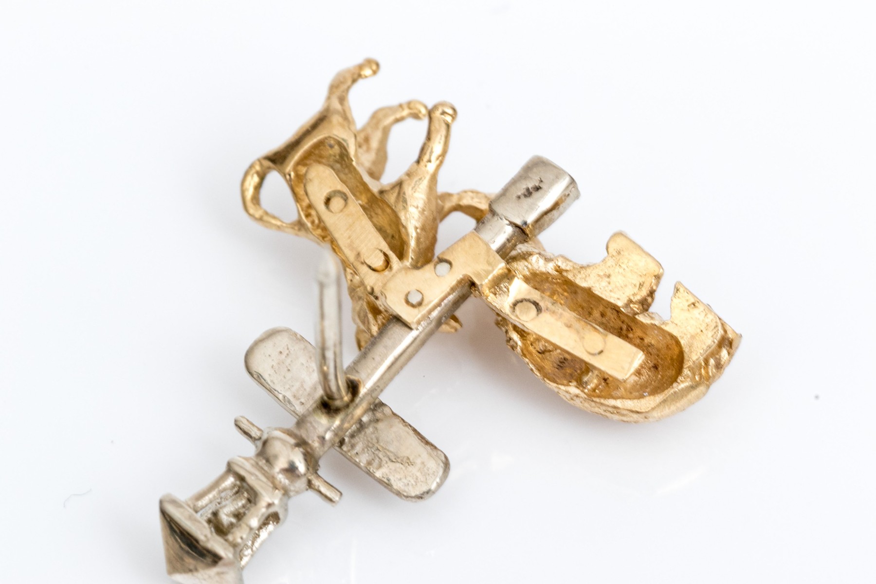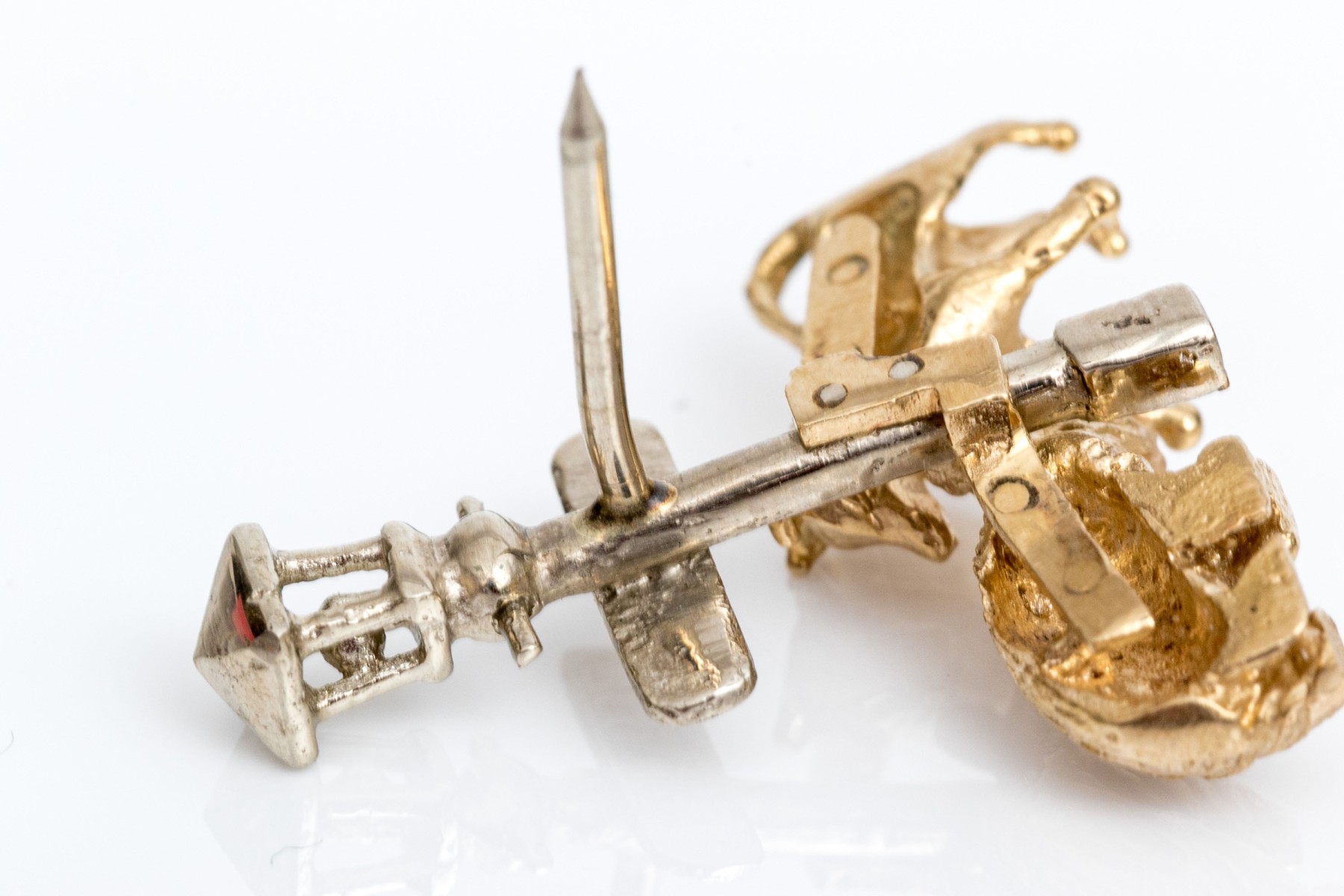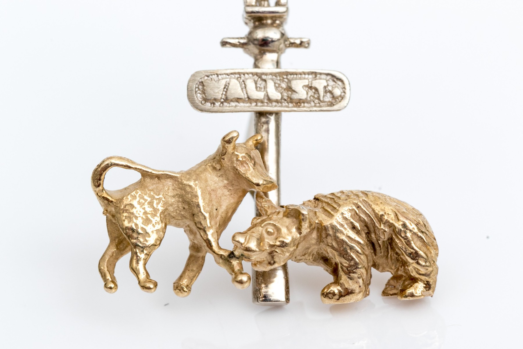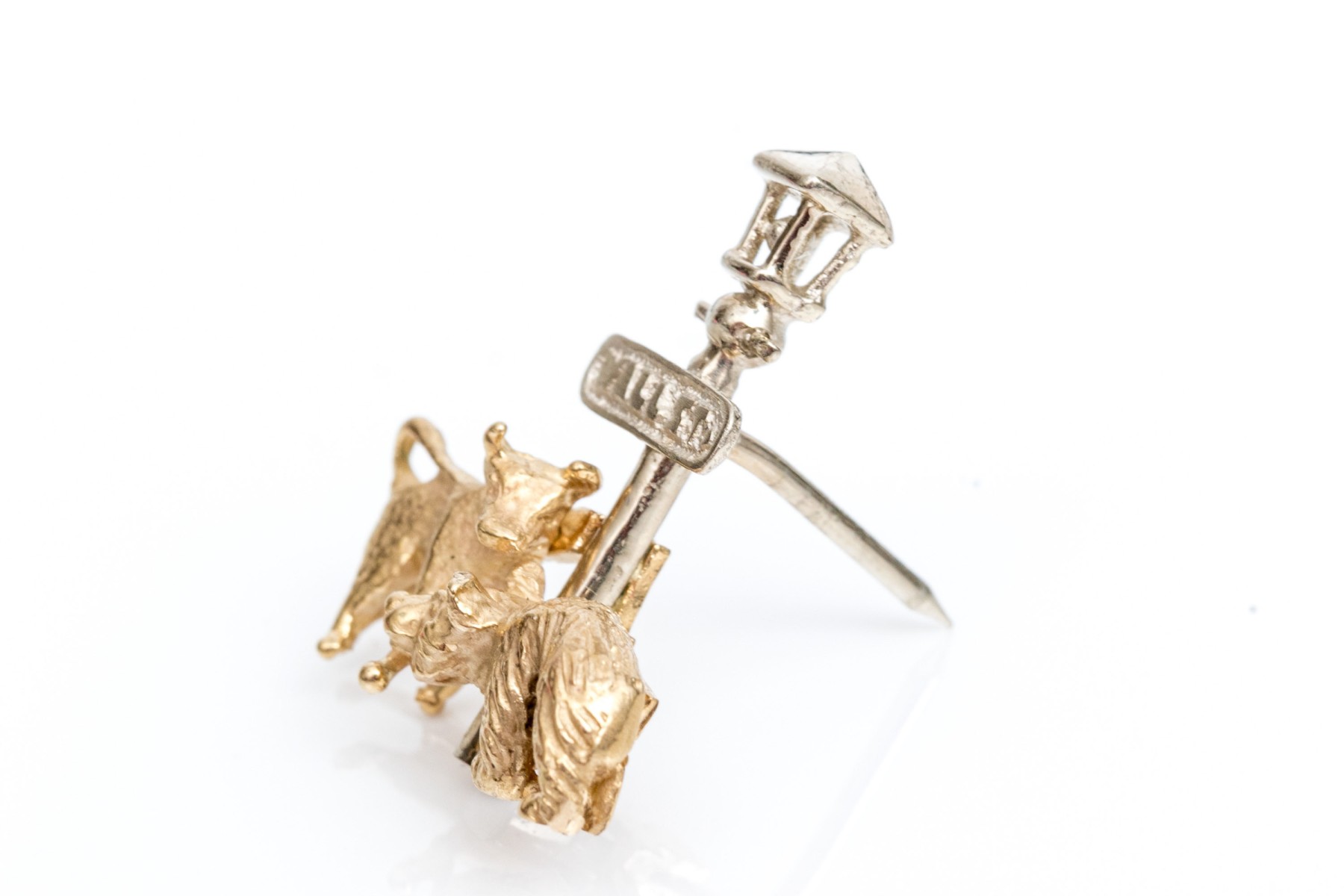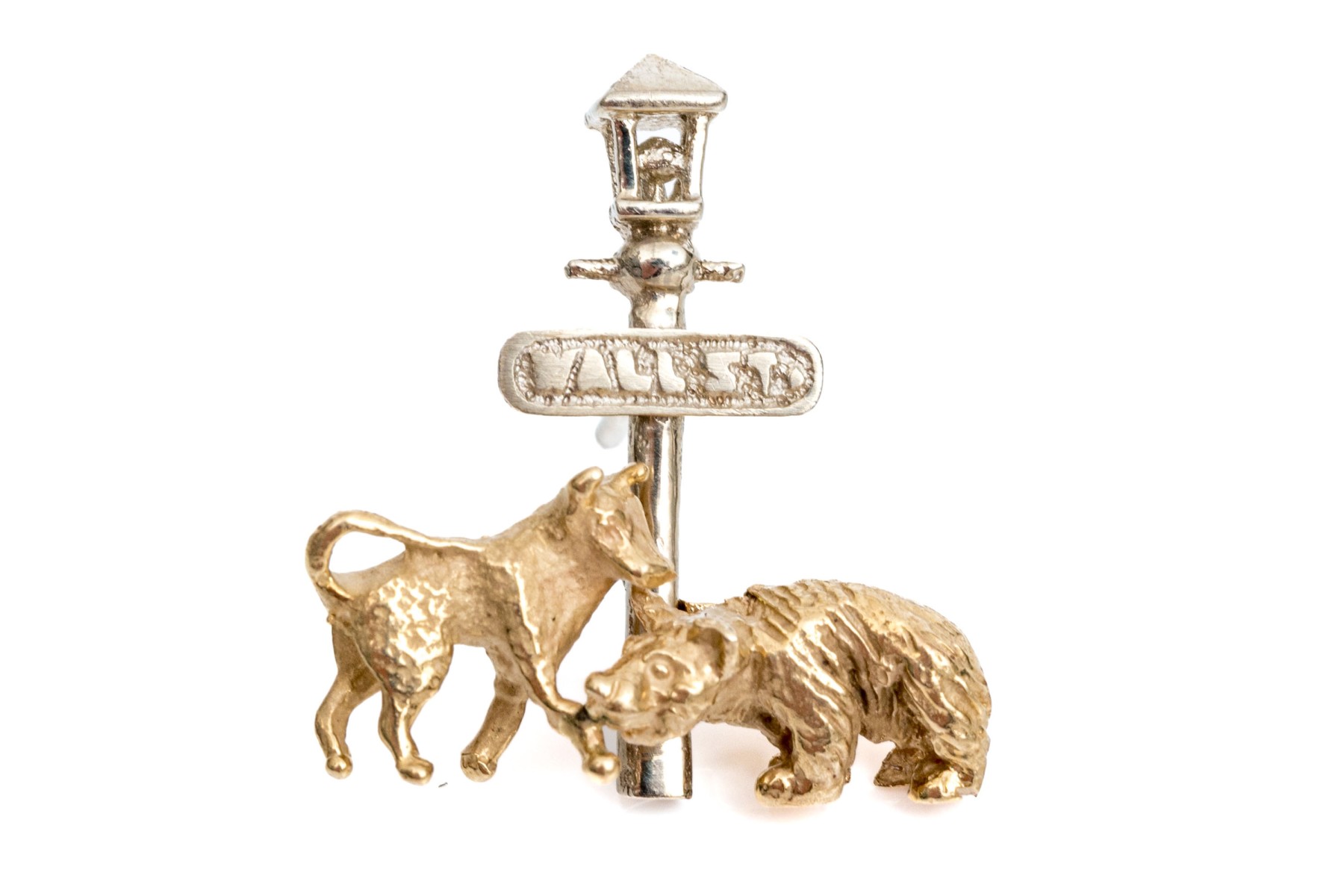 A 14K white and yellow gold brooch. Yellow gold bull and bear stand in front of a white gold 'Wall Street' lamp post.