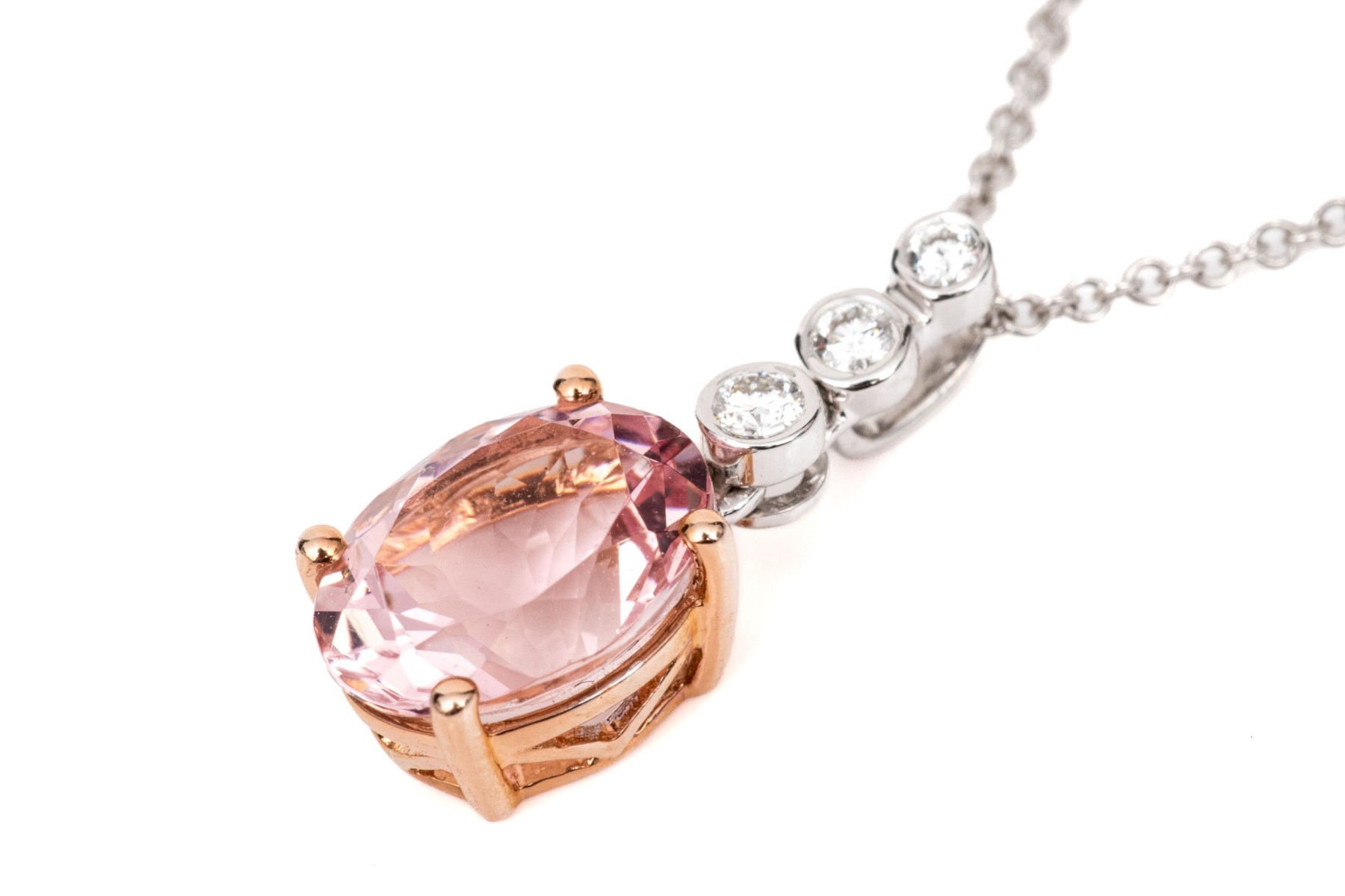 14k white and rose gold lovely morganite and diamond topped pendant, with chain, diamonds app. 0.03 TCW, morganite app. 1.67 CTS