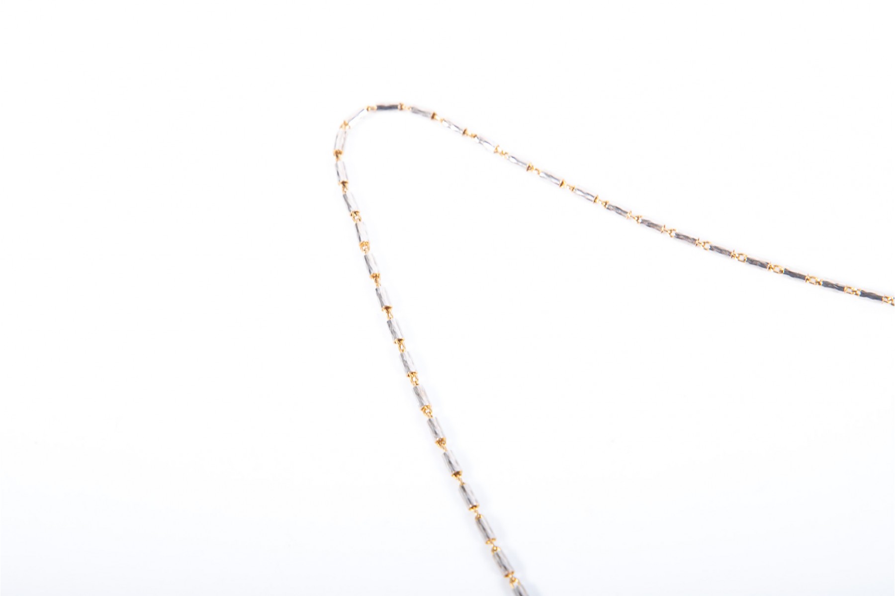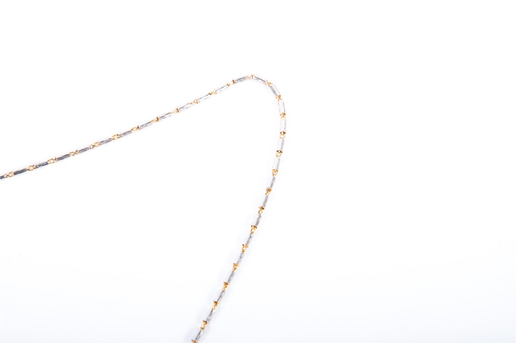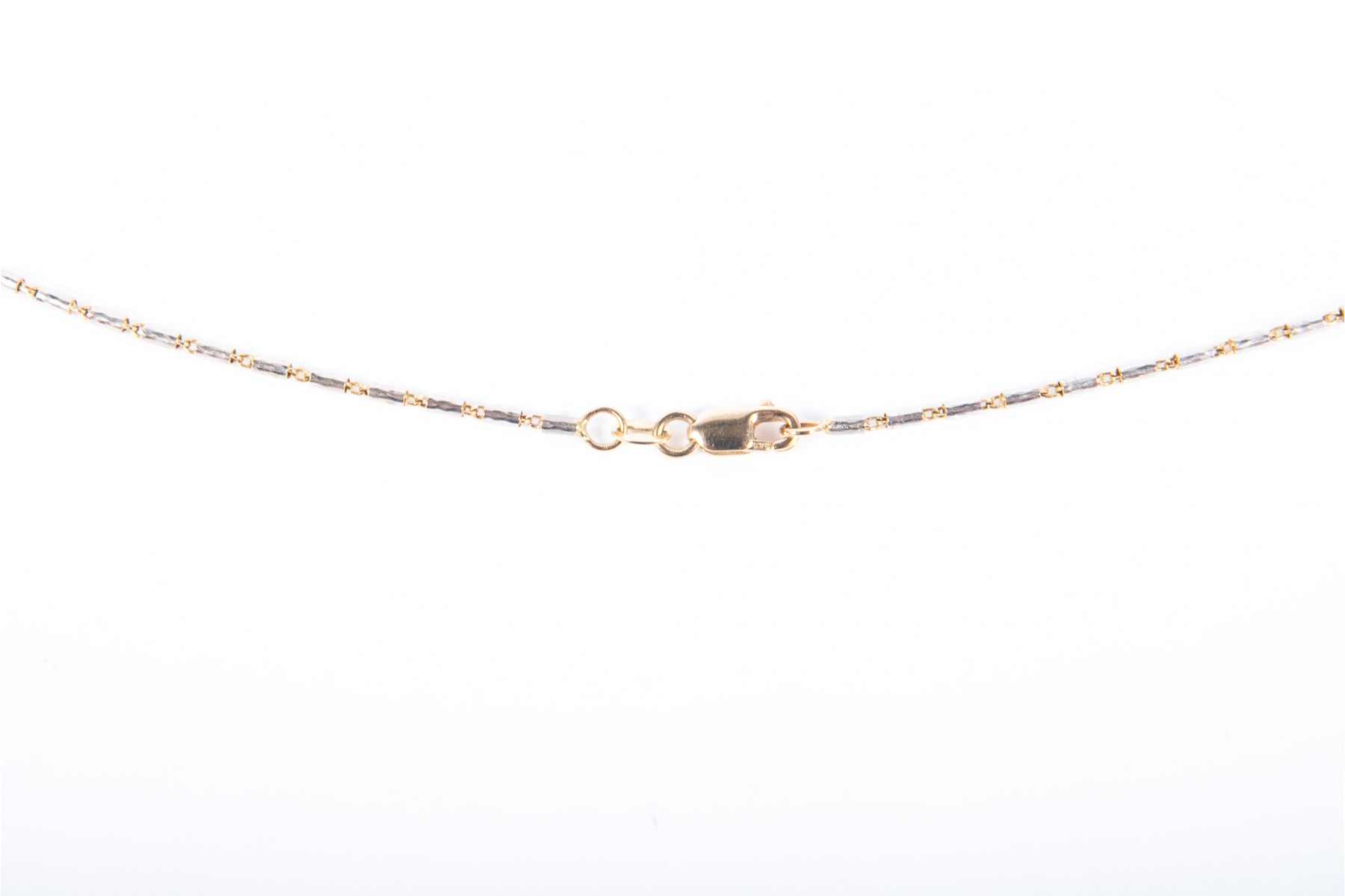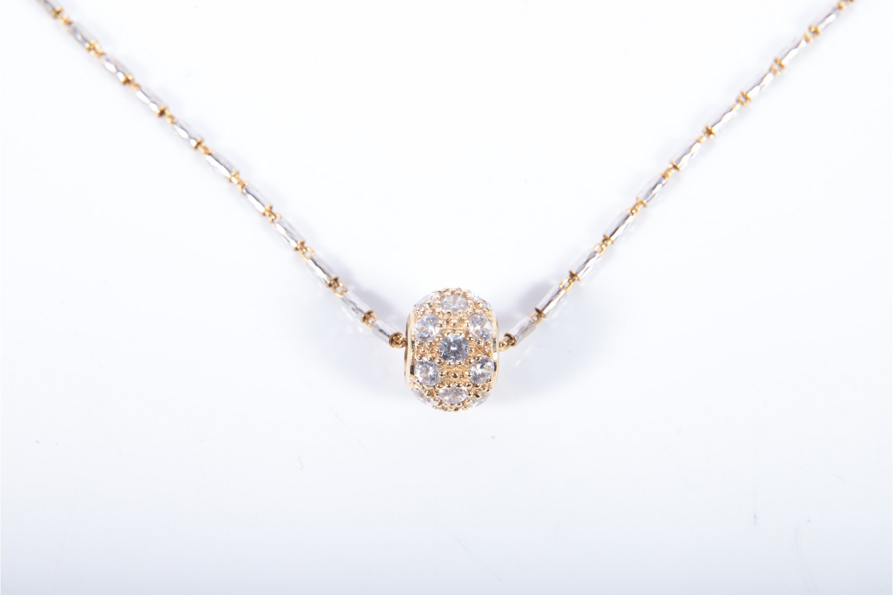A beautiful pendant necklace displaying a unique cable chain with yellow cable links joining white cylindrical spacers. The chain is adorned with a roundel pendant shimmering with round white CZ.