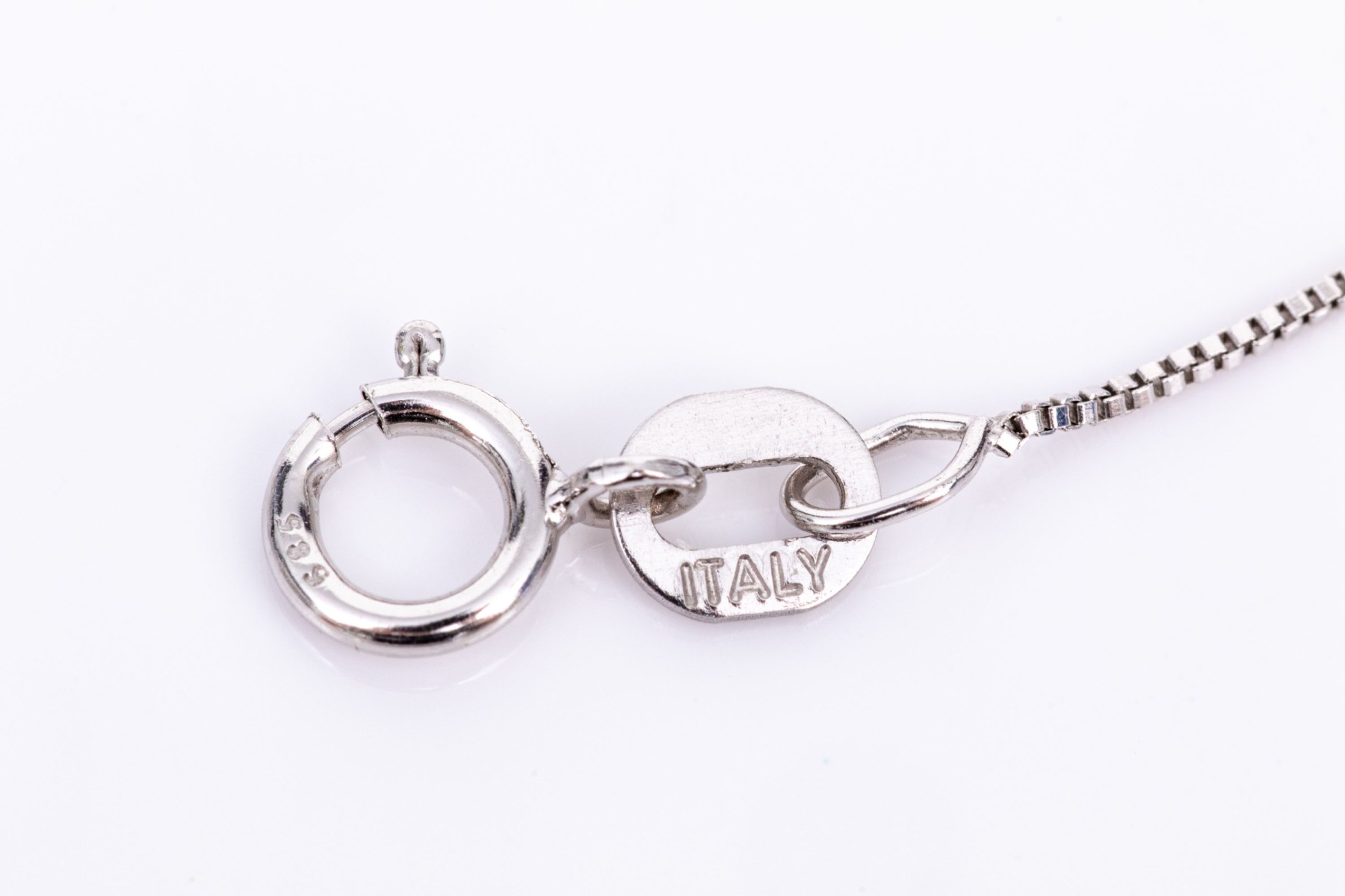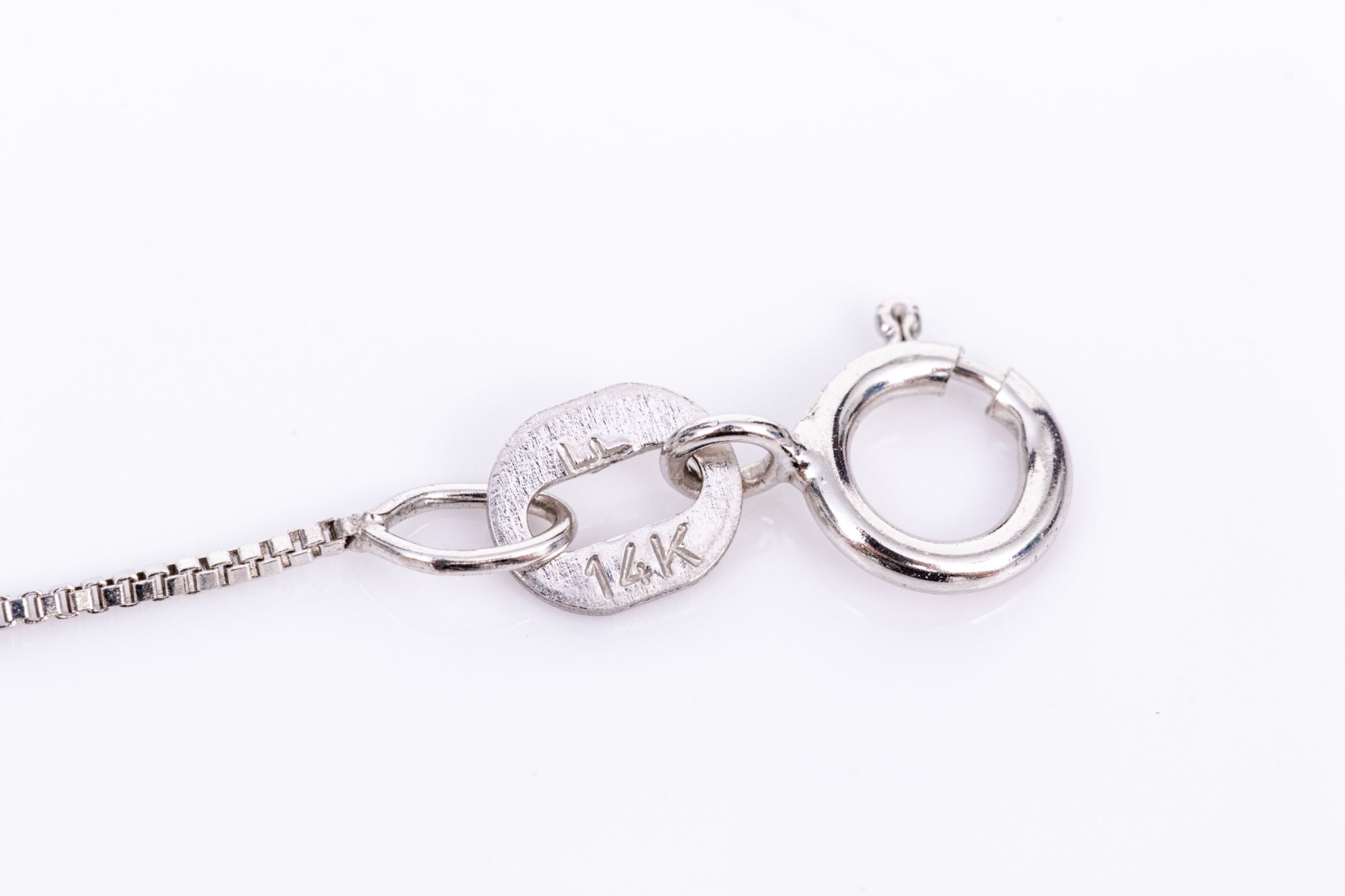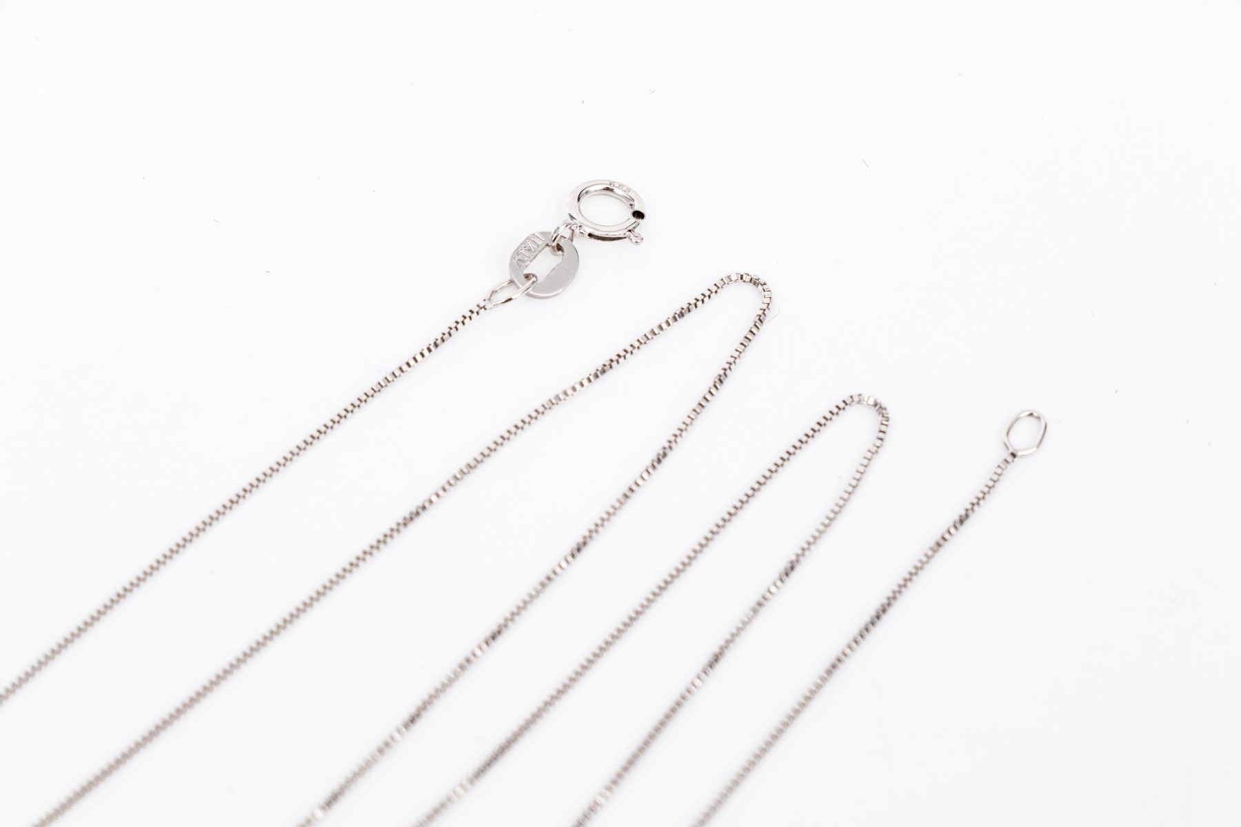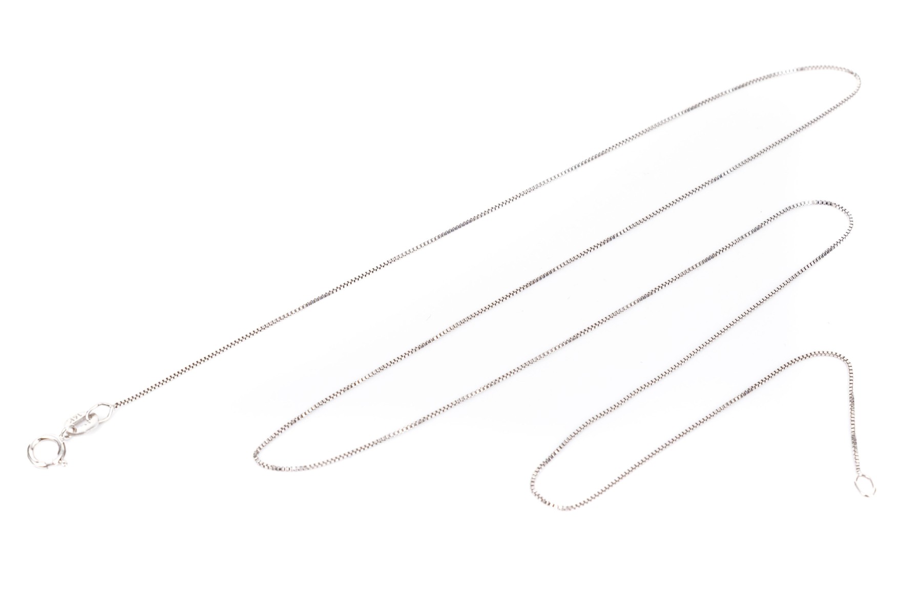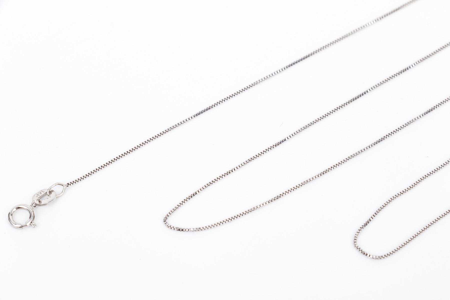 14k white gold 18" fine box chain, finished with a spring ring style clasp