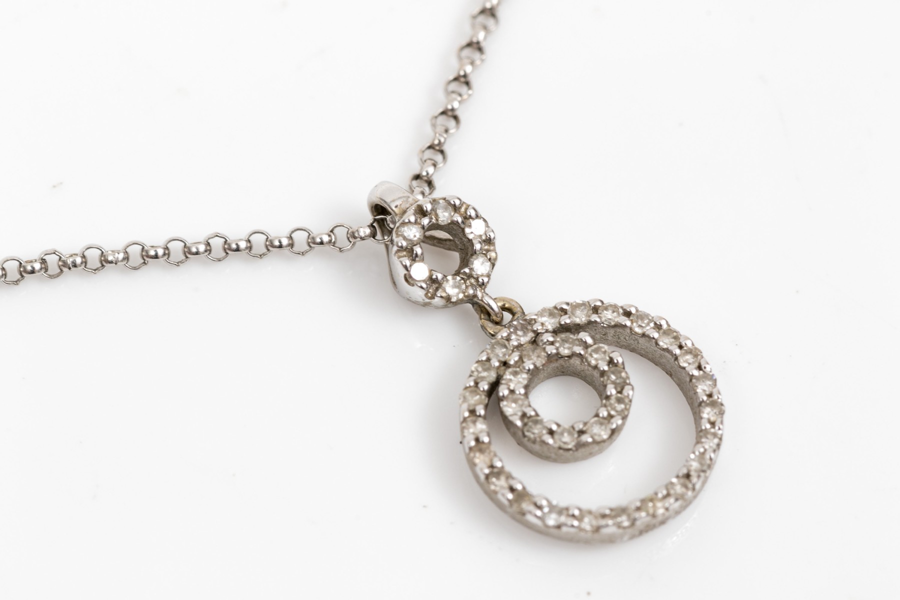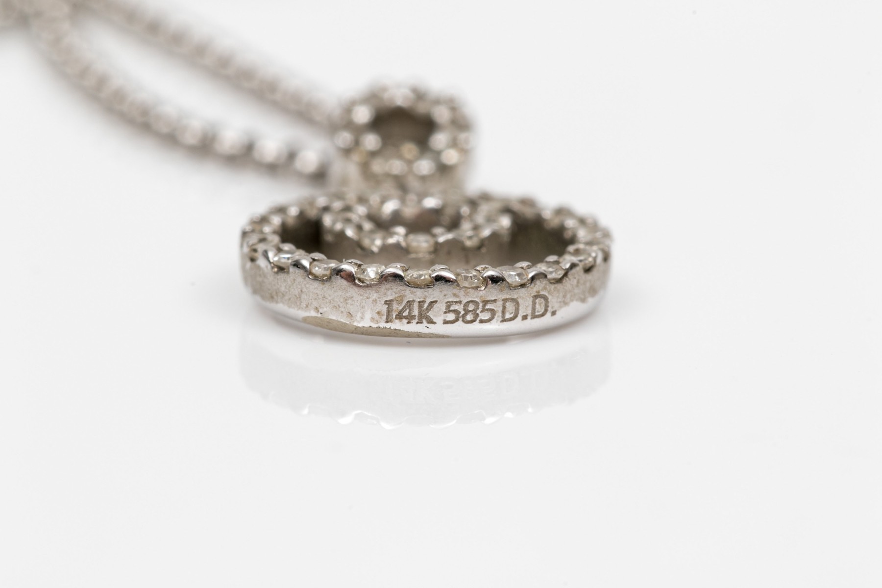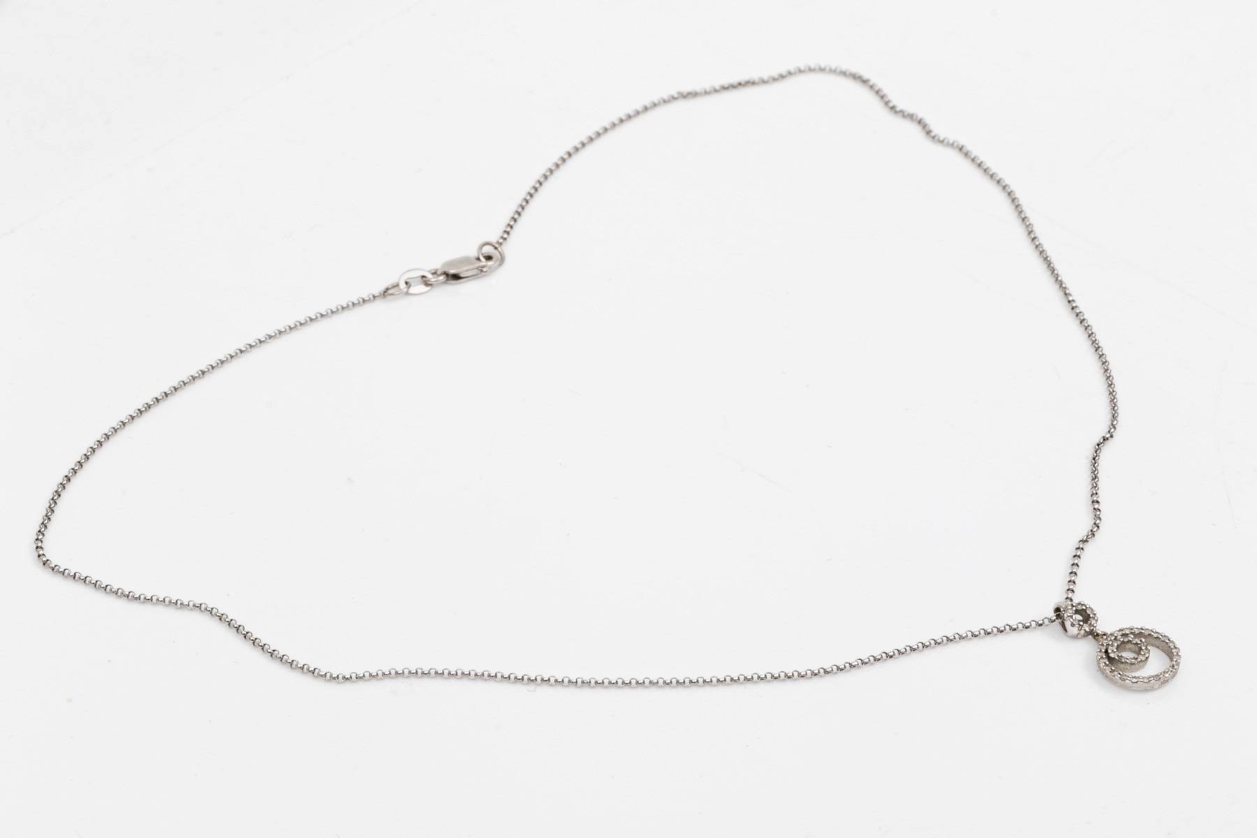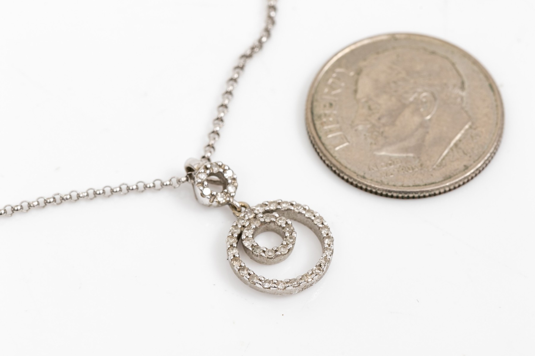 14K white gold pendant necklace. The cable link style chain showcases a slight circular pendant set with accent diamonds. Lobster claw clasp.