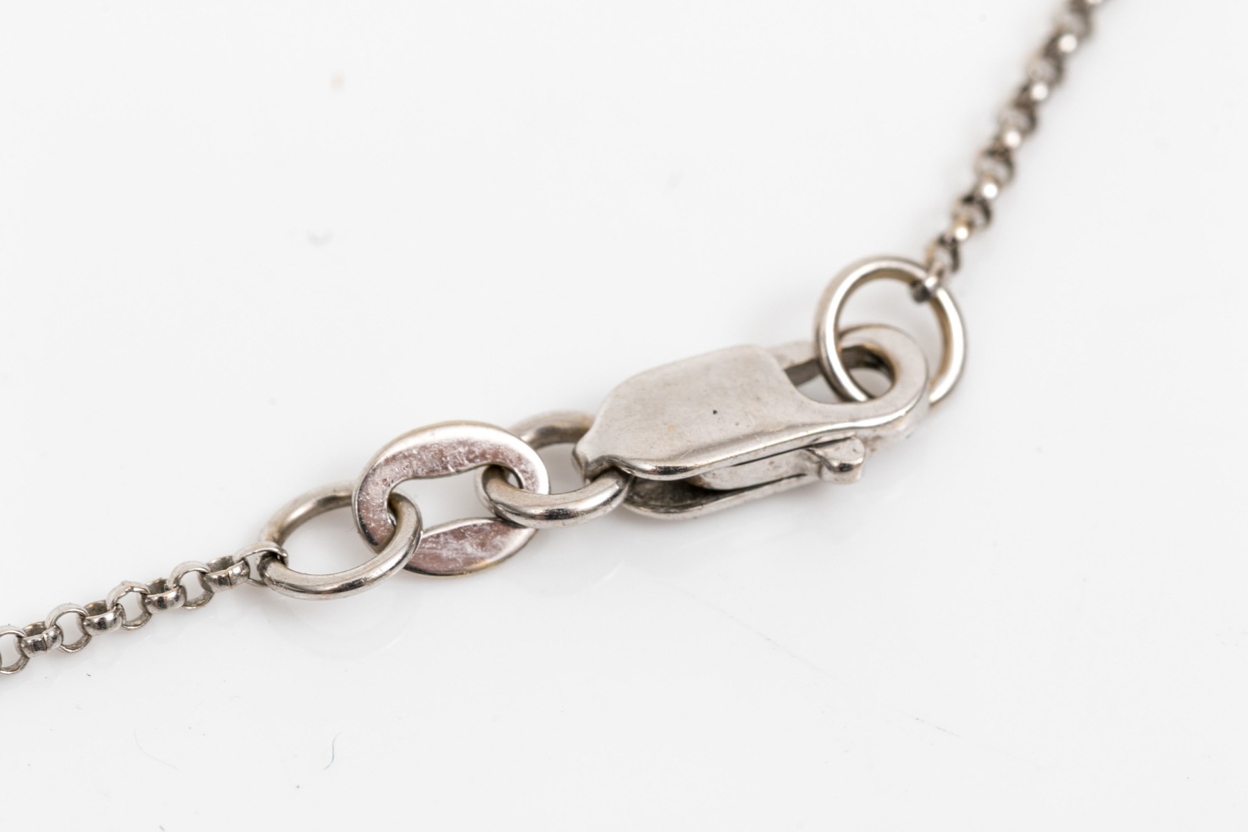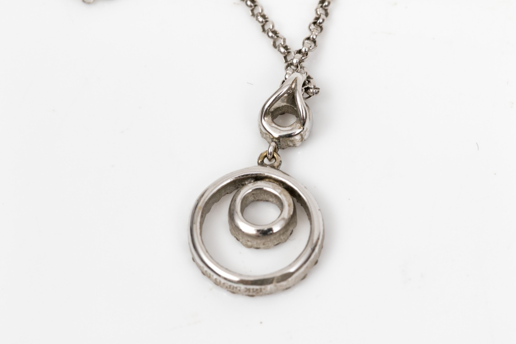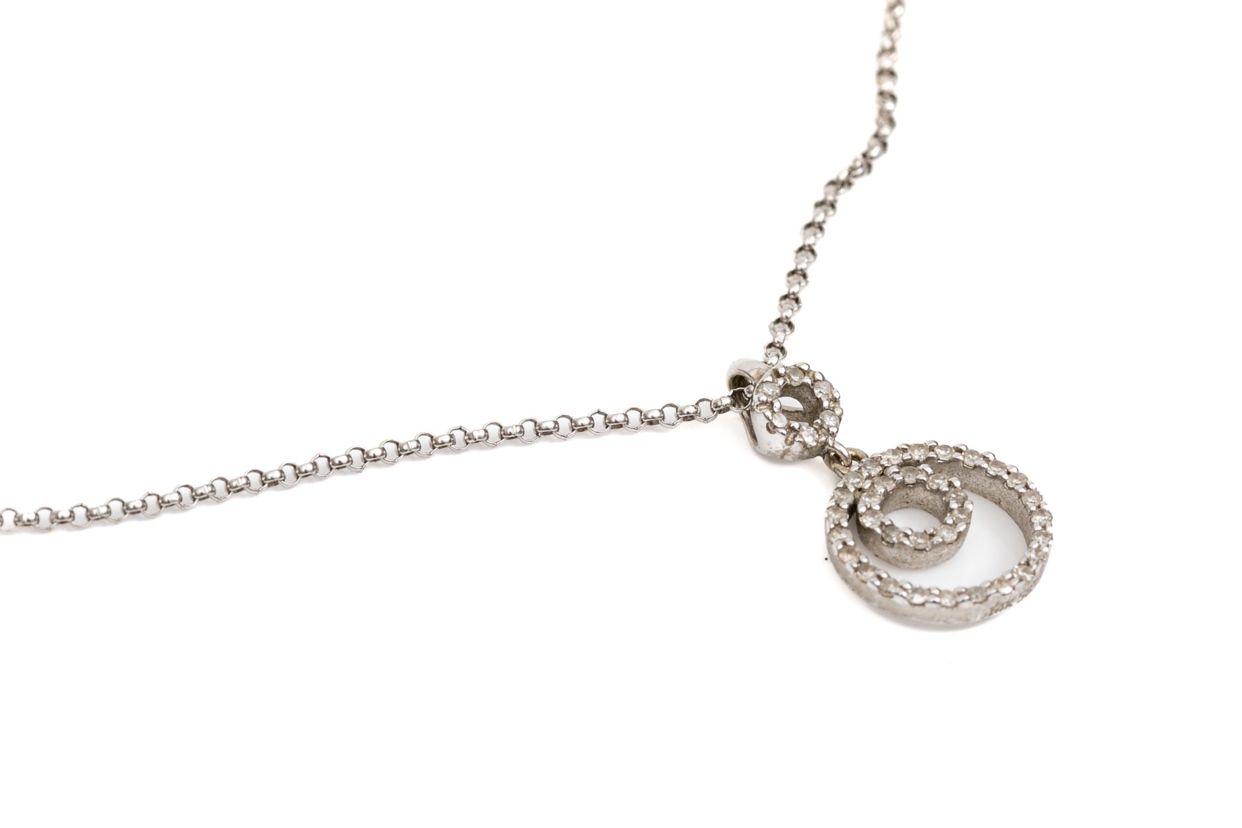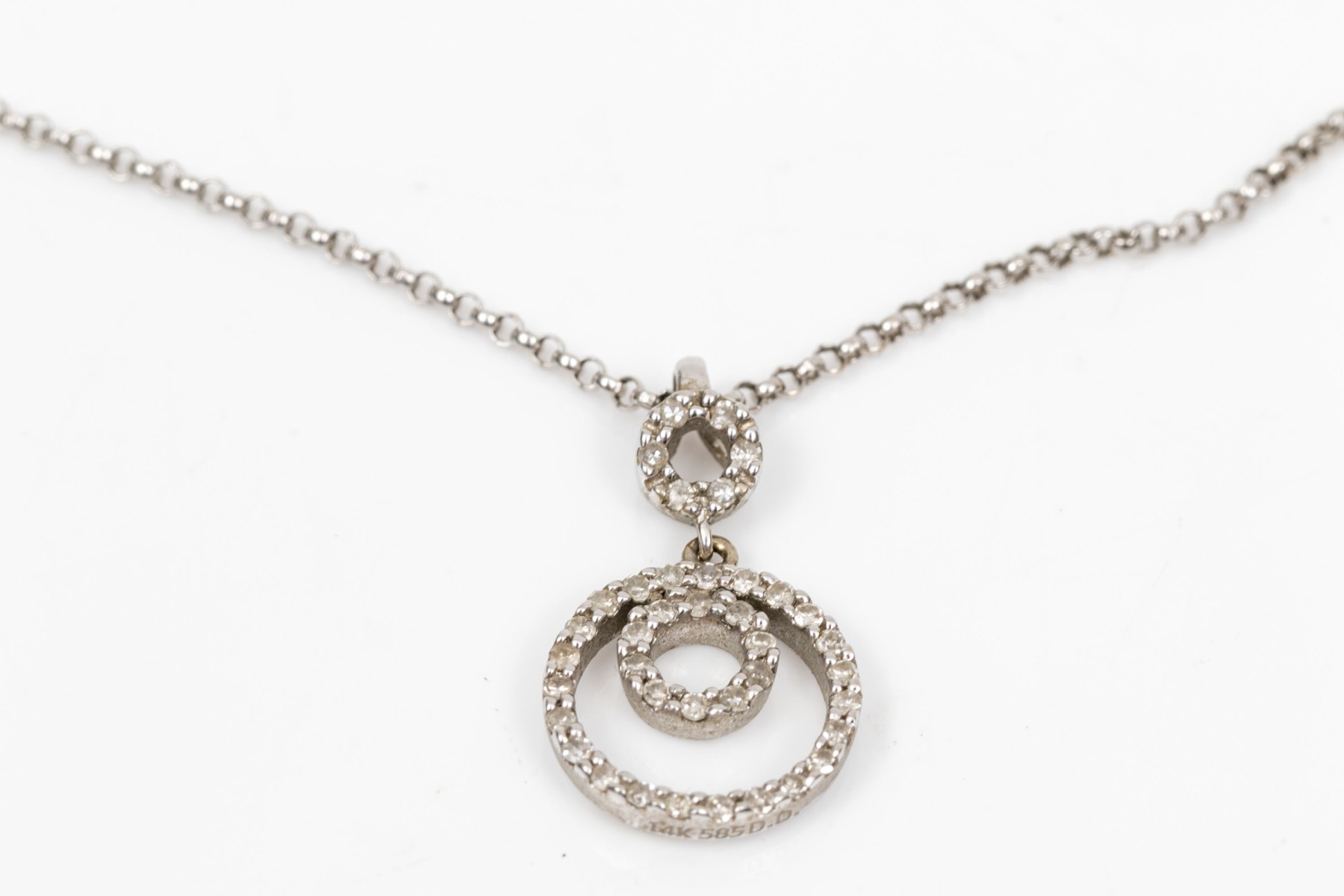 14K white gold pendant necklace. The cable link style chain showcases a slight circular pendant set with accent diamonds. Lobster claw clasp.