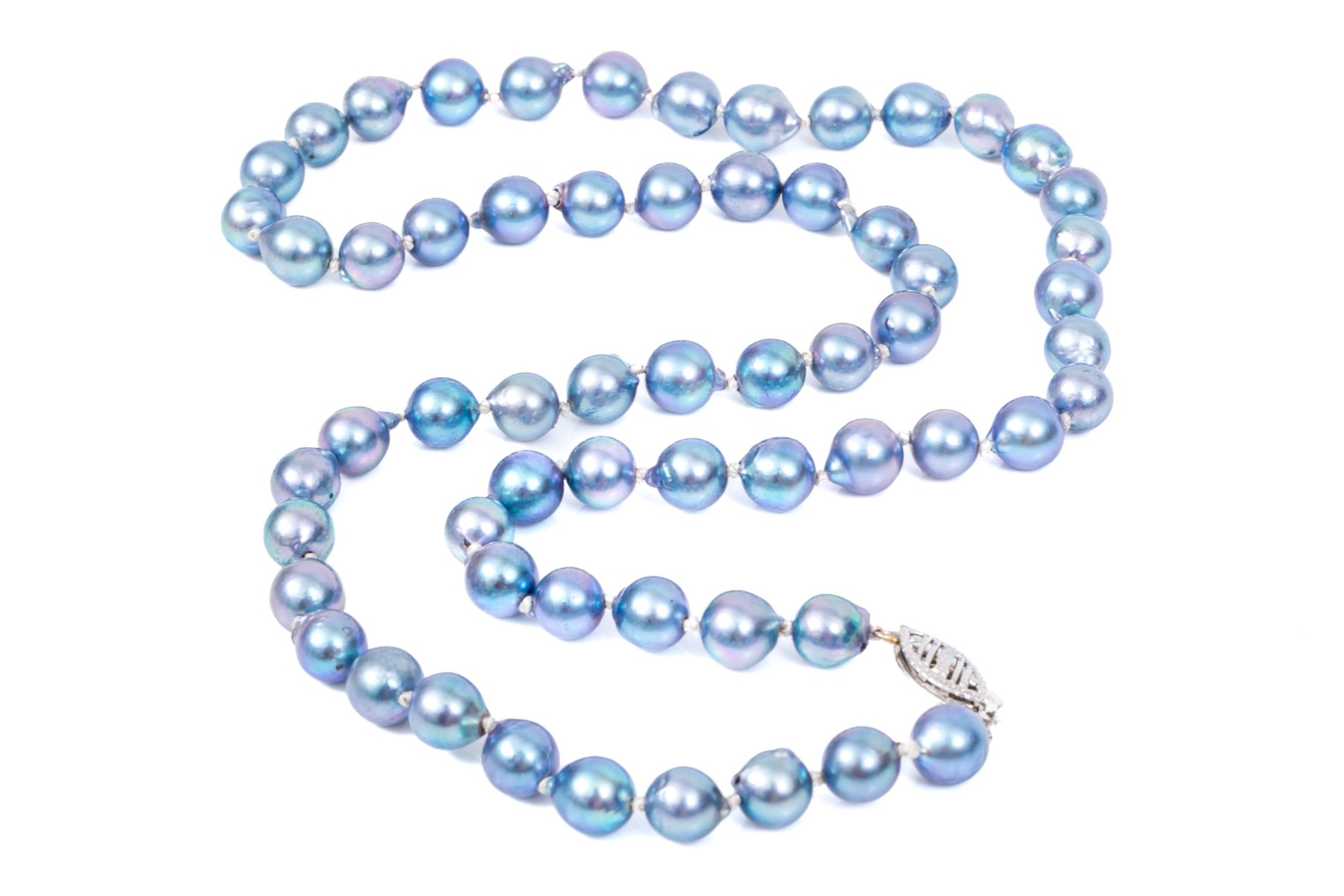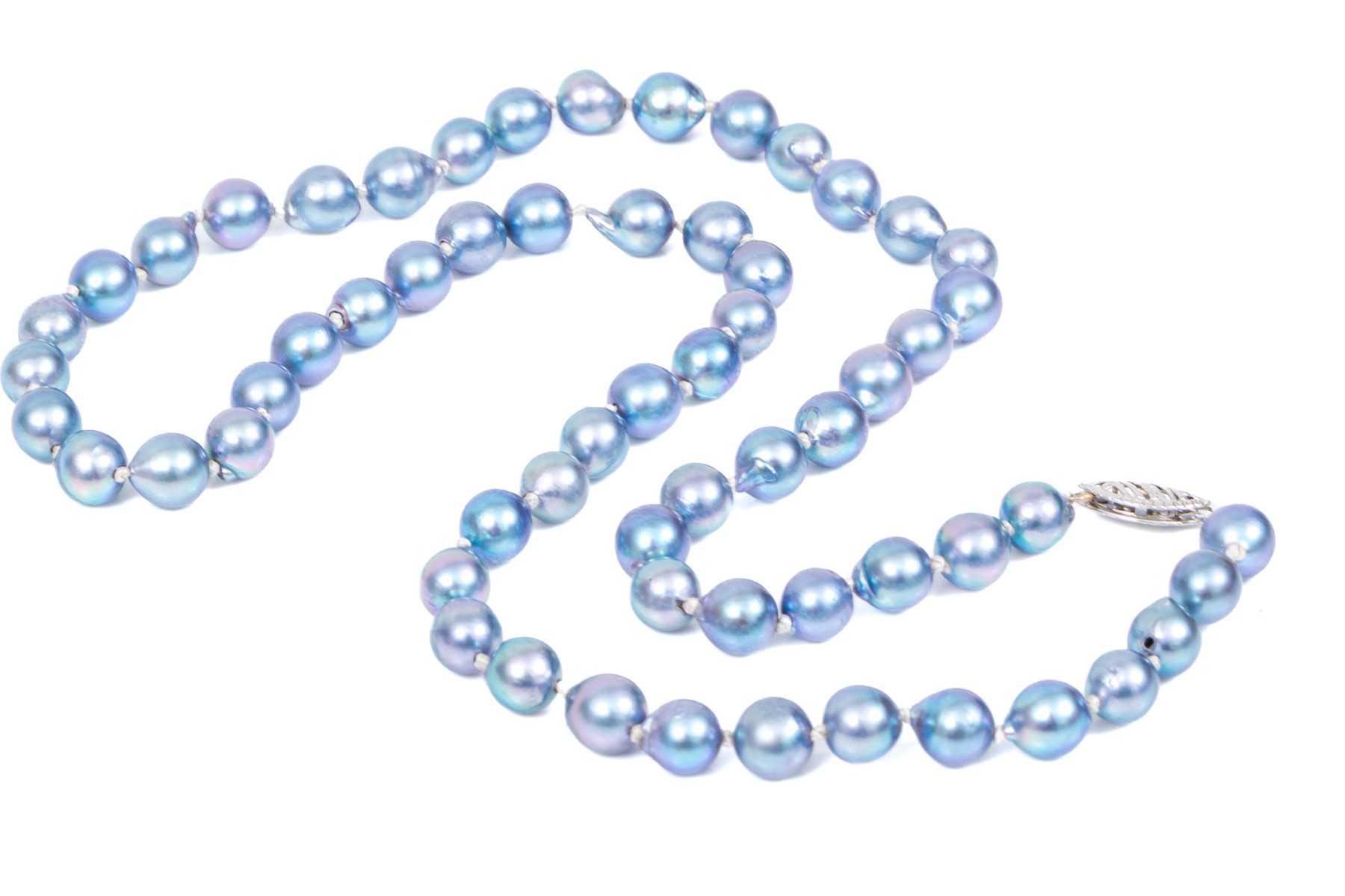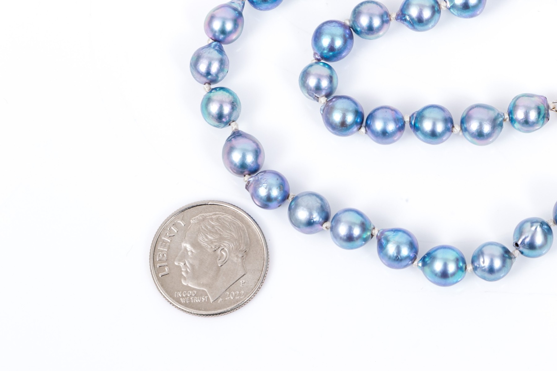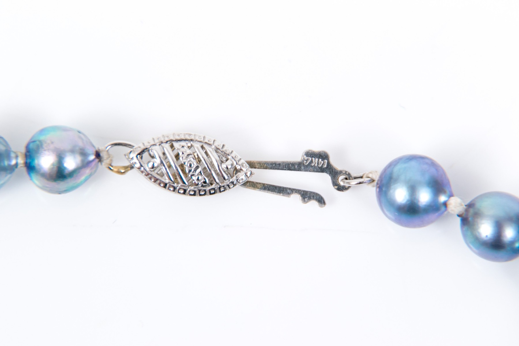 A strung strand of blue-grey cultured freshwater pearls, averaging 6.2mm. These baroque form pearls have a misty to good luster. Secures with a 14K white gold fish hook clasp.