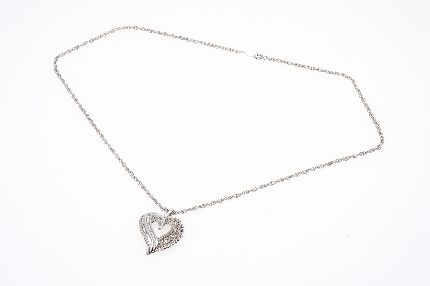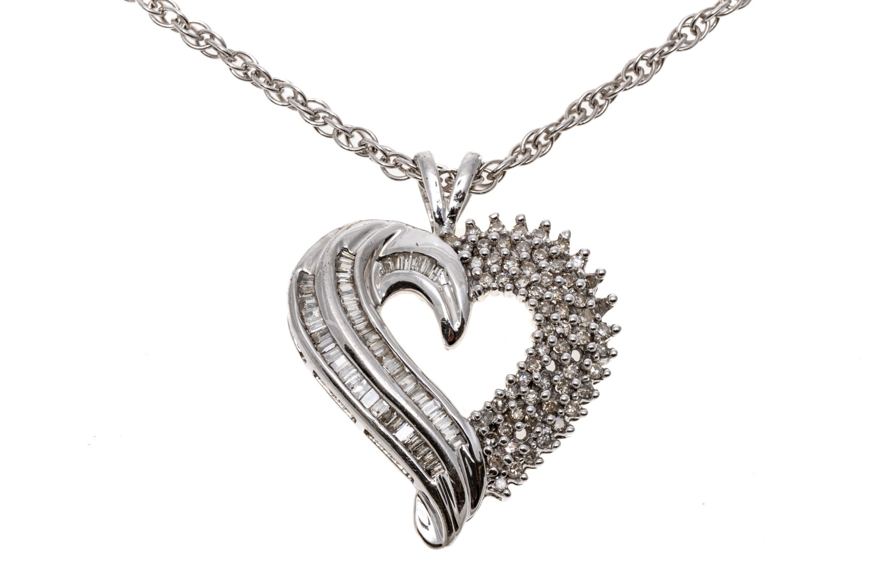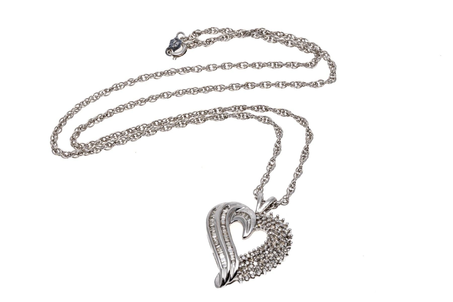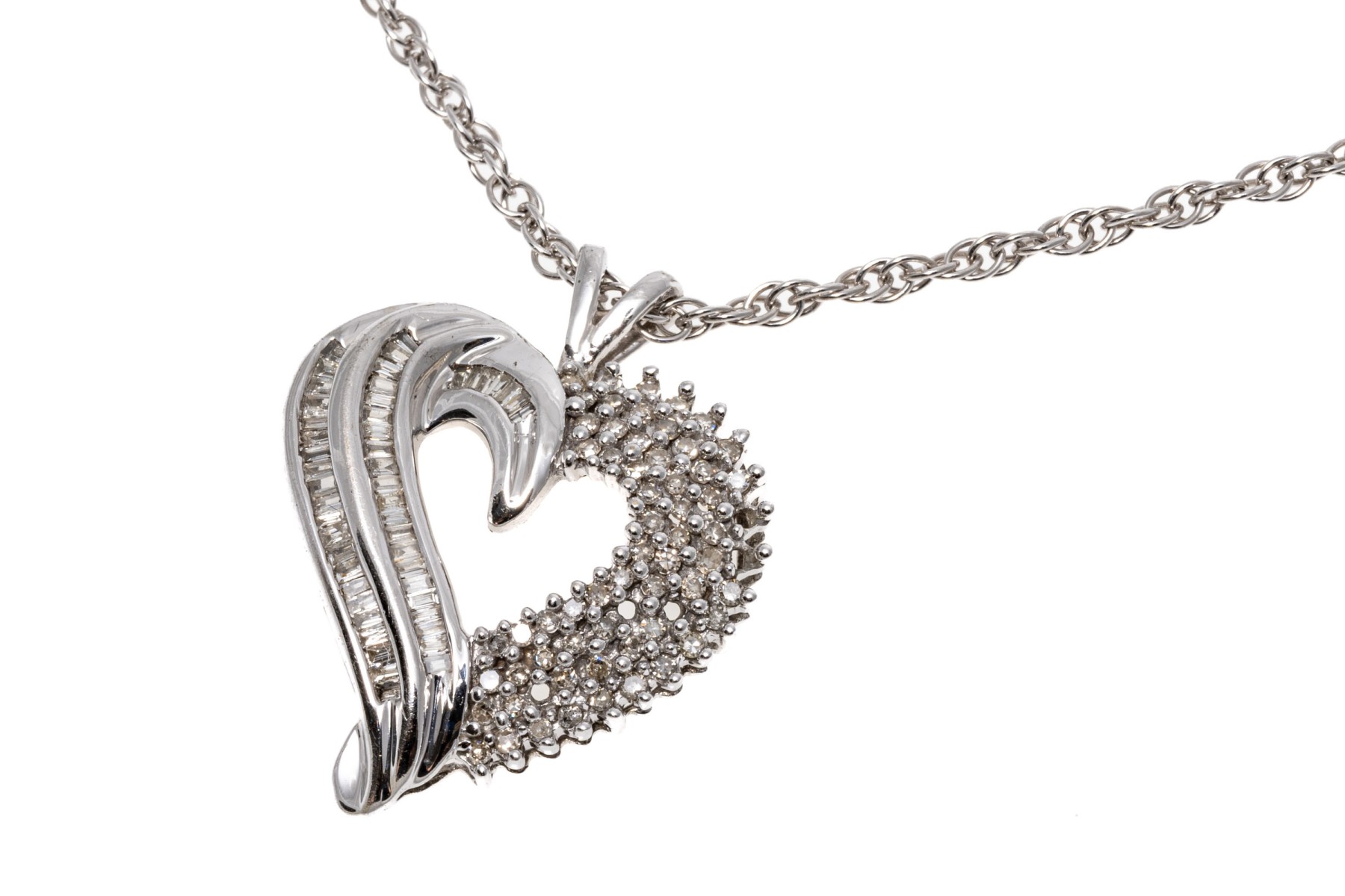 A beautiful white gold necklace displaying a heart pendant with baguette and round diamonds, hanging from a rope chain.