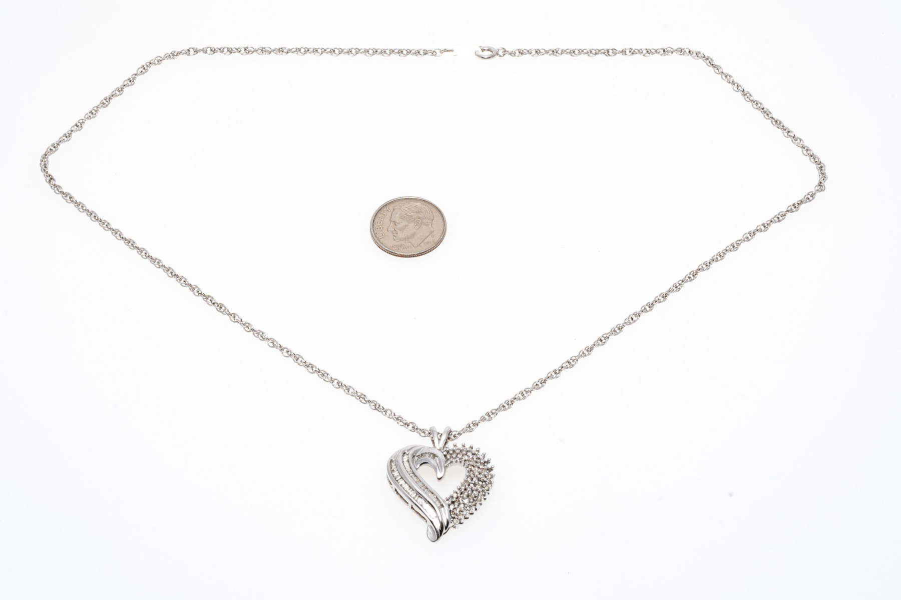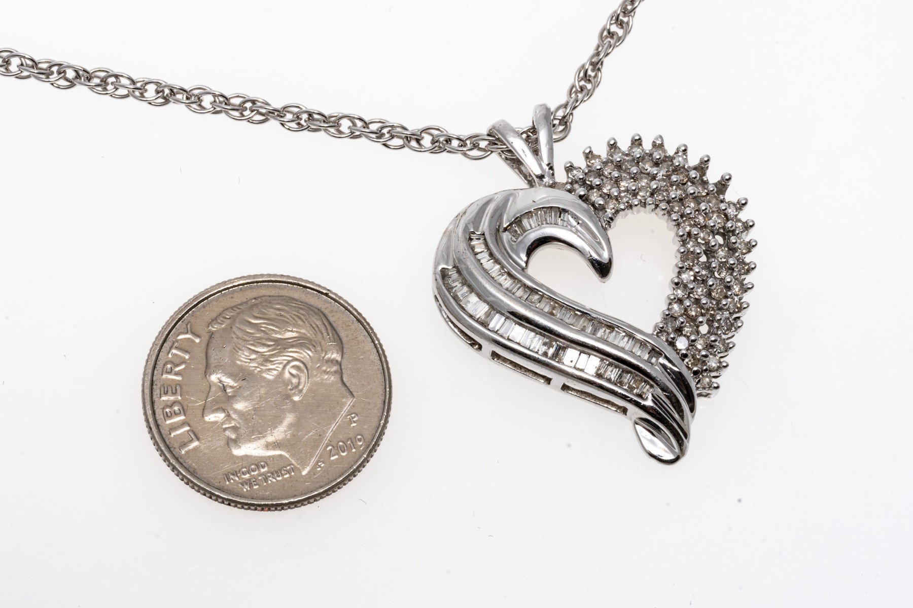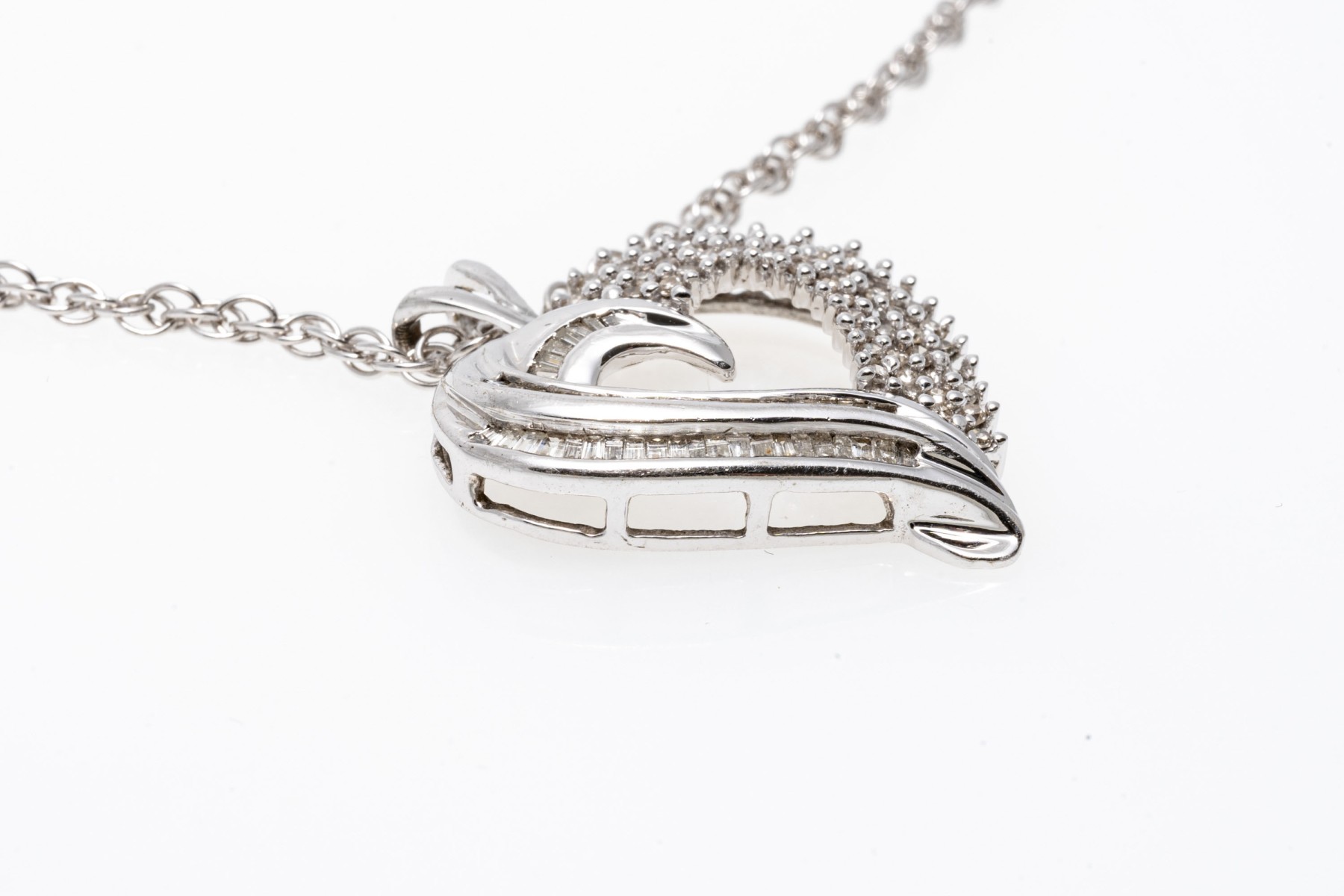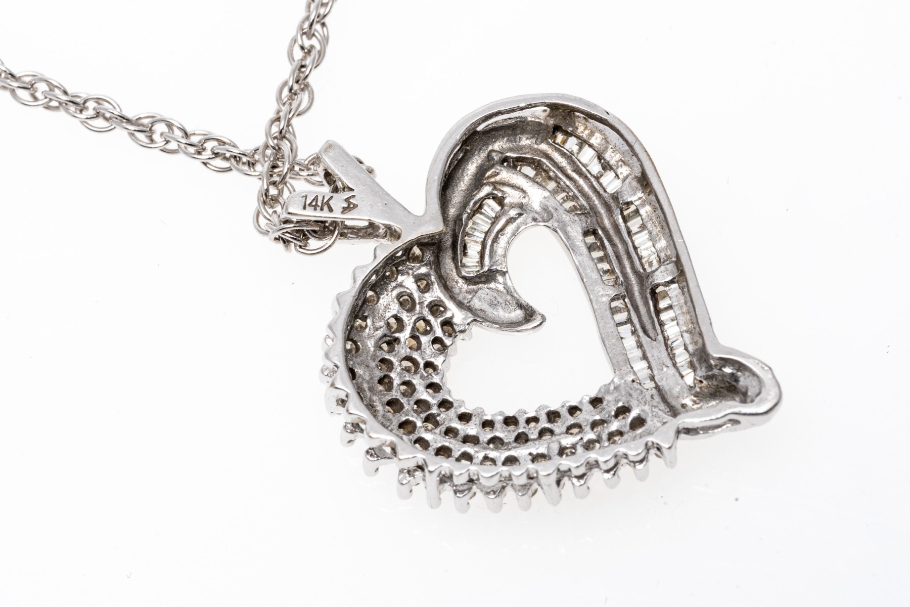 A beautiful white gold necklace displaying a heart pendant with baguette and round diamonds, hanging from a rope chain.