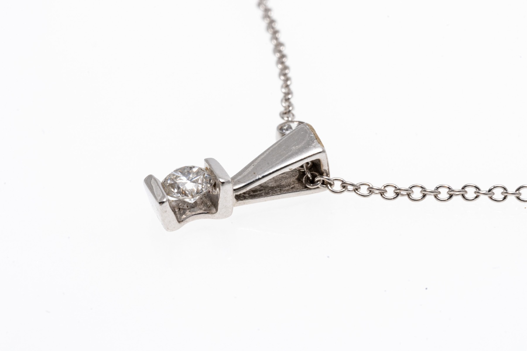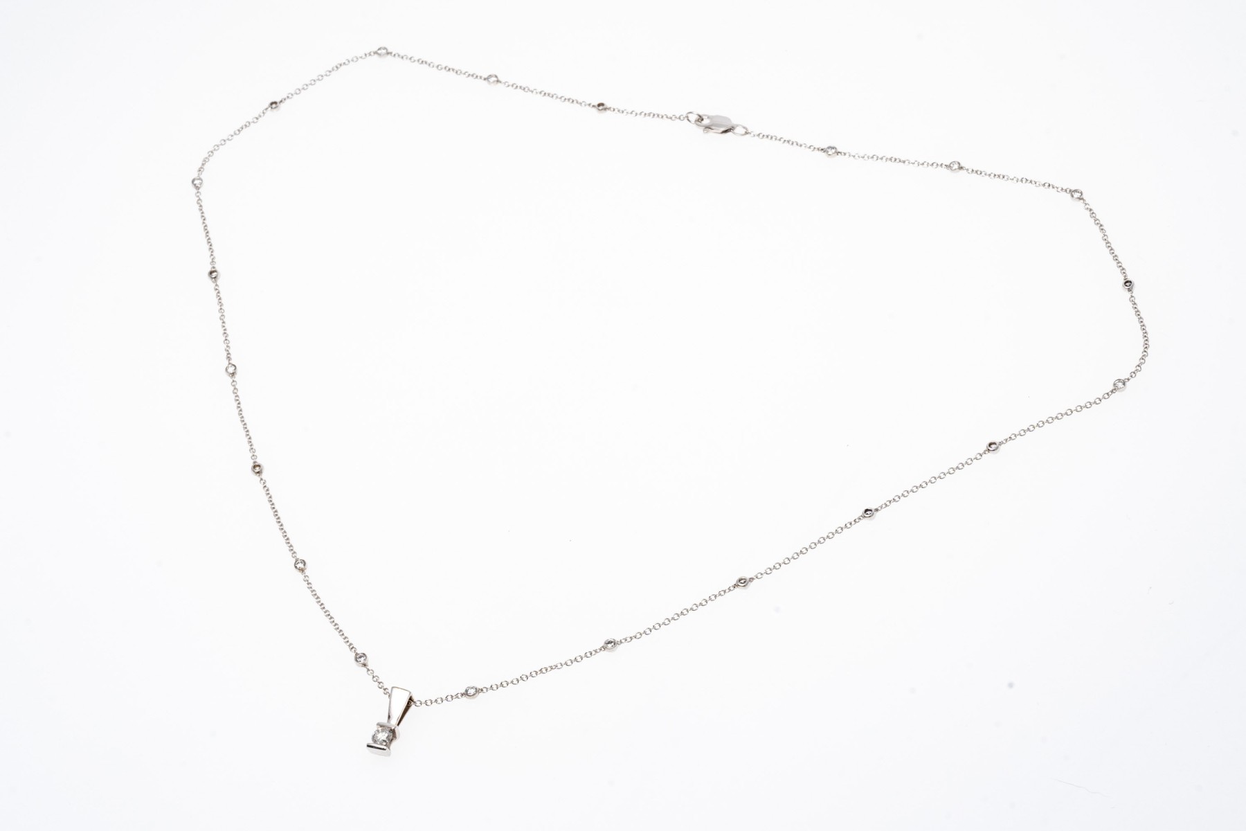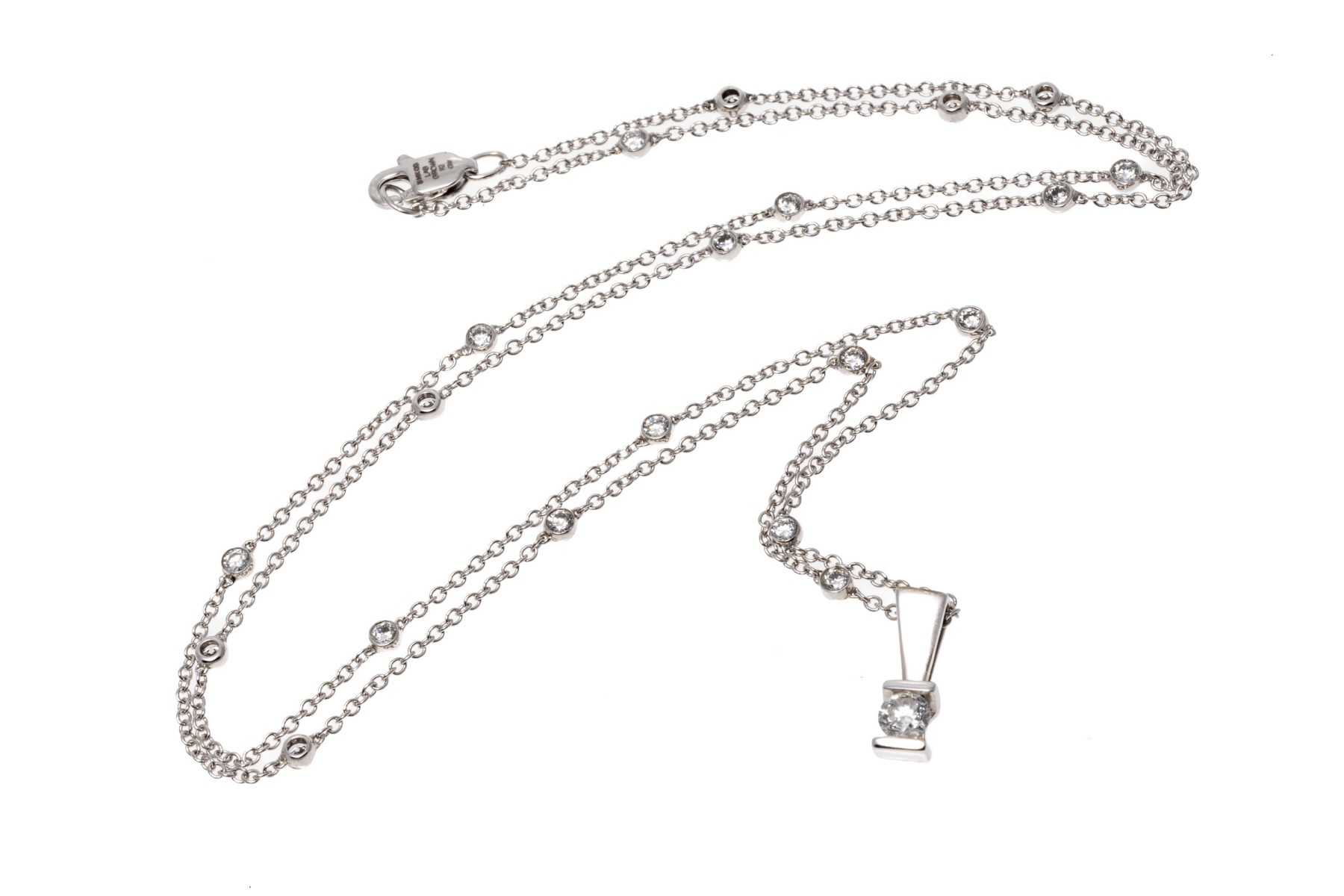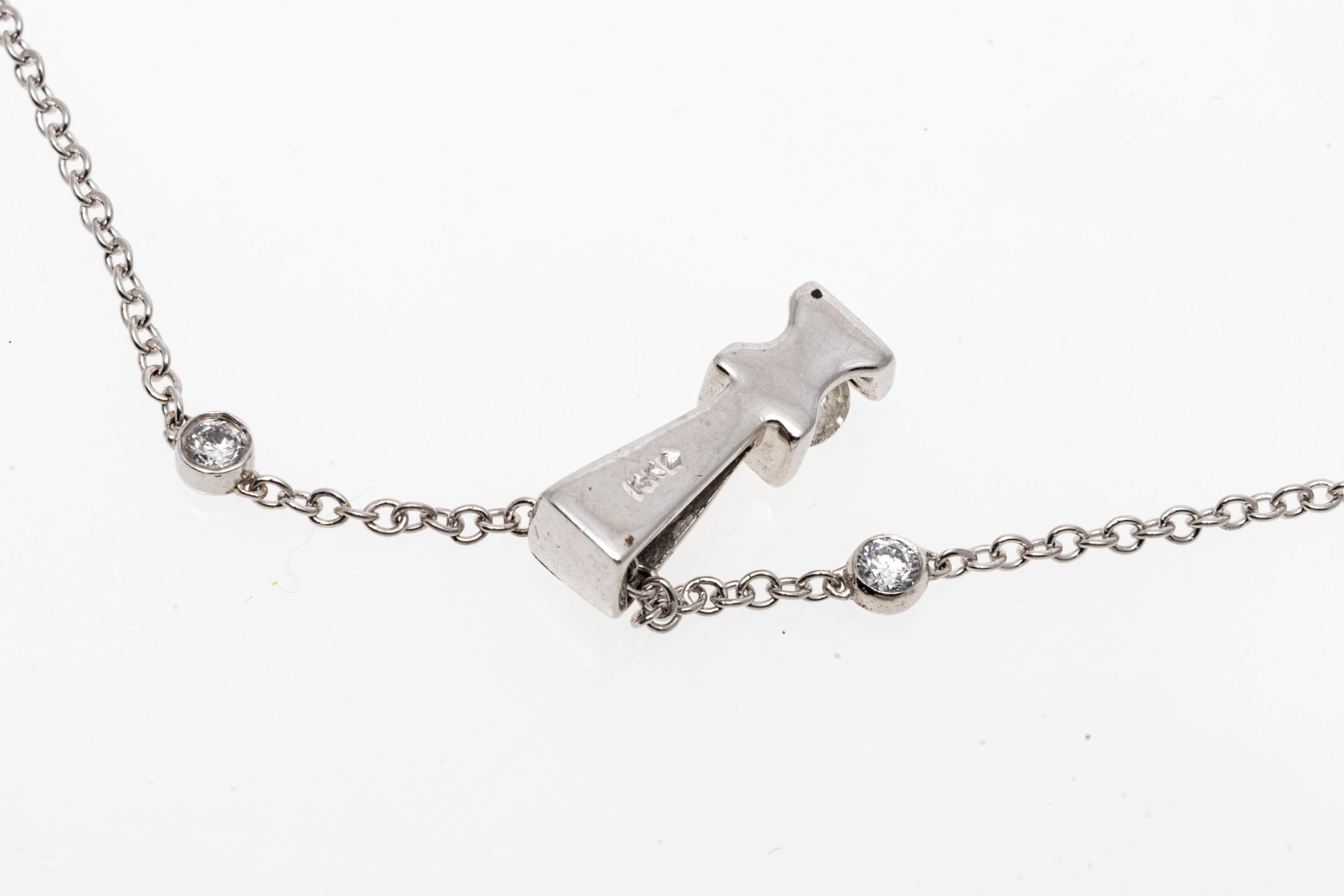 A dazzling white gold necklace displaying a cable chain dotted with bezel set diamonds, leading to a dainty pendant with a dramatic triangular bail leading to a round diamond.