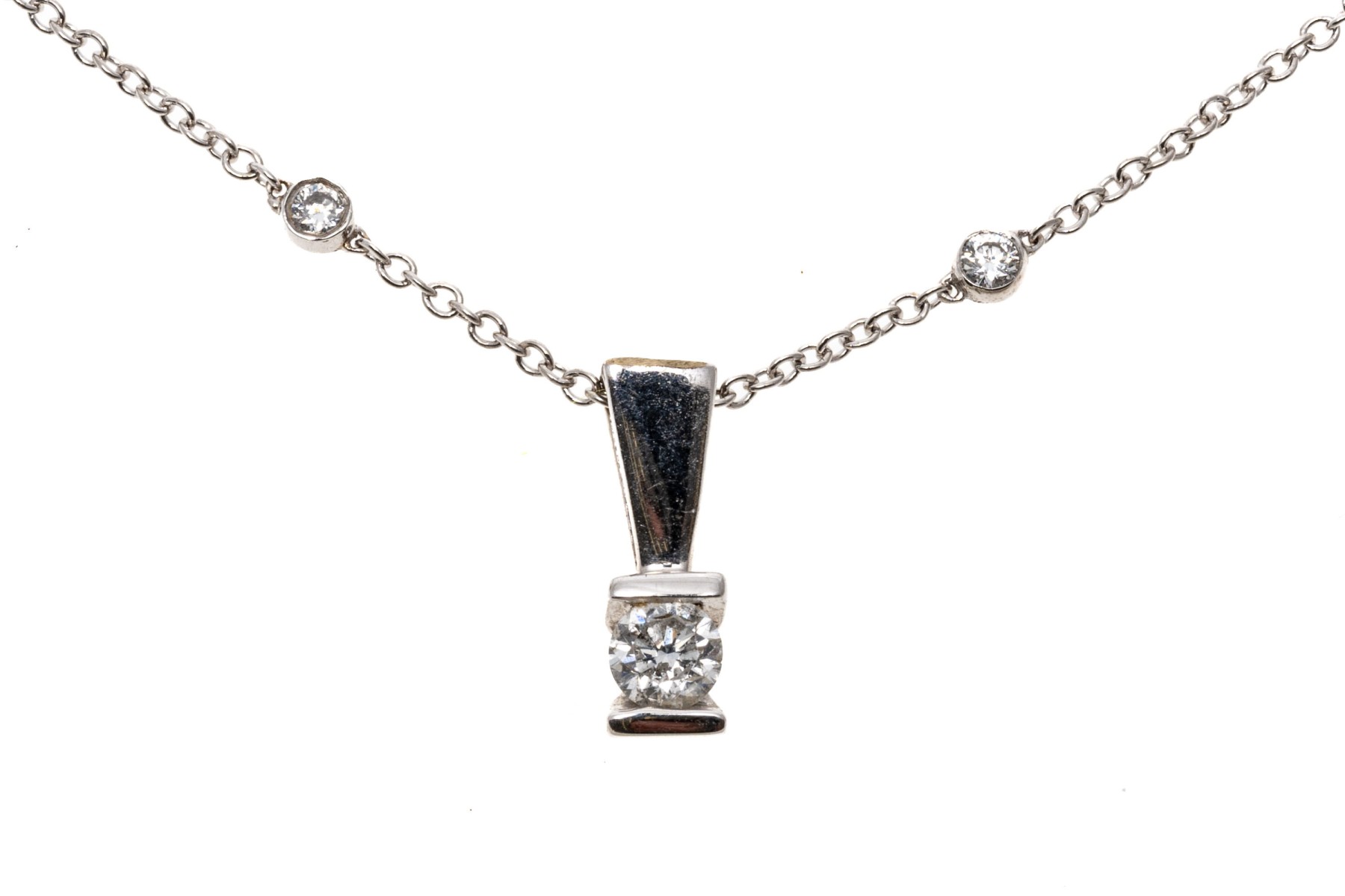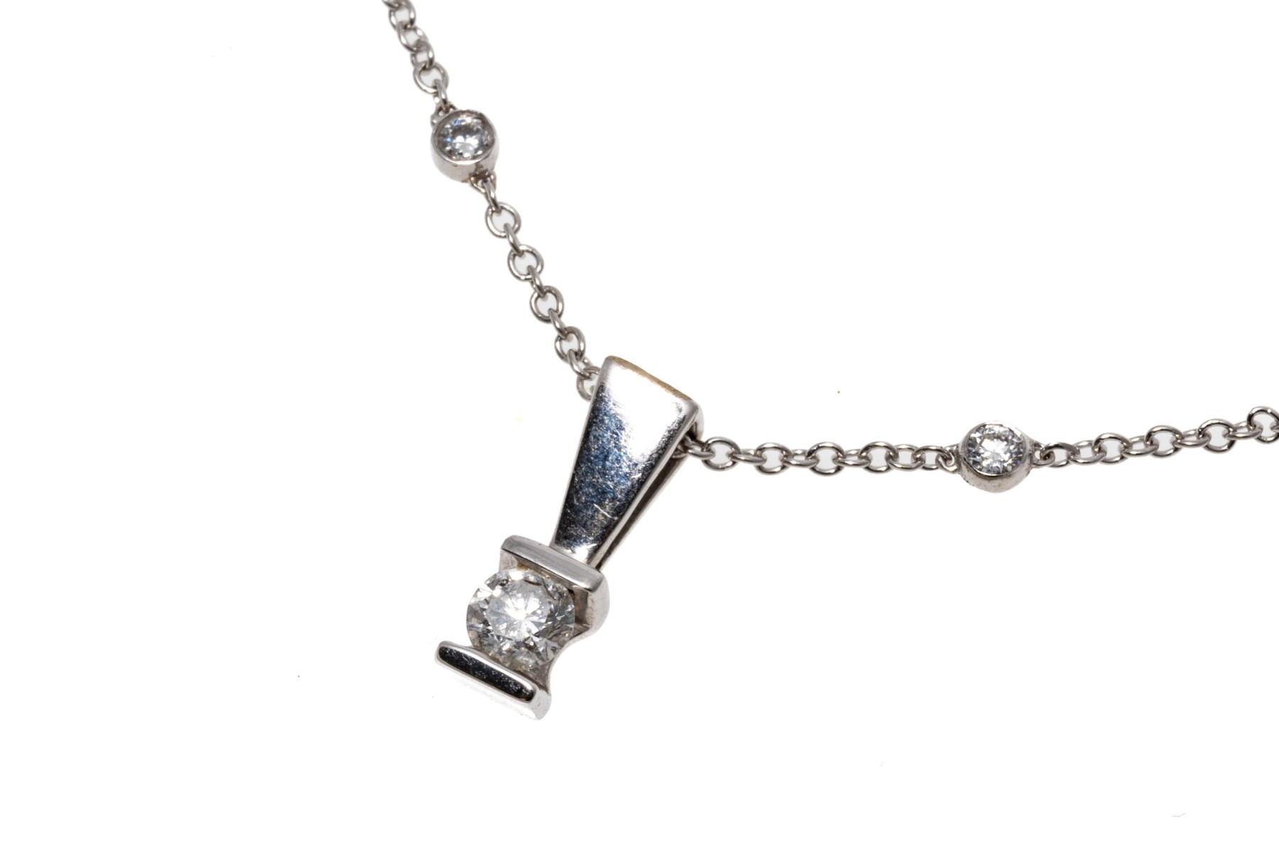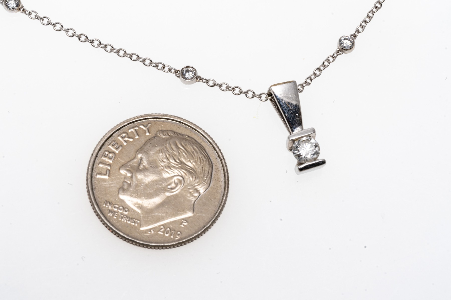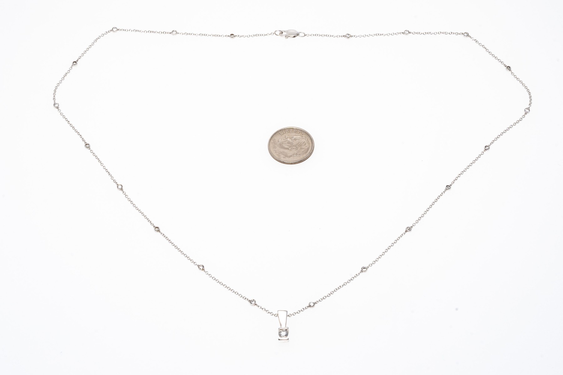 A dazzling white gold necklace displaying a cable chain dotted with bezel set diamonds, leading to a dainty pendant with a dramatic triangular bail leading to a round diamond.