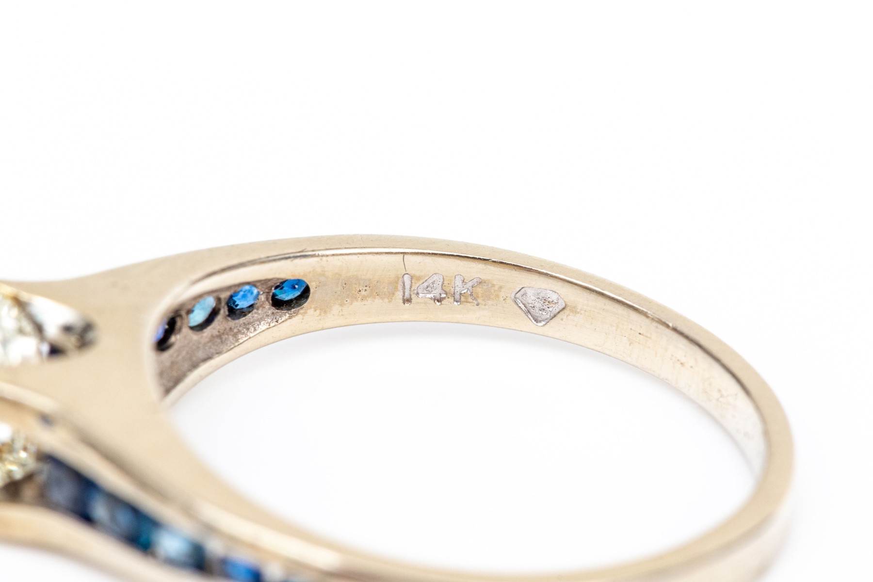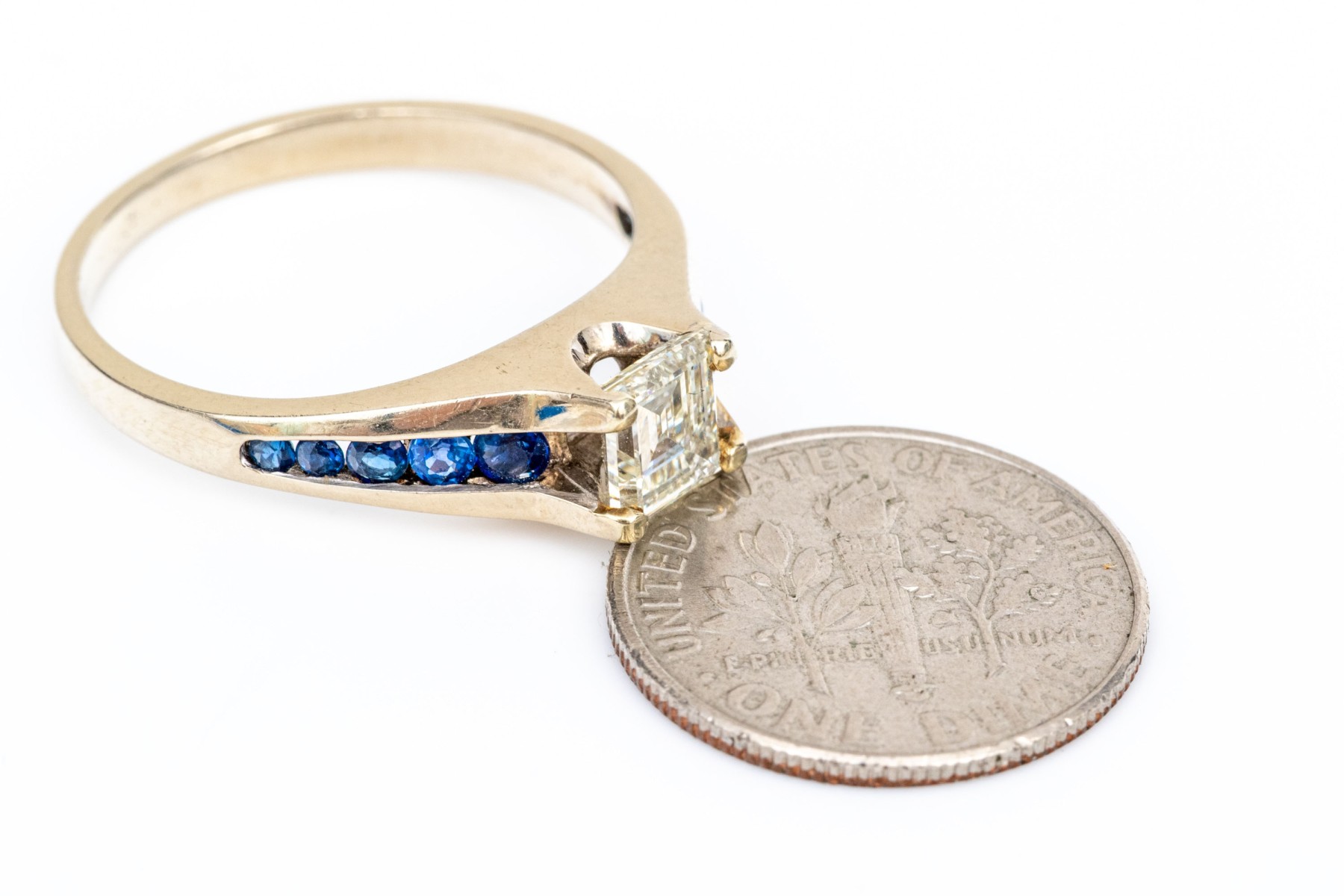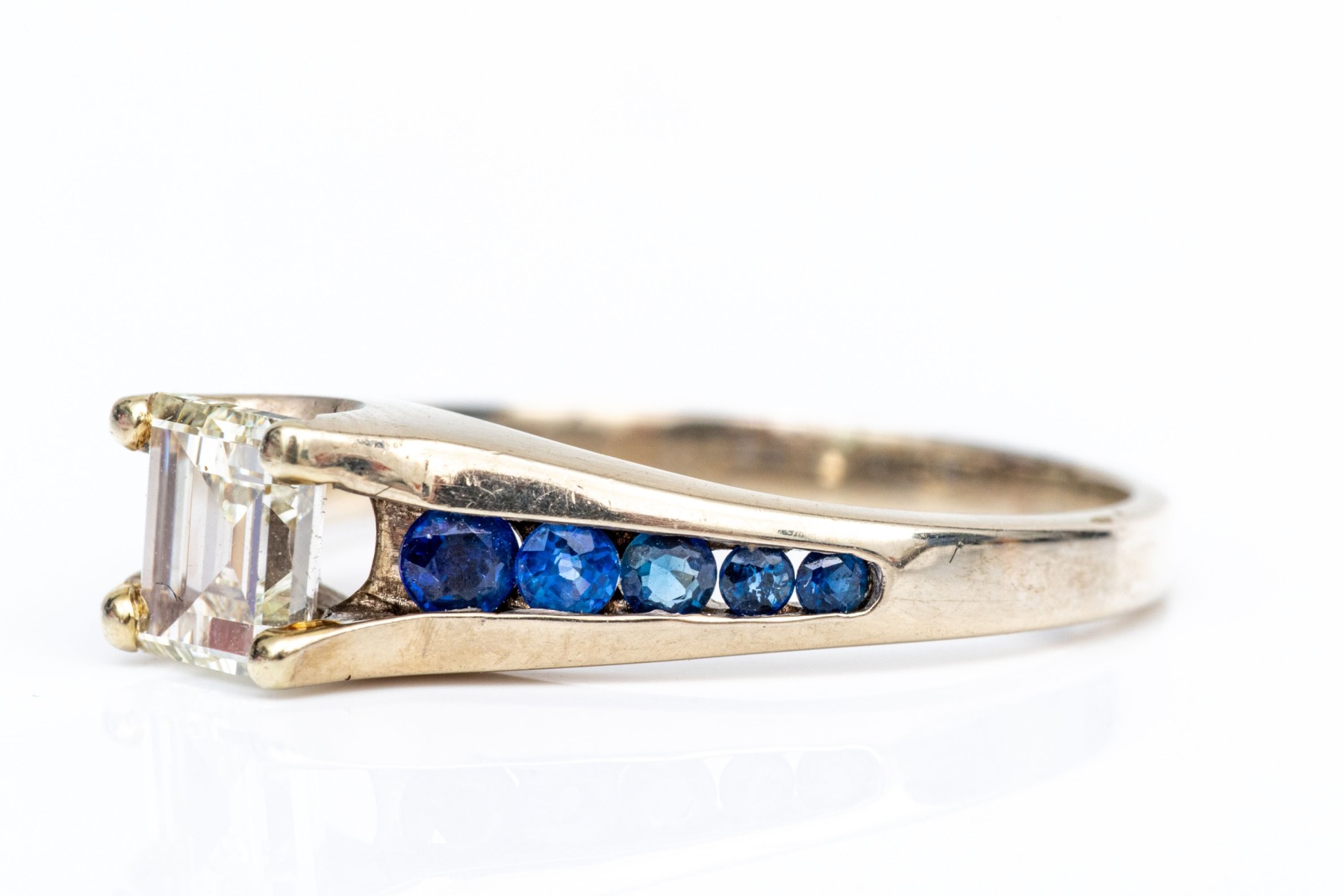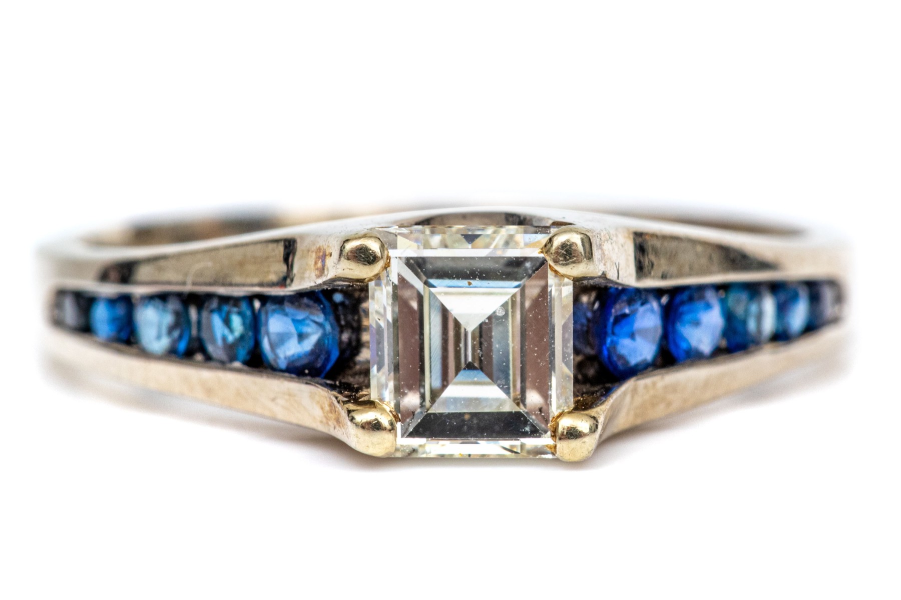 14k white gold asscher cut diamond ring, app. 0.72 CTS, with sapphires, size 8.5