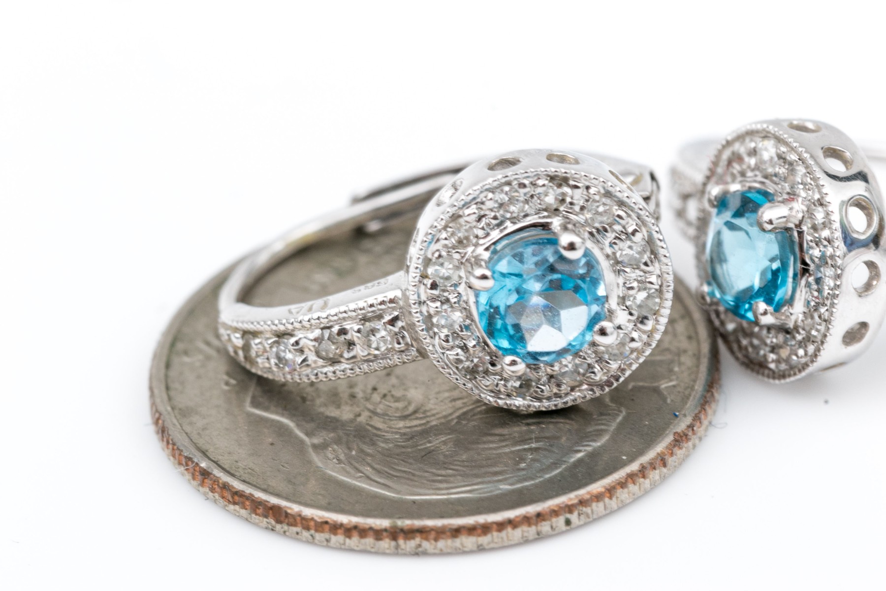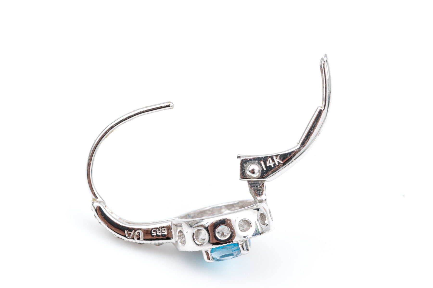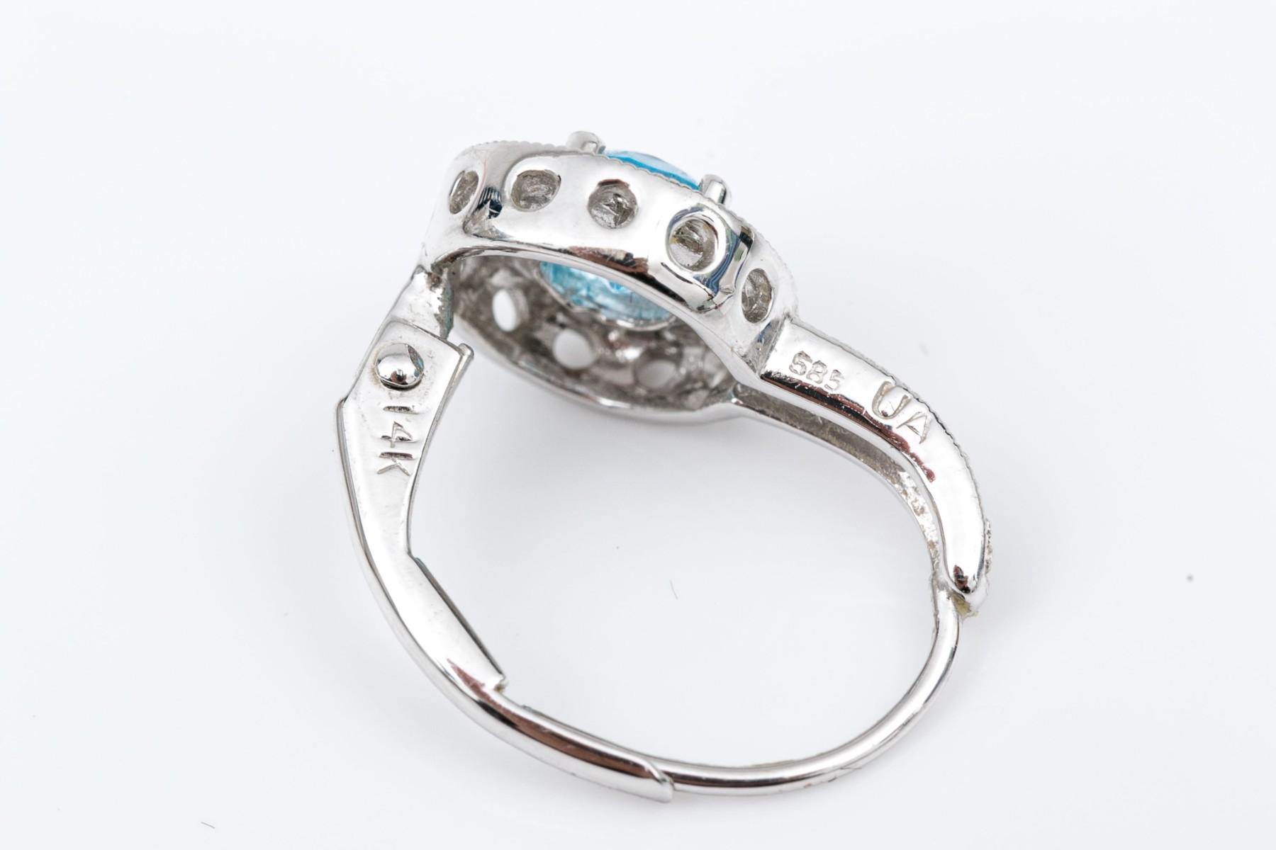 14k white gold beautiful blue topaz and diamond halo drop earrings, app. 0.50 TCW in round faceted blue topaz, and 0.06 TCW in round faceted diamonds. The earrings are finished by wires and lever style backs