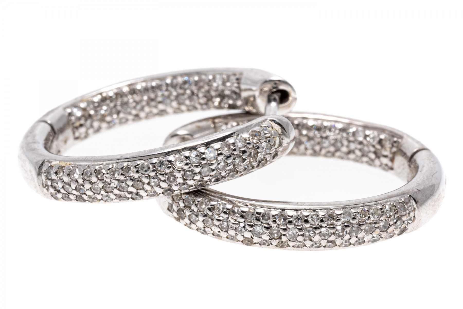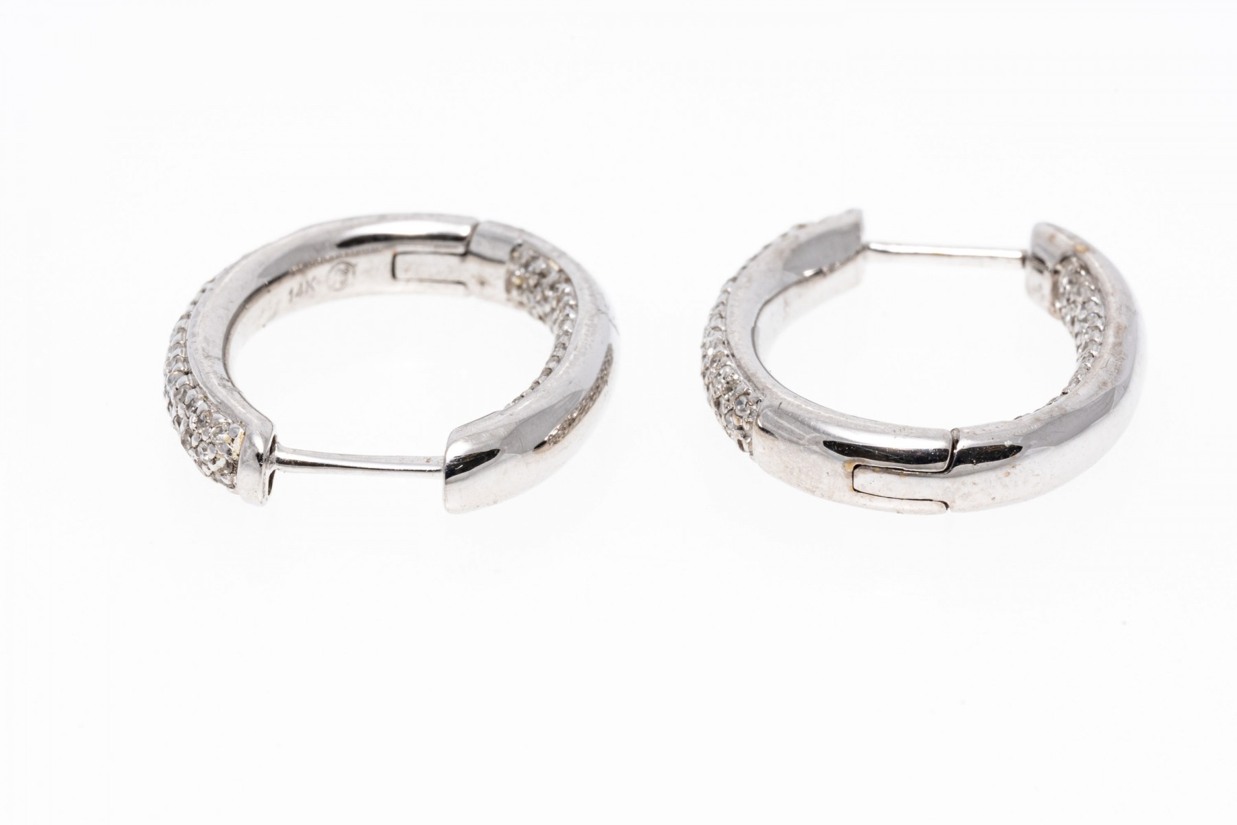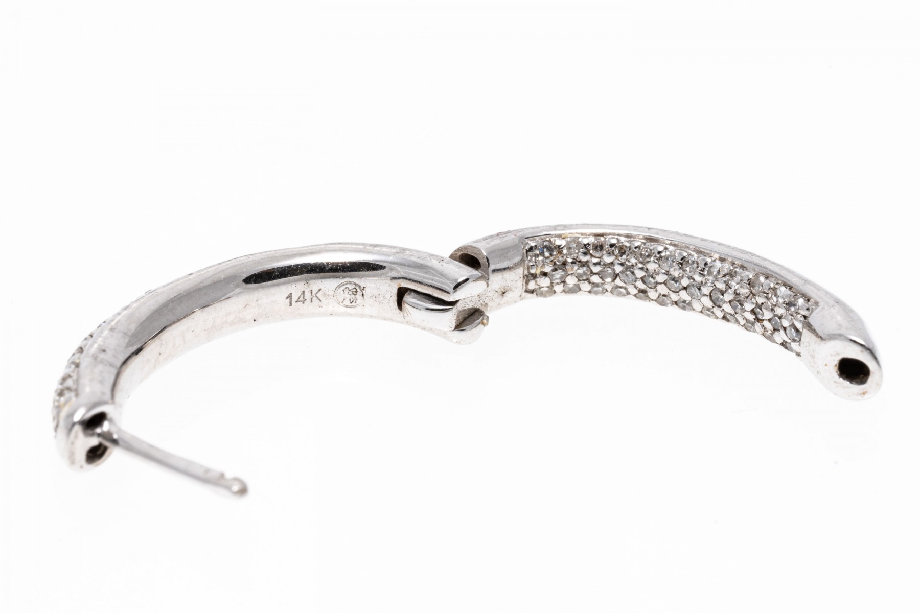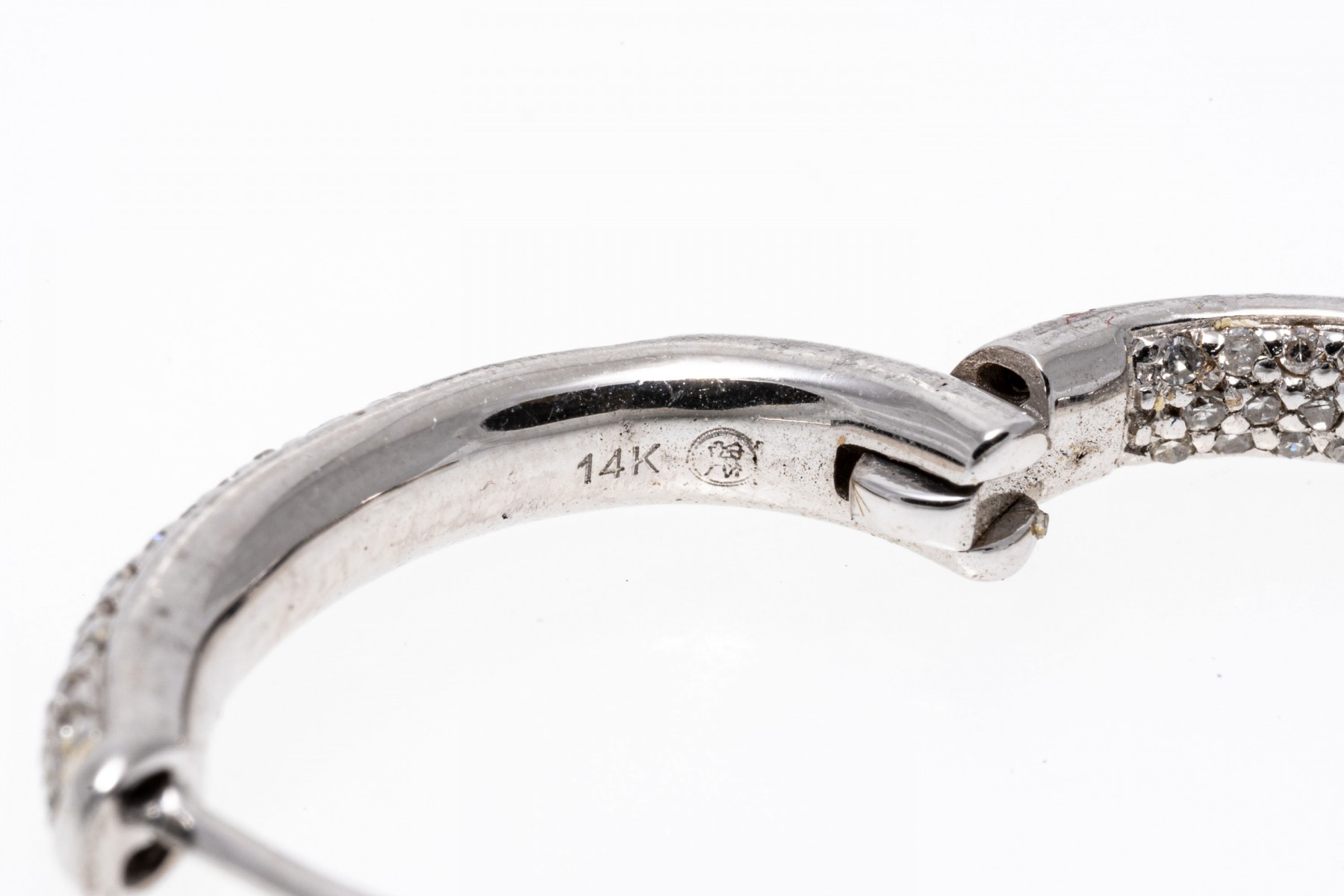 14K white gold earrings. These beautiful contemporary earrings are a hoop style, pave set with round faceted diamonds, approximately 0.41 TCW. The earrings are finished with posts and hinged snap style backs.