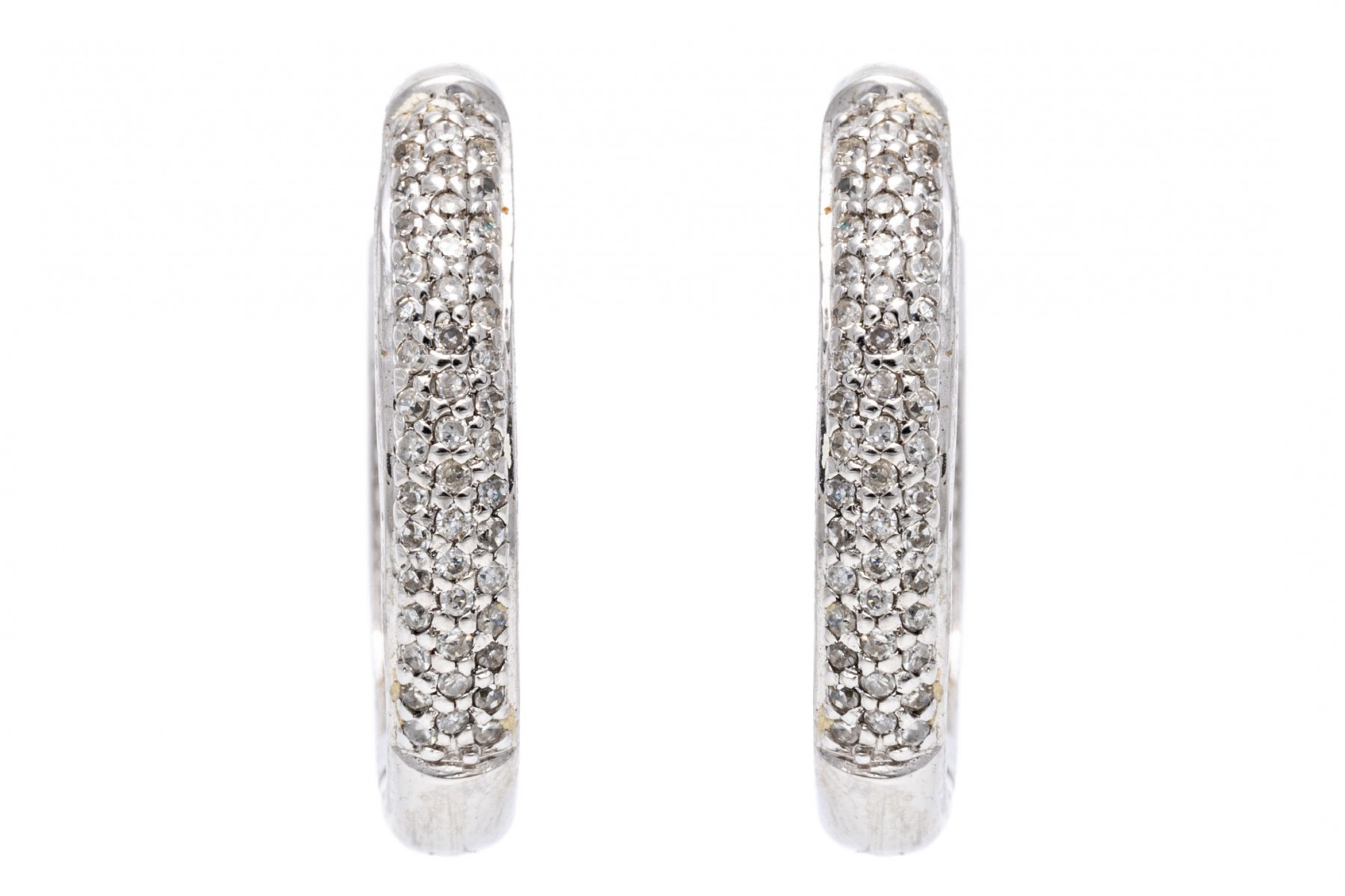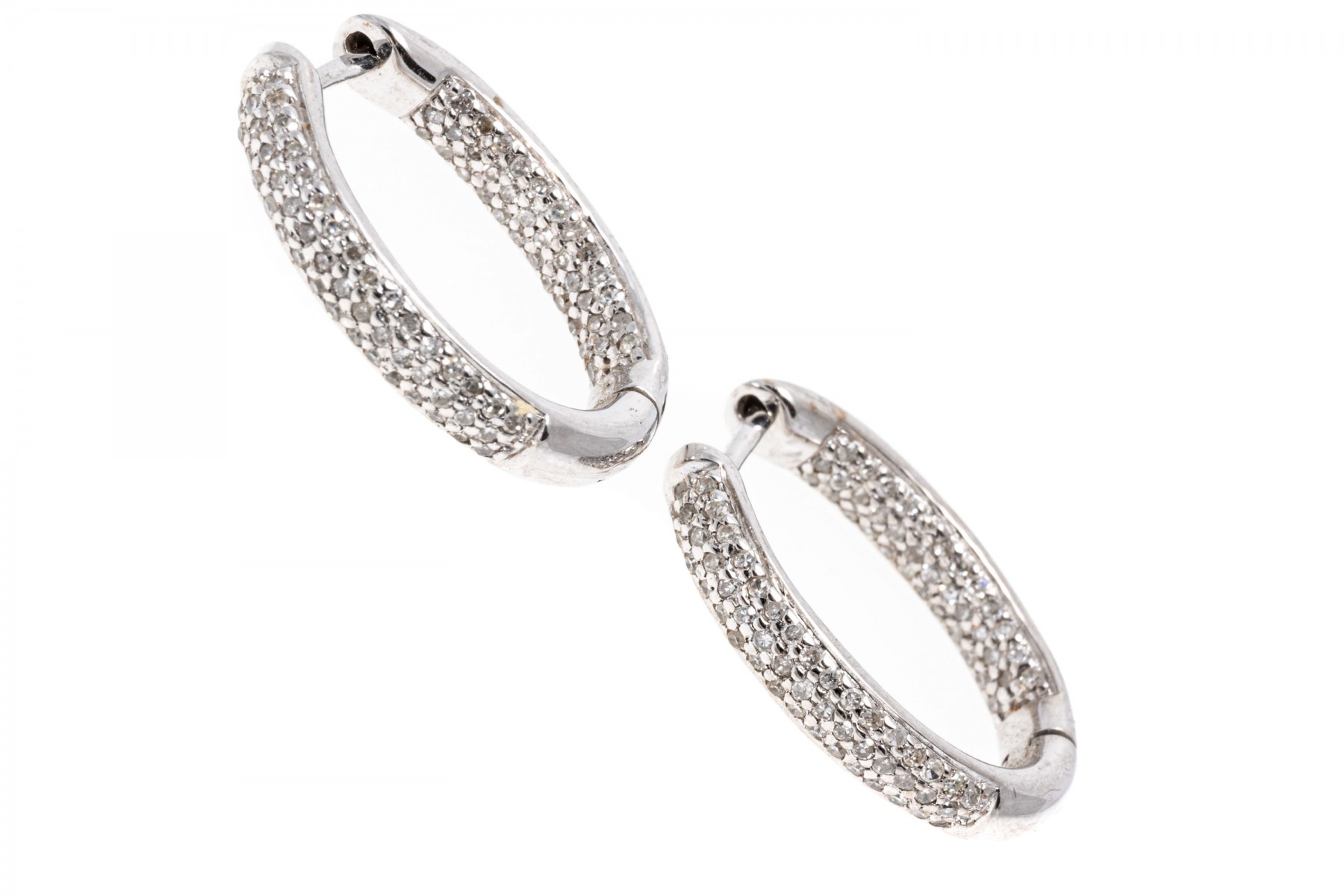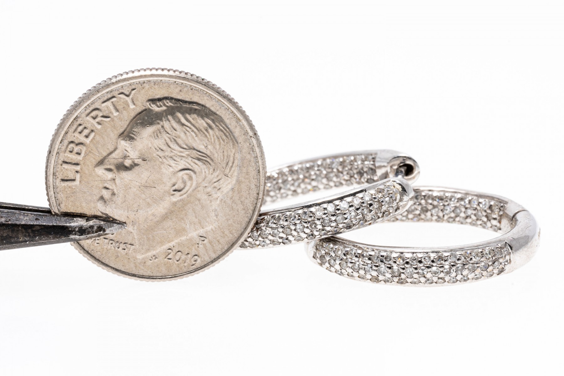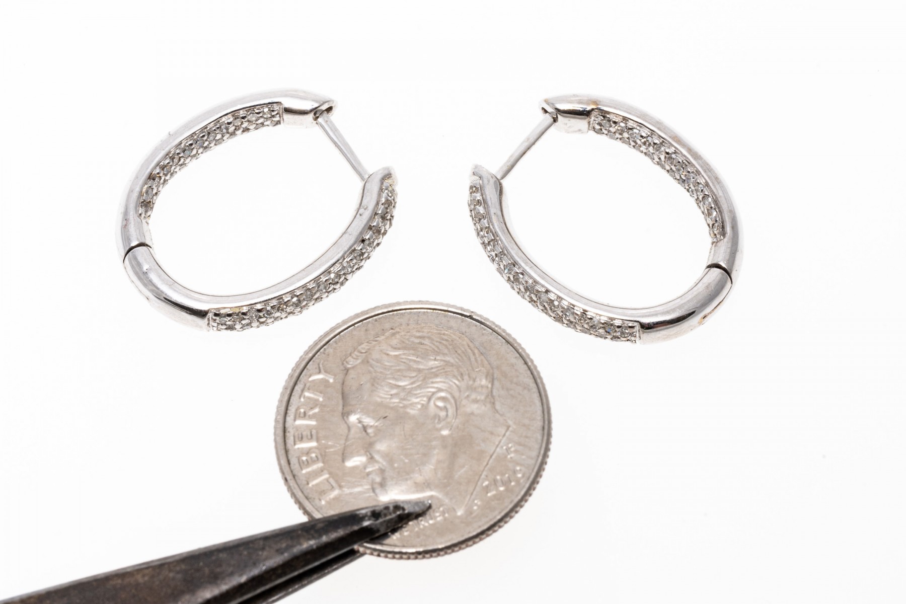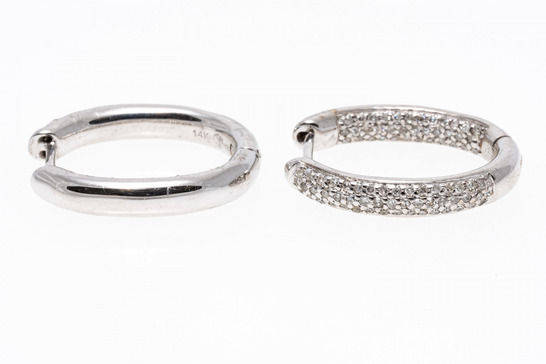 14K white gold earrings. These beautiful contemporary earrings are a hoop style, pave set with round faceted diamonds, approximately 0.41 TCW. The earrings are finished with posts and hinged snap style backs.