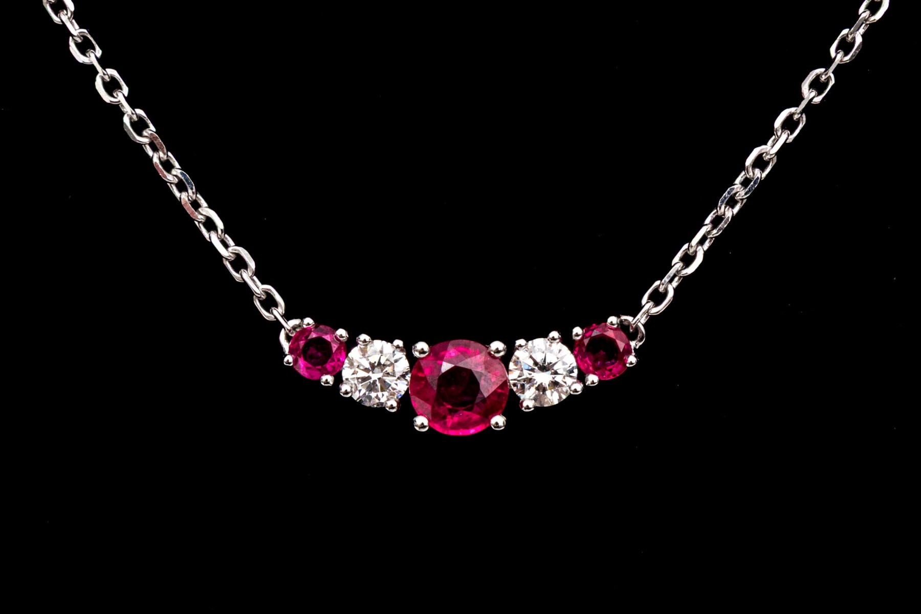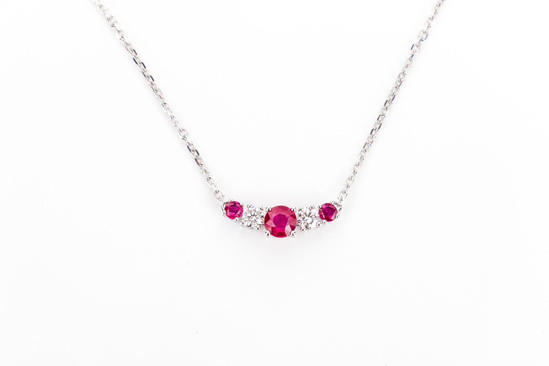 14k white gold beautiful graduated ruby and diamond necklace, app. 0.63 TCW in rubies, app. 0.12 TCW in diamonds,, finished with a lobster claw style clasp