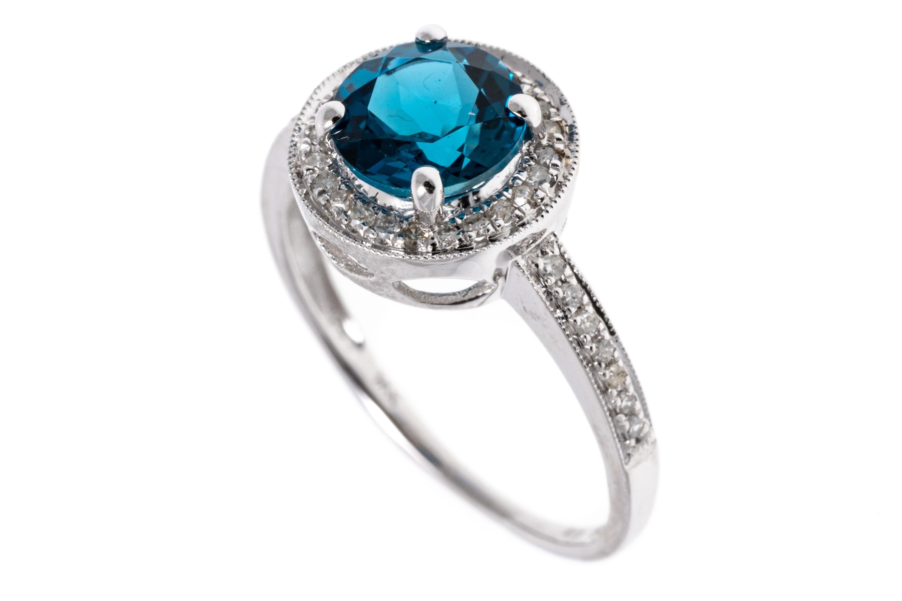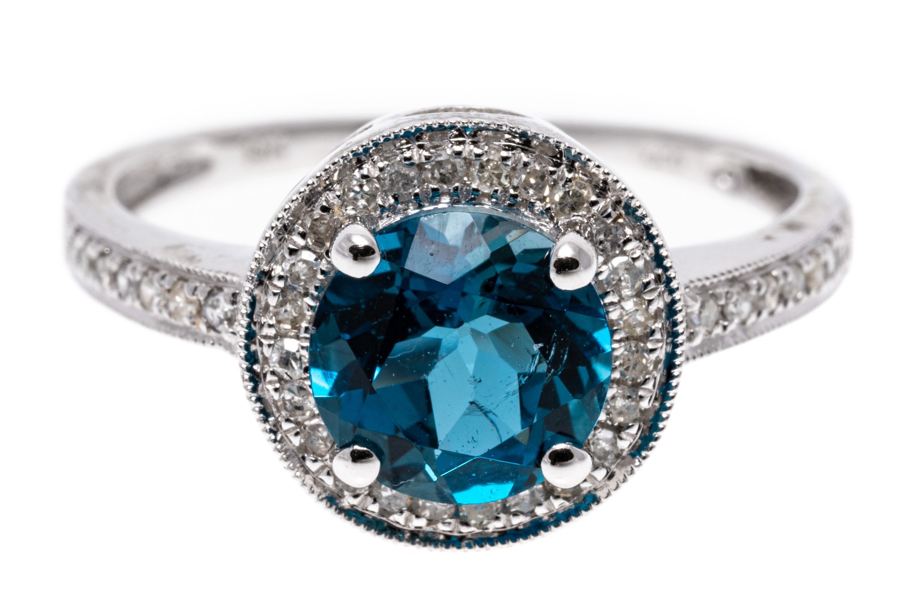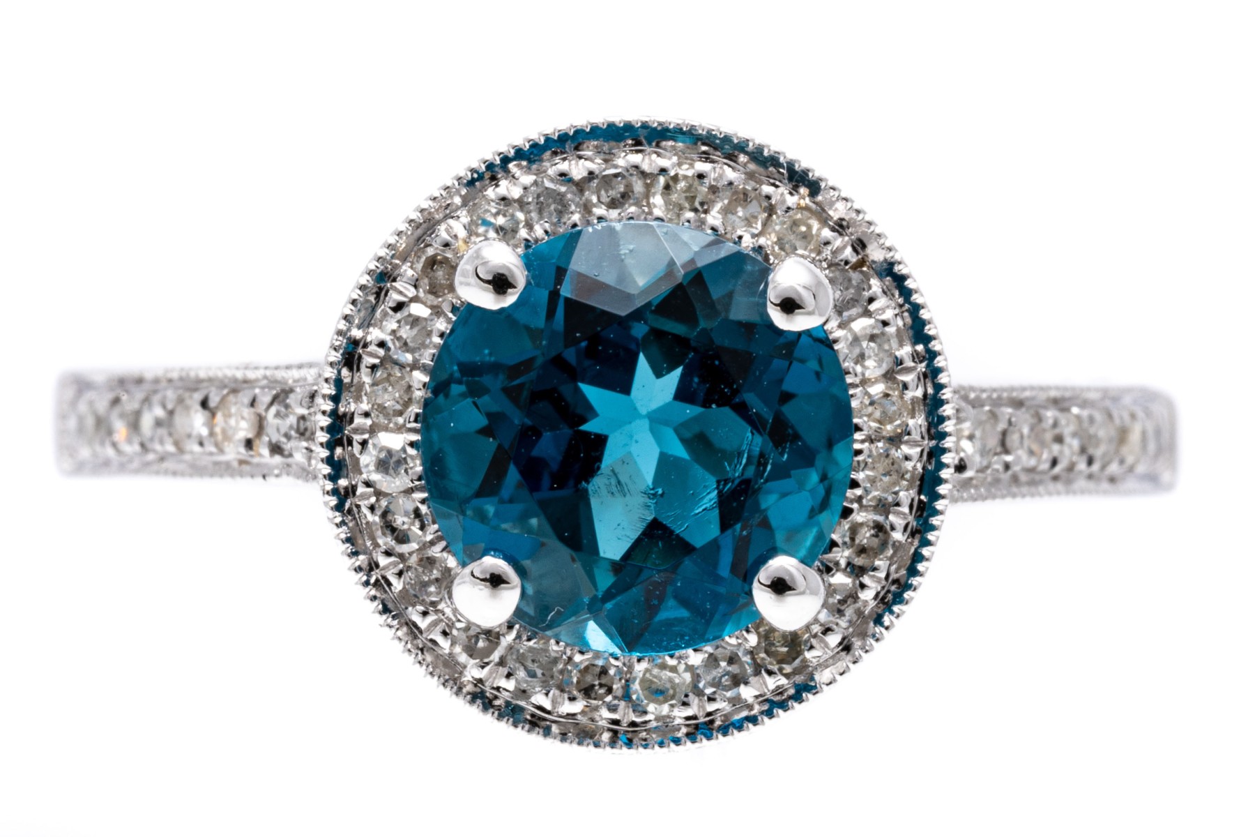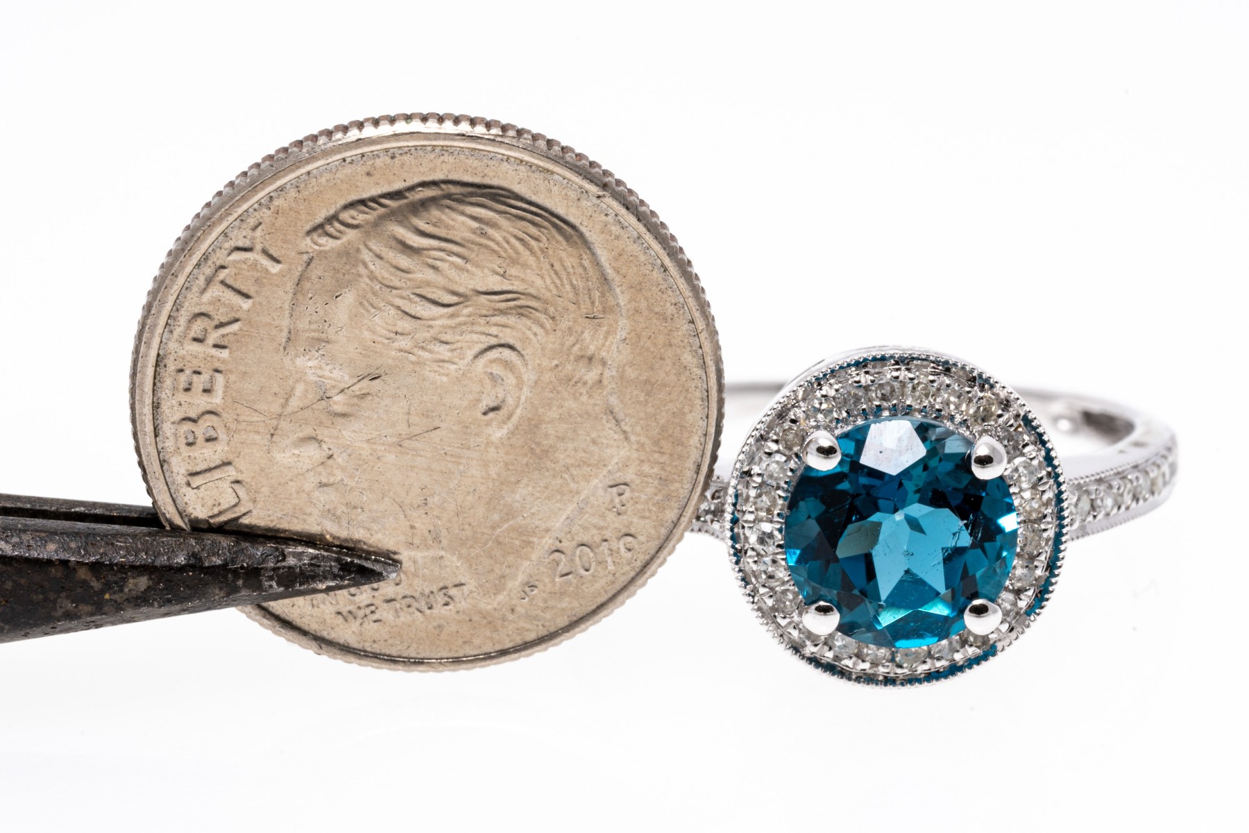 14k white gold ring. This beautiful ring has a center round faceted, medium to dark blue color blue topaz, approximately 1.55 CTS, prong set. Surrounding the center is a halo of round faceted diamonds, which lead into the shank, approximately 0.09 TCW, prong set.