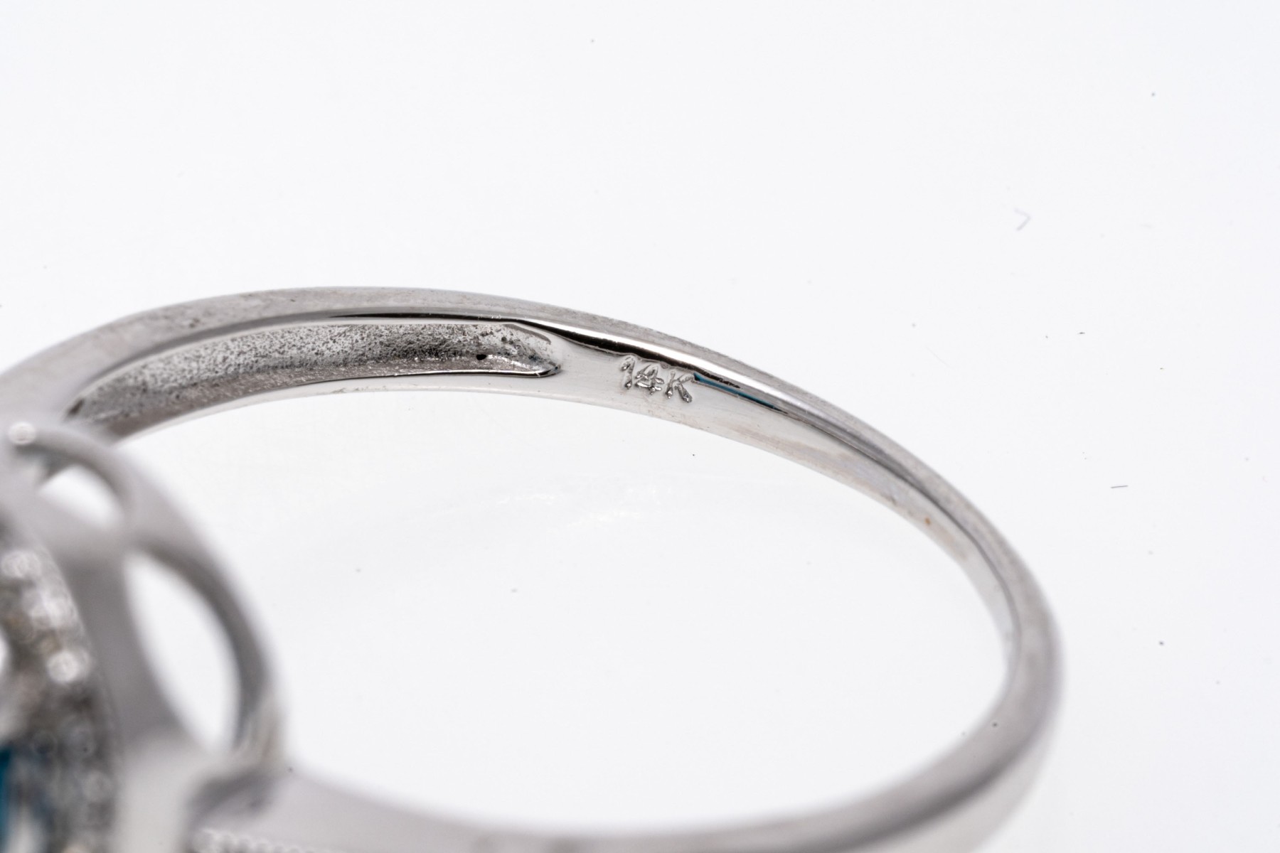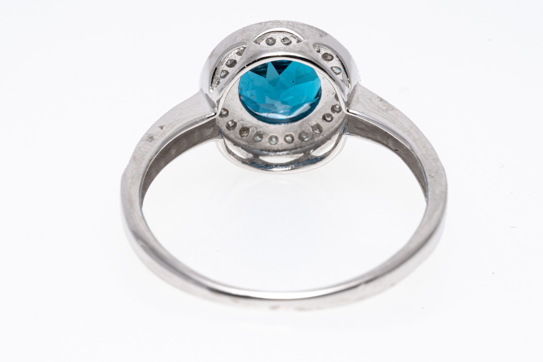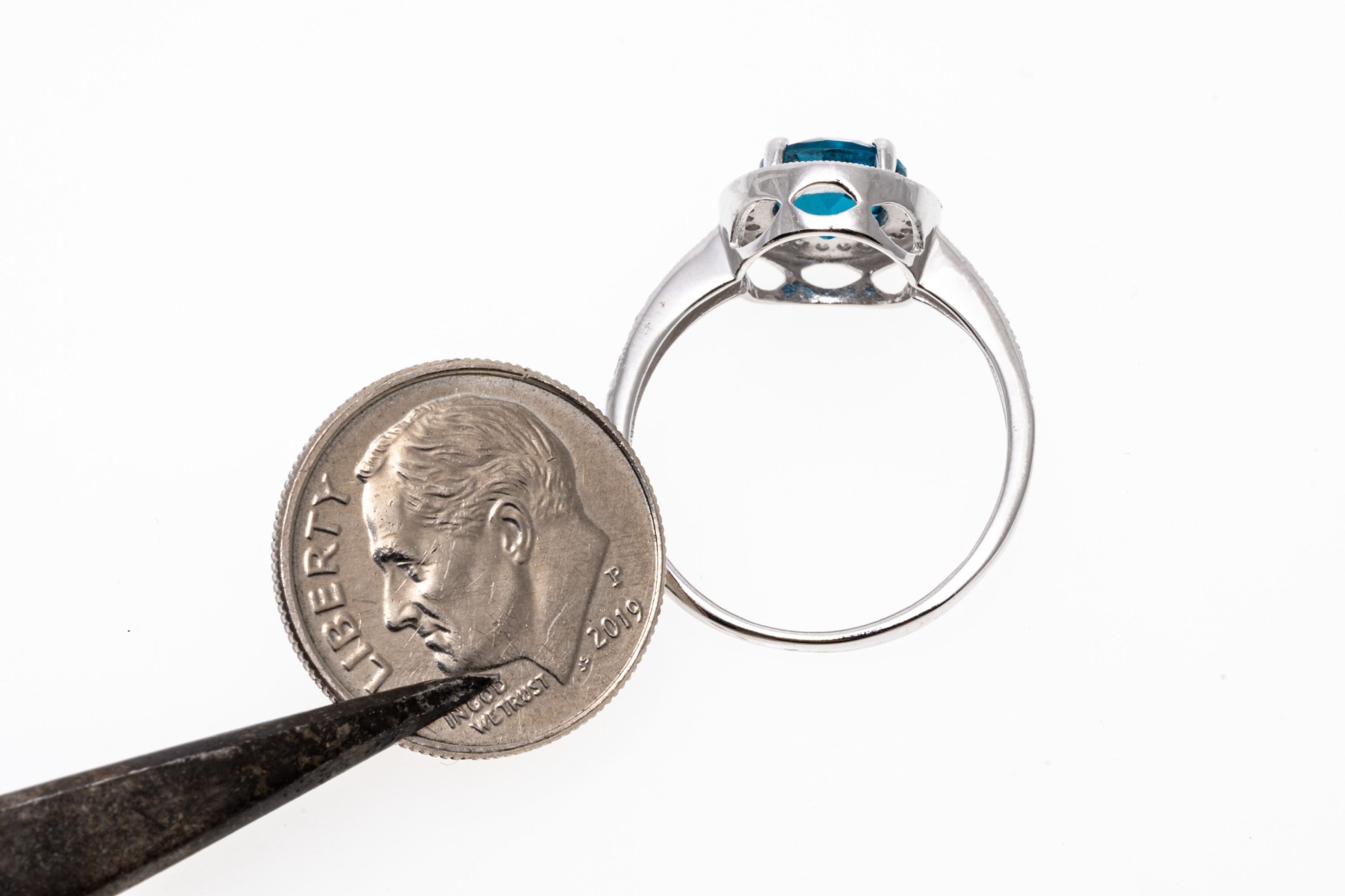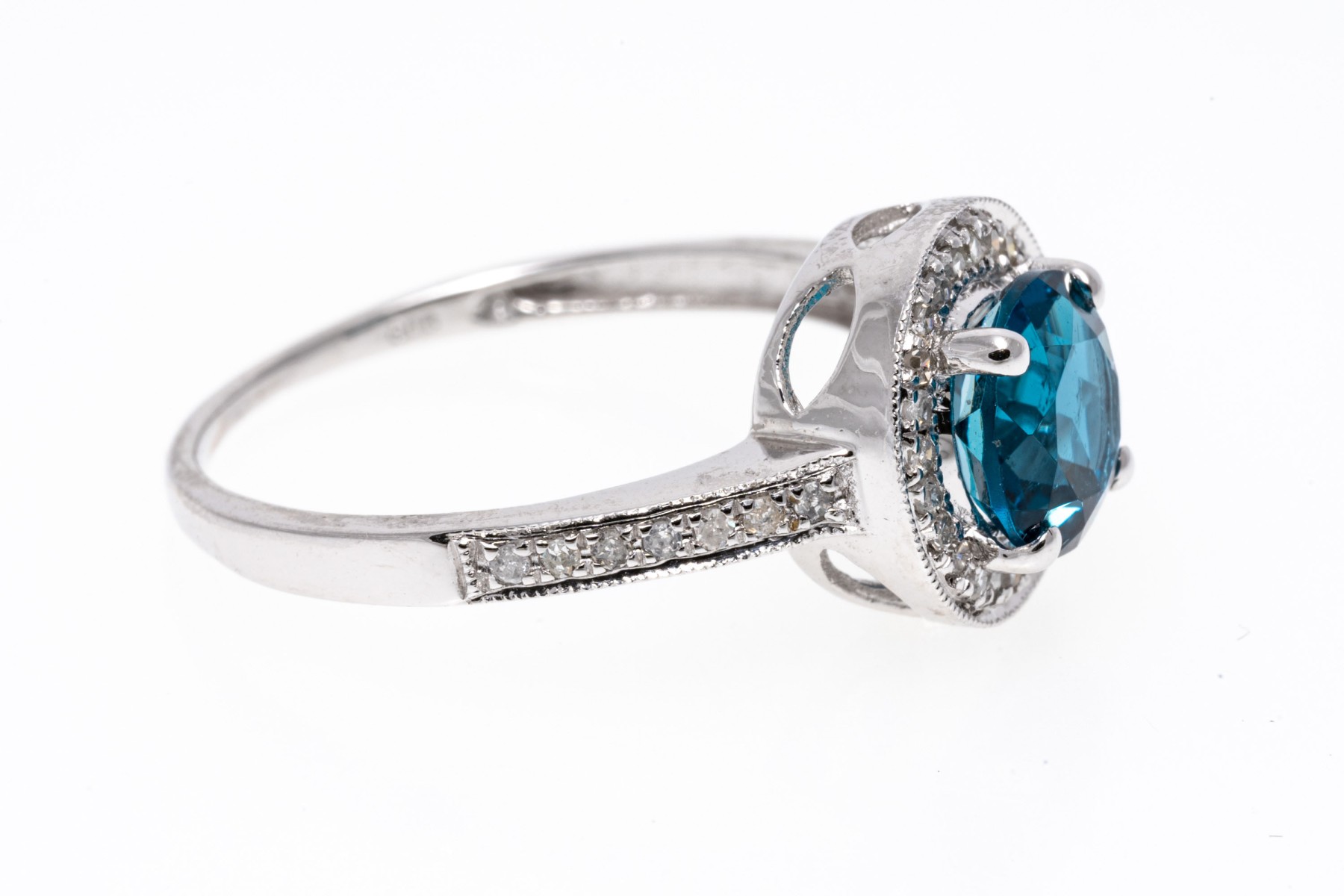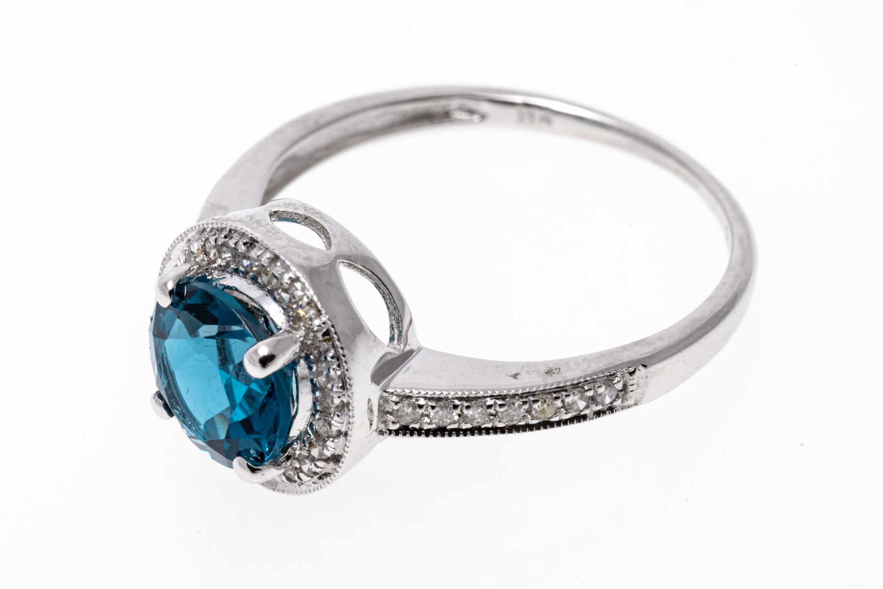 14k white gold ring. This beautiful ring has a center round faceted, medium to dark blue color blue topaz, approximately 1.55 CTS, prong set. Surrounding the center is a halo of round faceted diamonds, which lead into the shank, approximately 0.09 TCW, prong set.