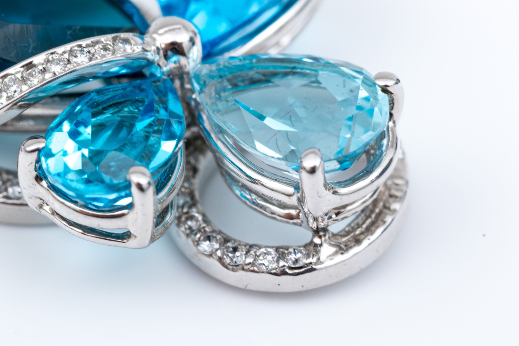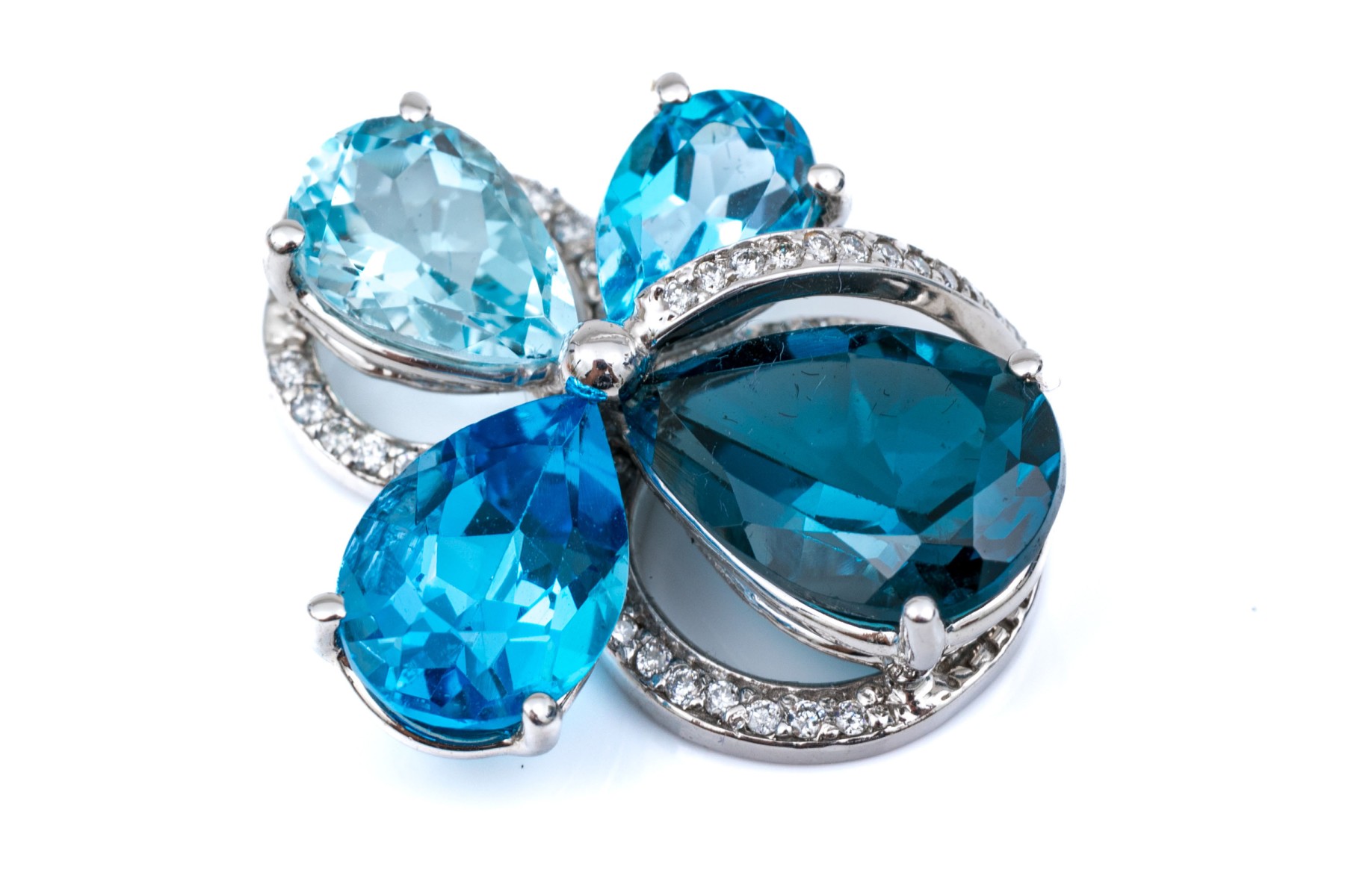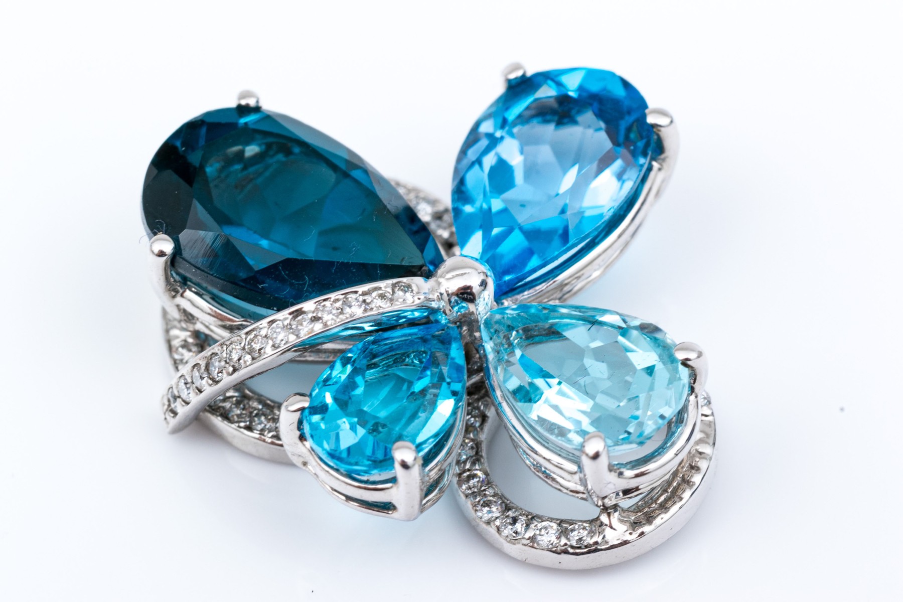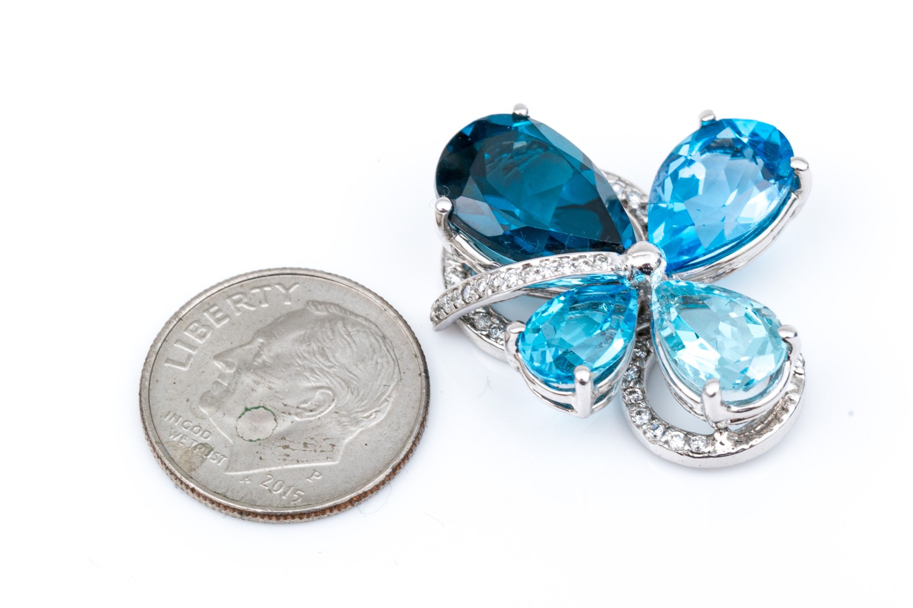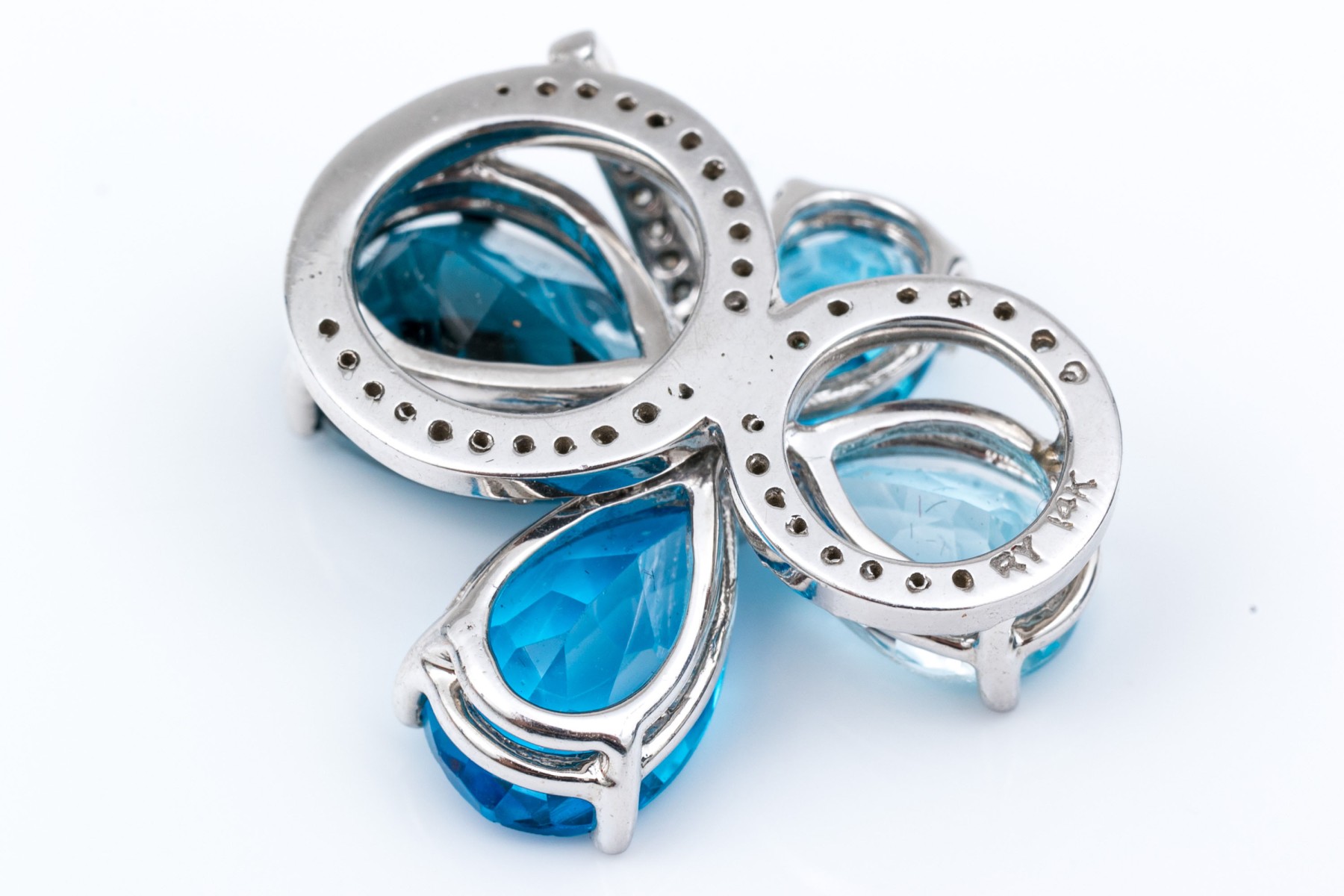 14k white gold beautiful multi toned blue topaz and diamond contemporary cluster pendant: diamonds app. 0.19 TCW, blue topaz app. 12.17 TCW, prong set, finished with and integral bale