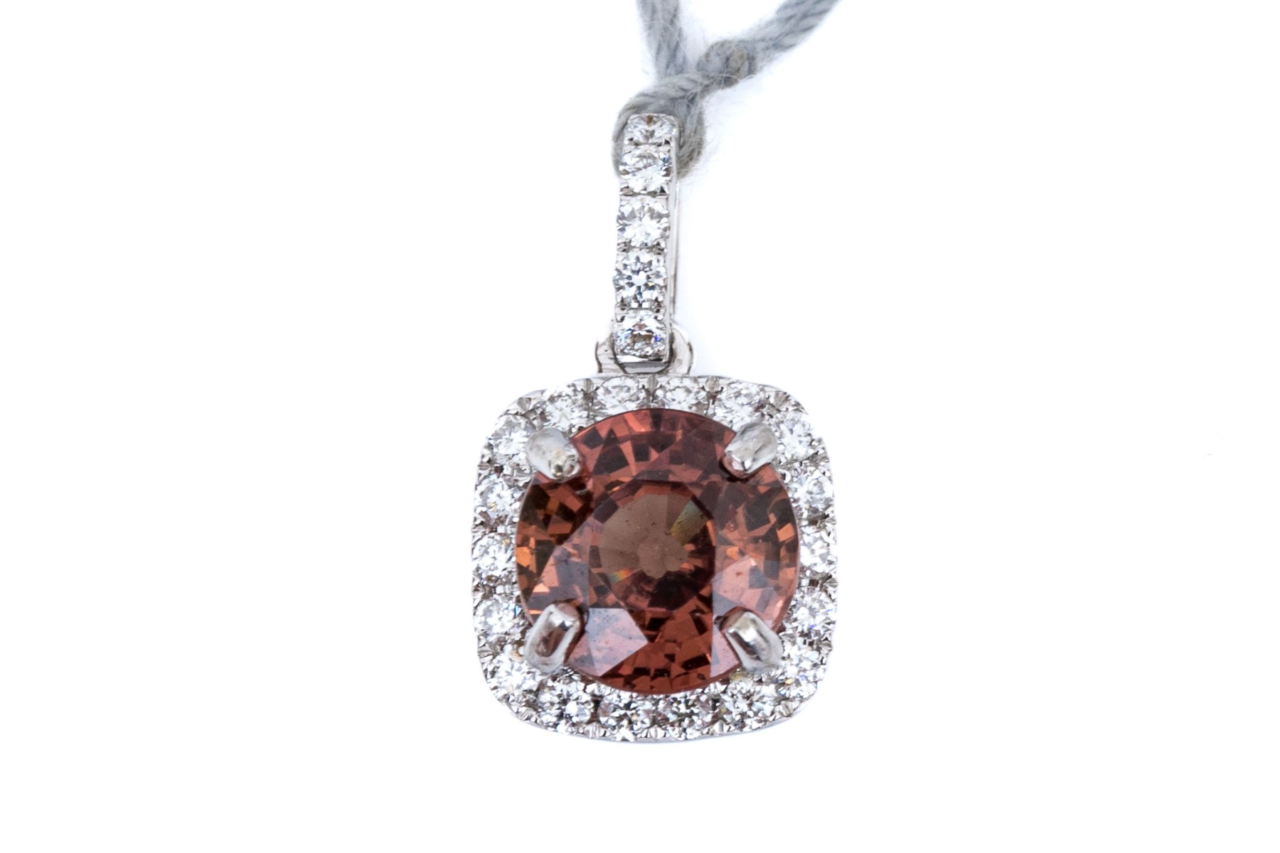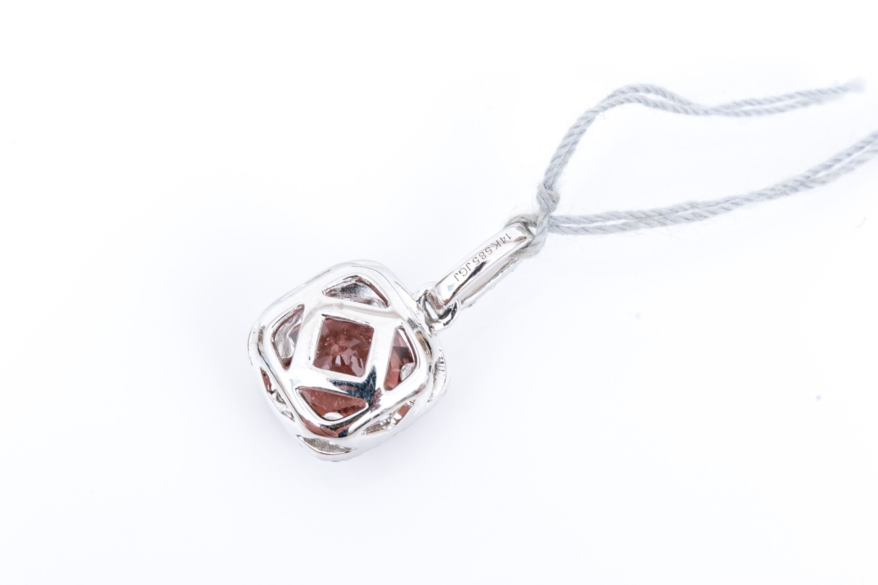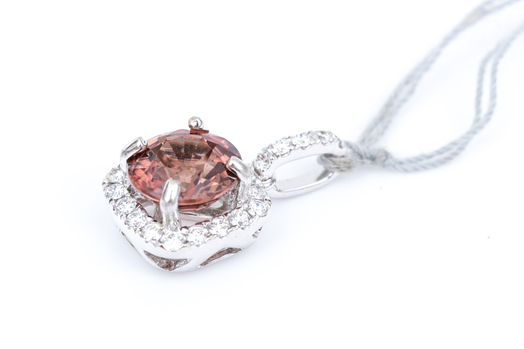 14k white gold beautiful rhodolite garnet and diamond halo finished with a diamond set bale pendant. The total diamond weight for the piece is app. 0.25 TCW, prong set