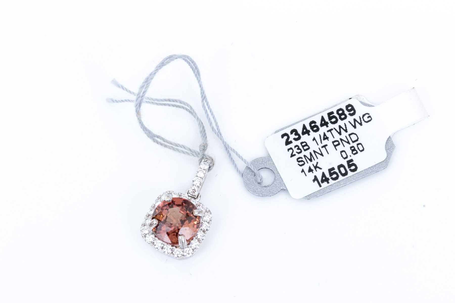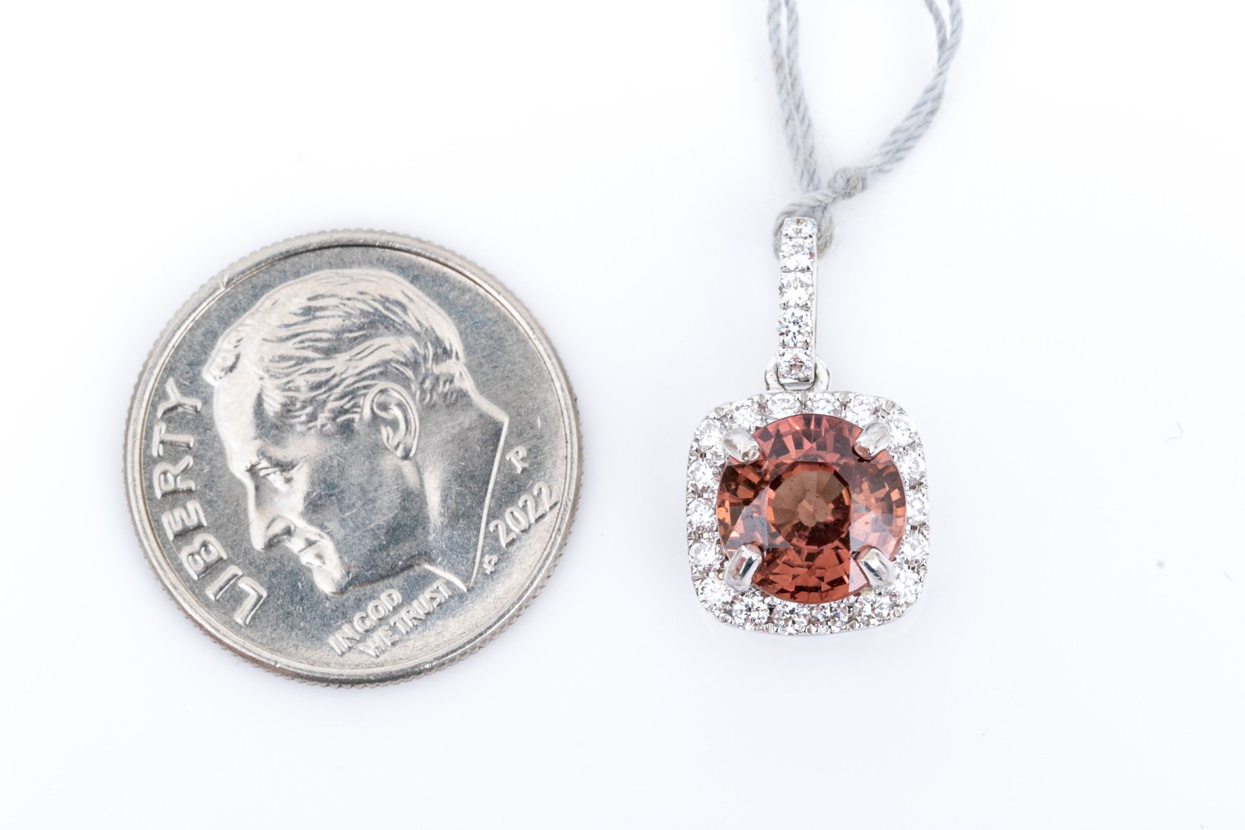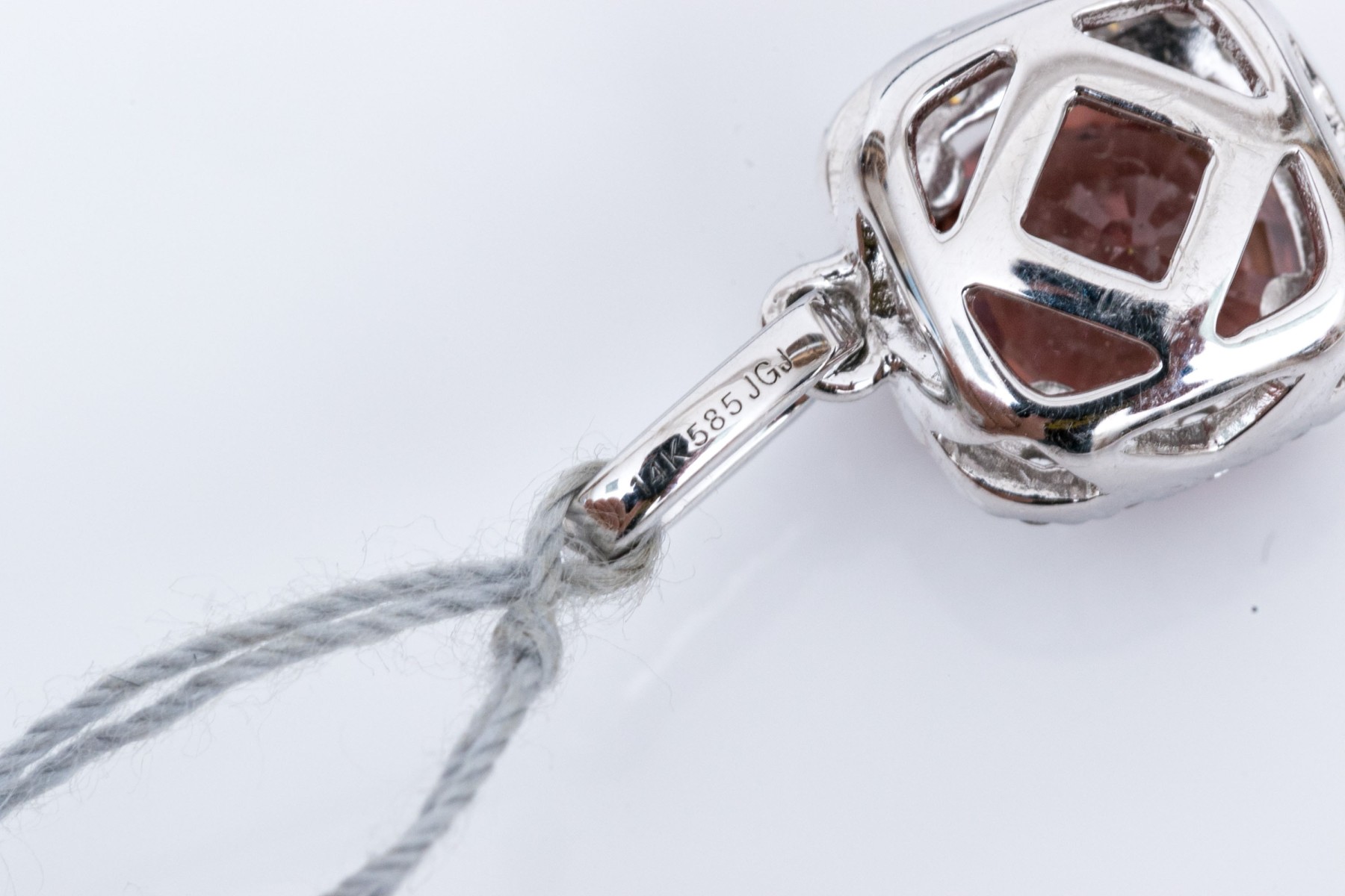 14k white gold beautiful rhodolite garnet and diamond halo finished with a diamond set bale pendant. The total diamond weight for the piece is app. 0.25 TCW, prong set
