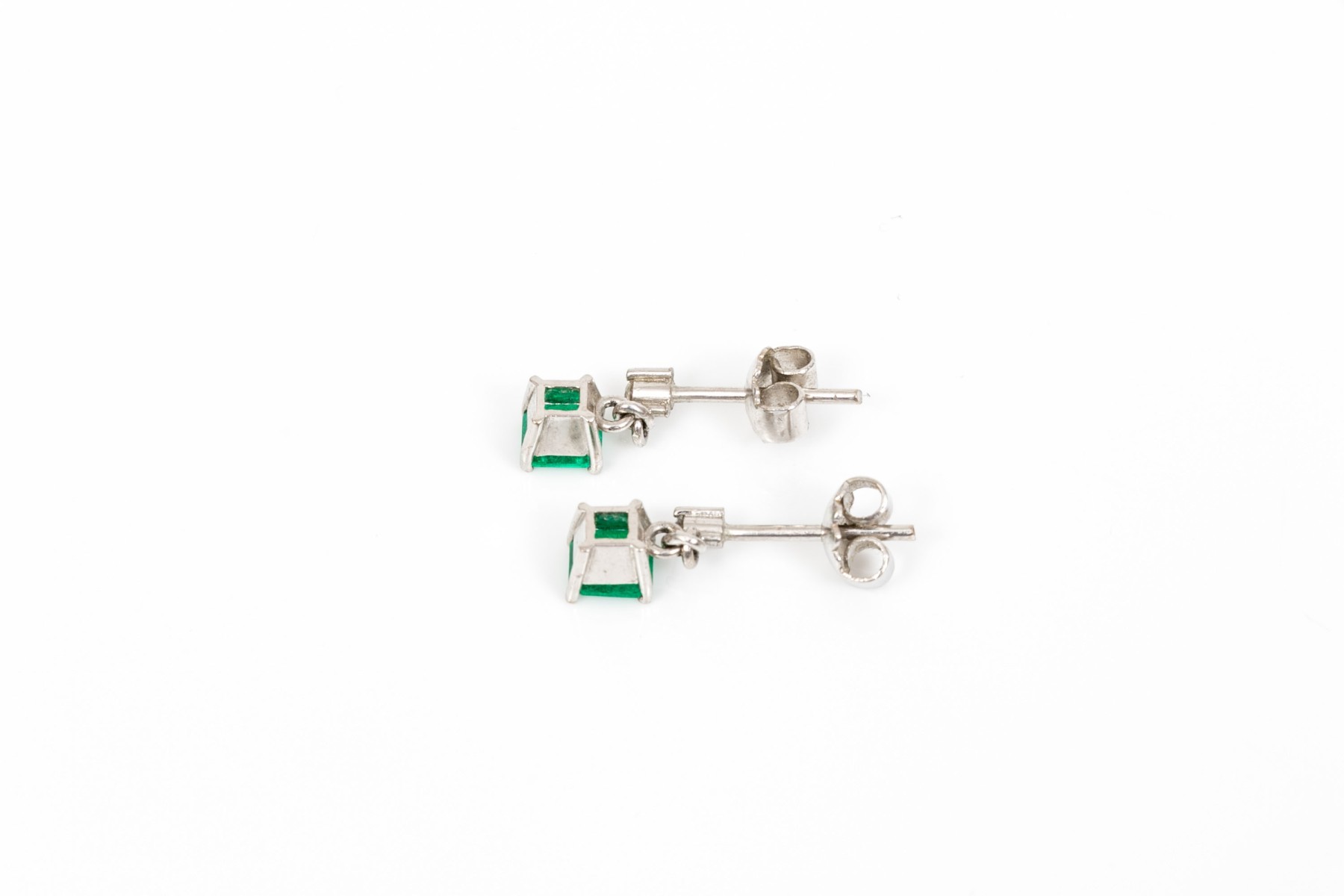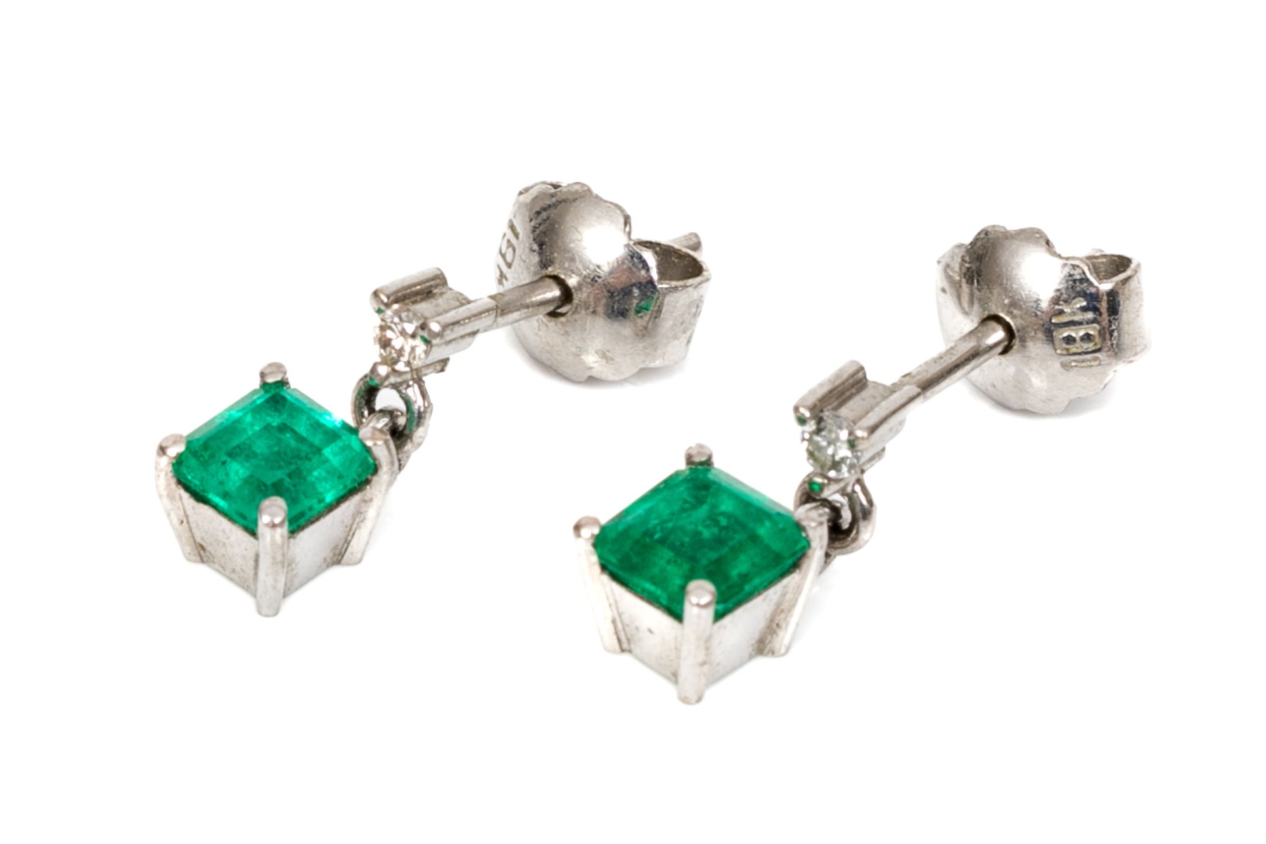 14k white gold beautiful square emerald and diamond drop earrings. These pretty earrings feature a round brilliant cut diamond top, app. 0.04 TCW, prong set from which dangle a square cut emerald, app. 0.80 TCW, also prong set. The earrings are finished by posts and clutch style backs