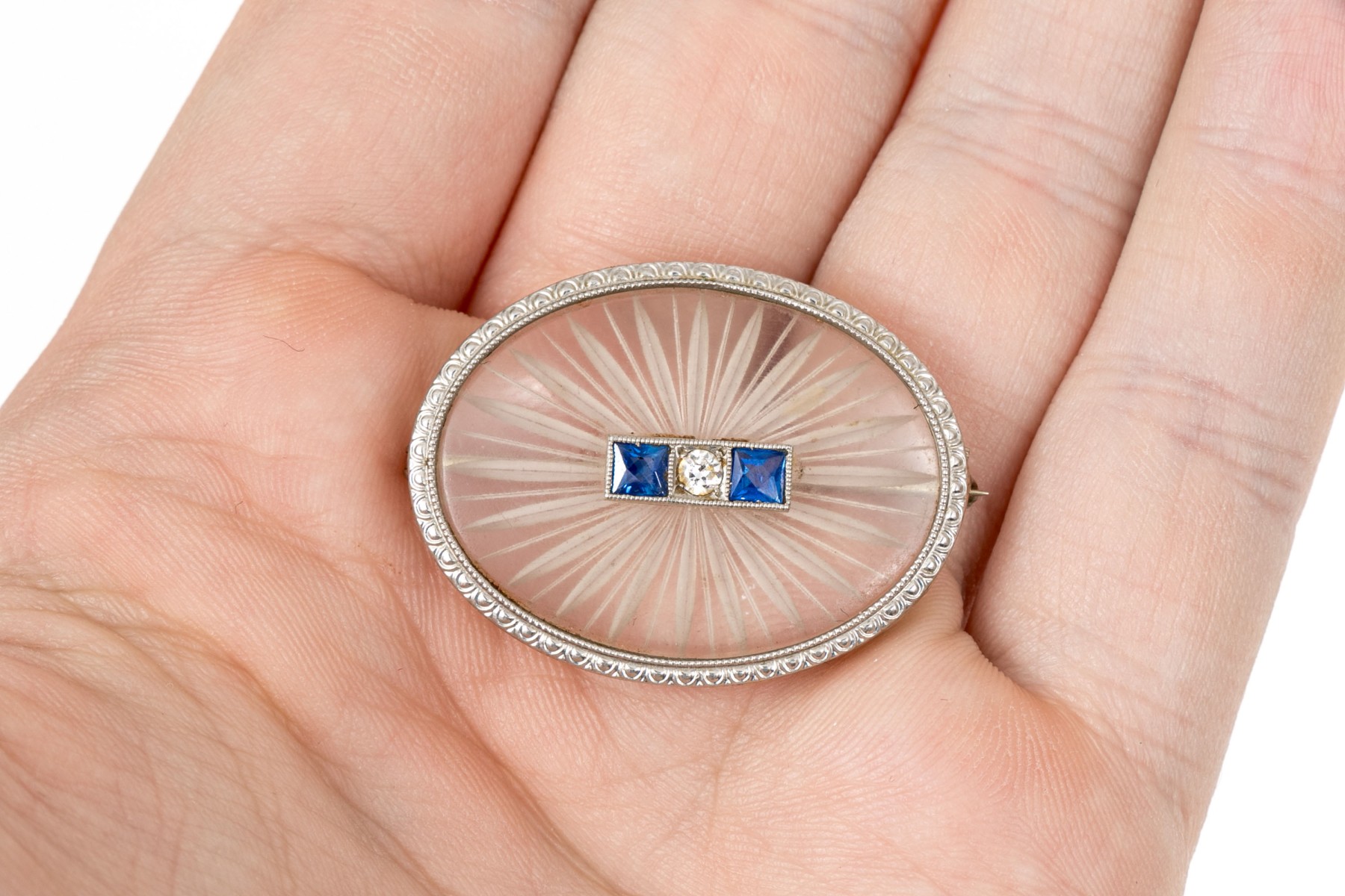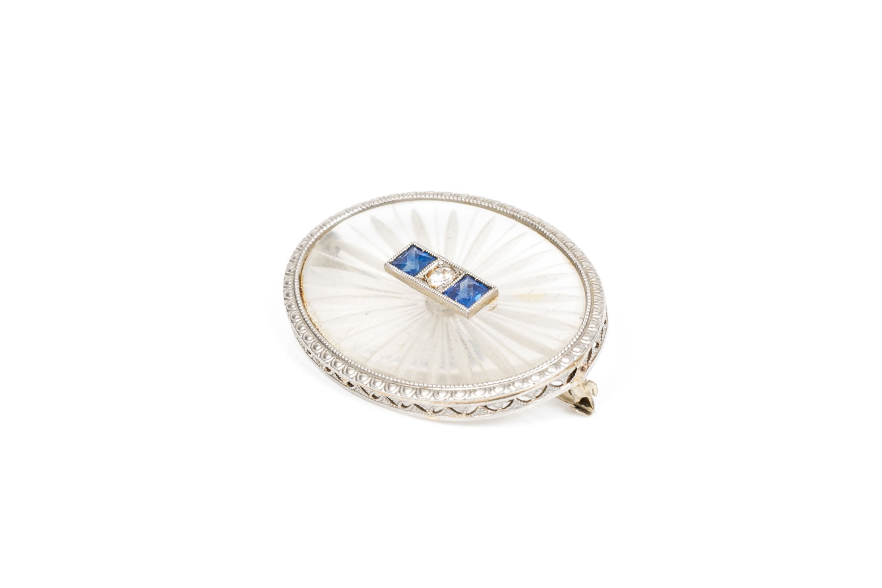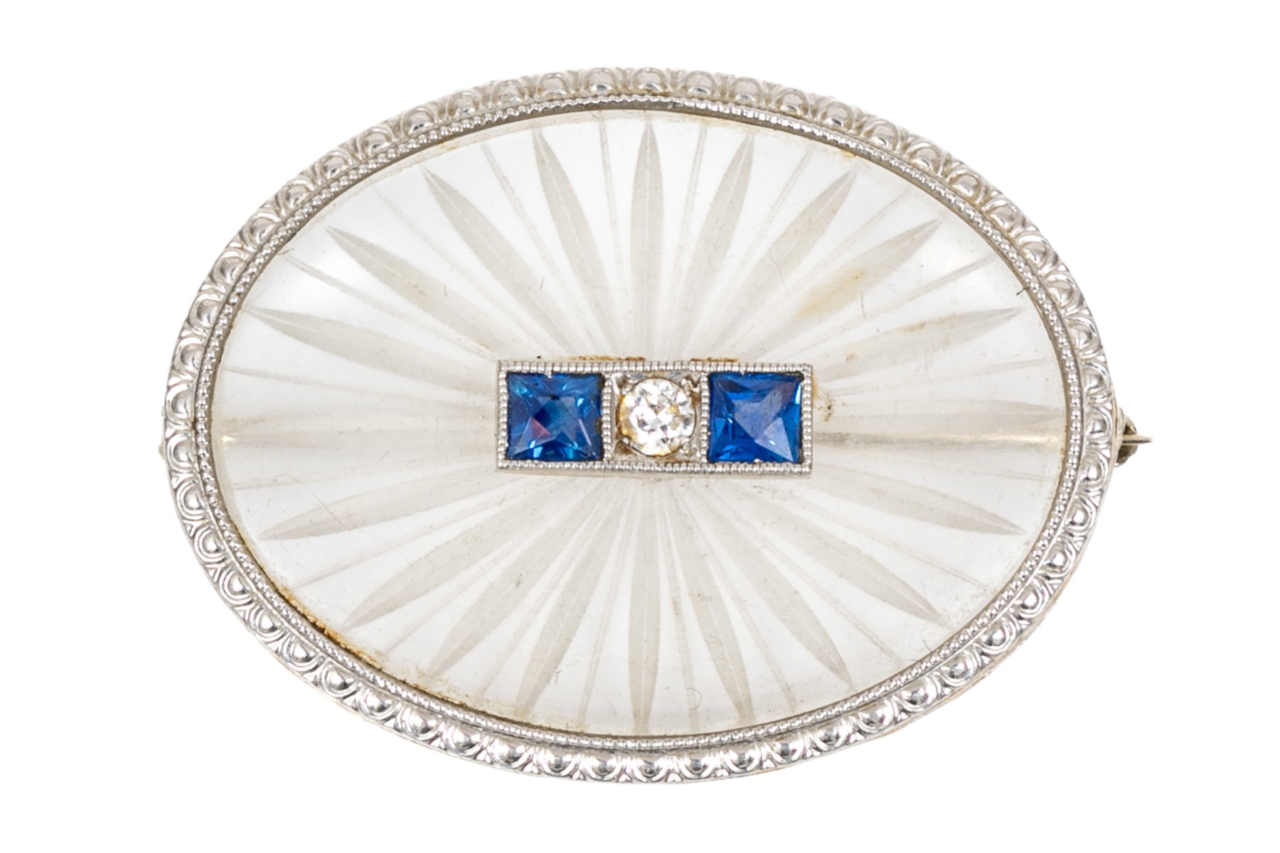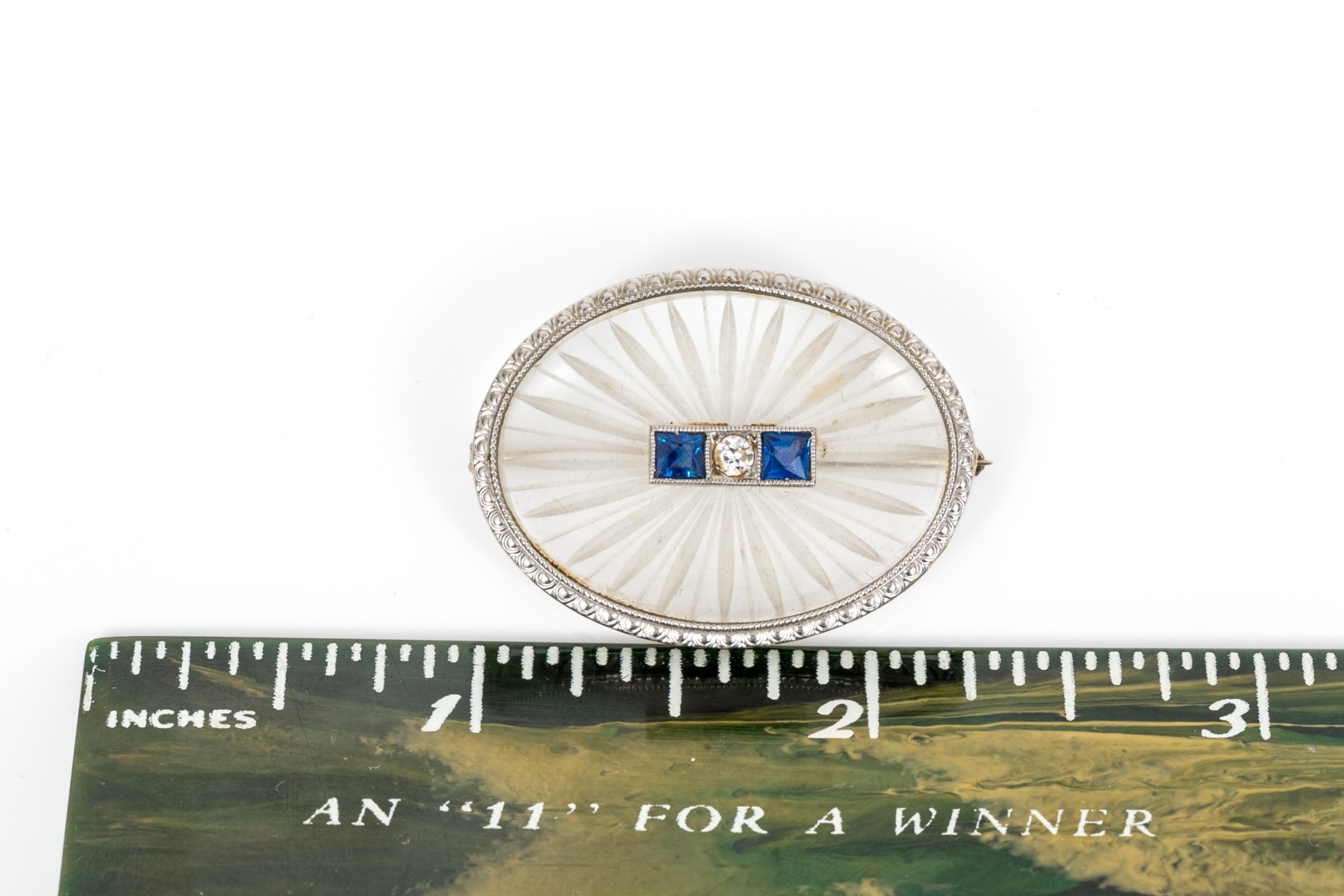 14k white gold beautiful vintage rock crystal quartz and diamond brooch, app. 0.04 CTS, with synthetic sapphires