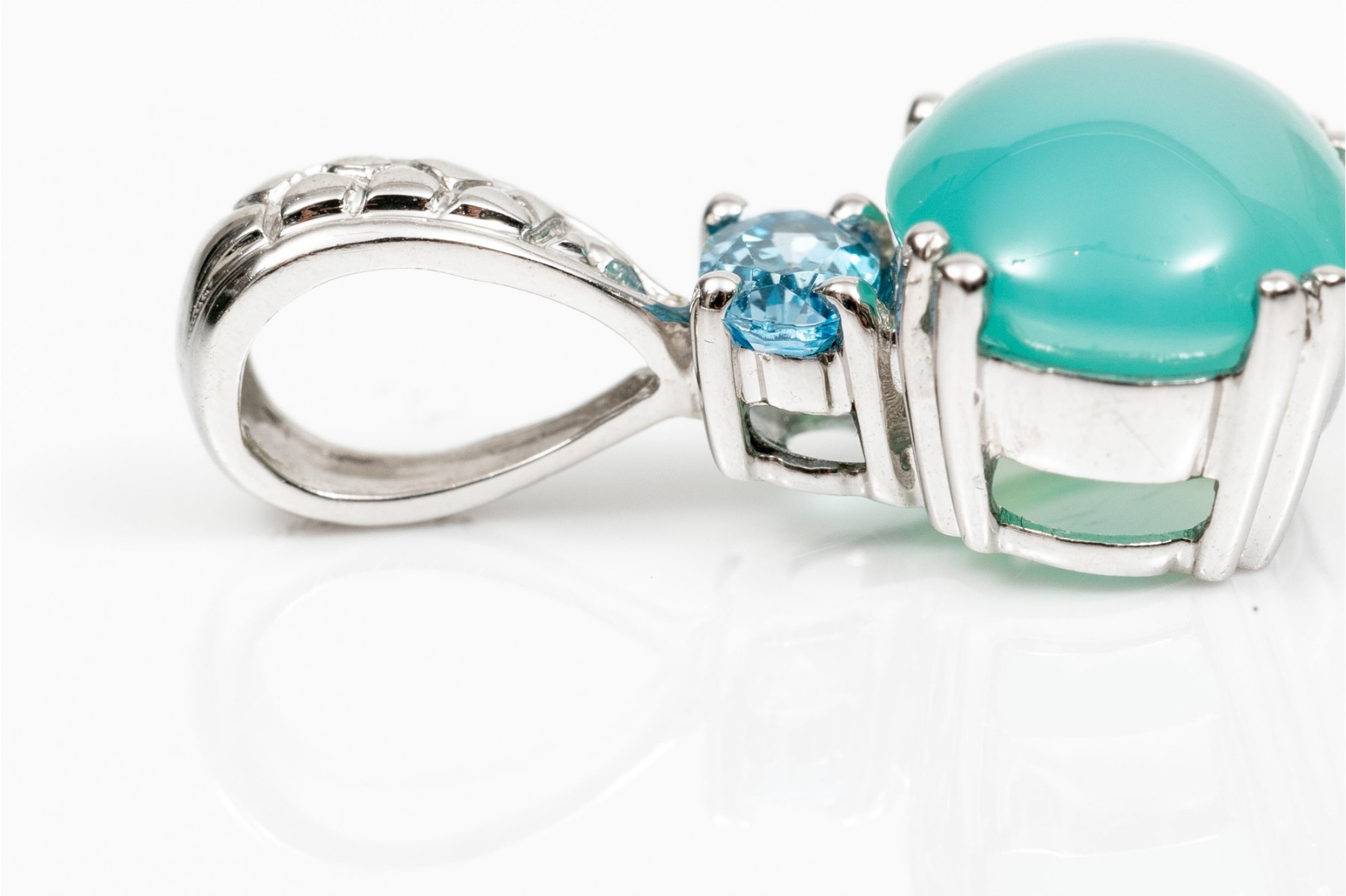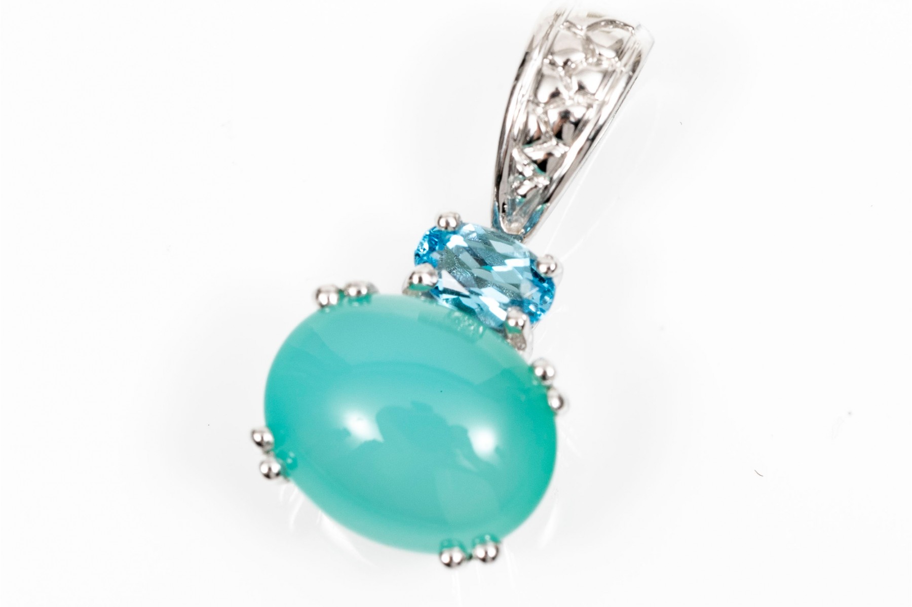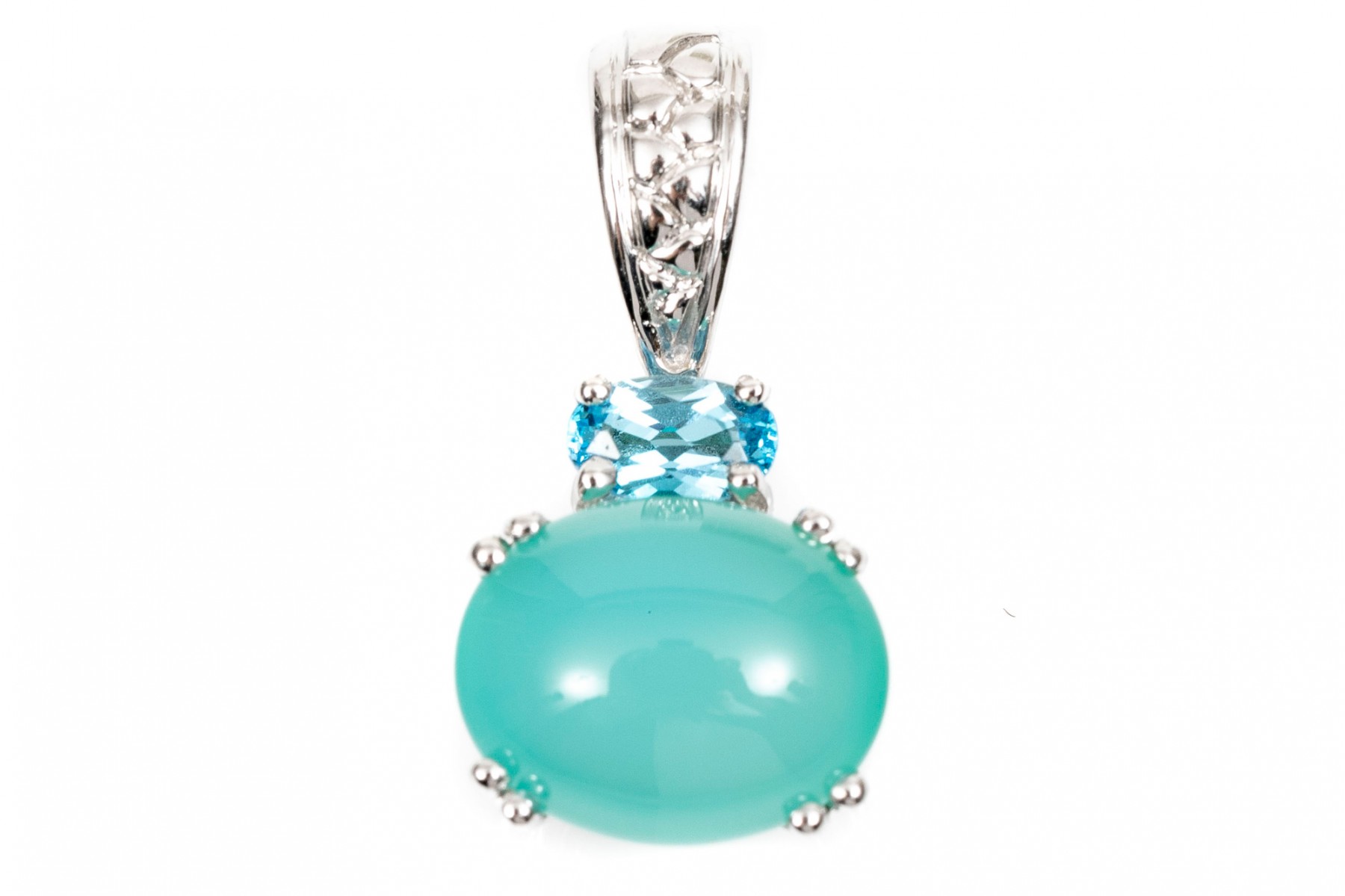 14K white gold pendant. Set into the pendant is a single oval cabochon cut blue chalcedony. Above this is a single blue oval faceted topaz stone. Textured bale.