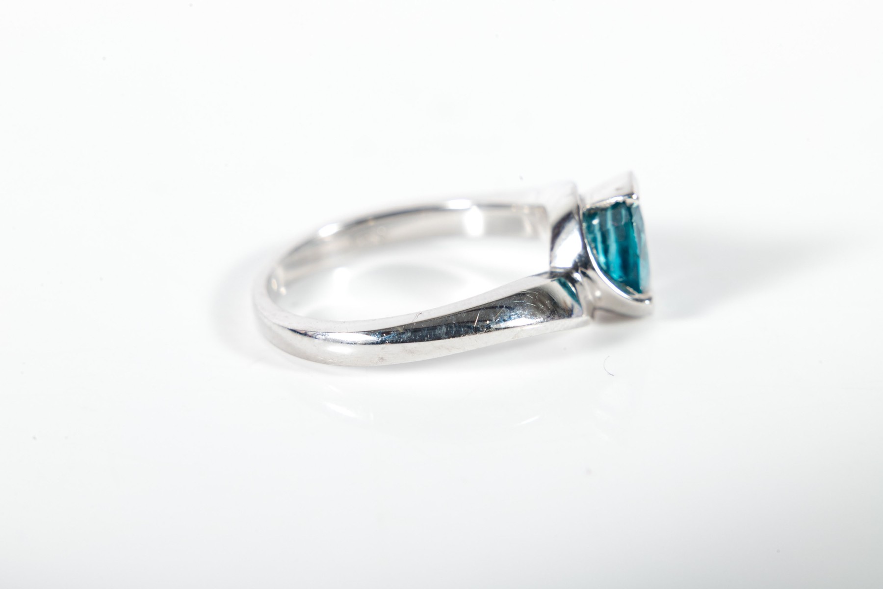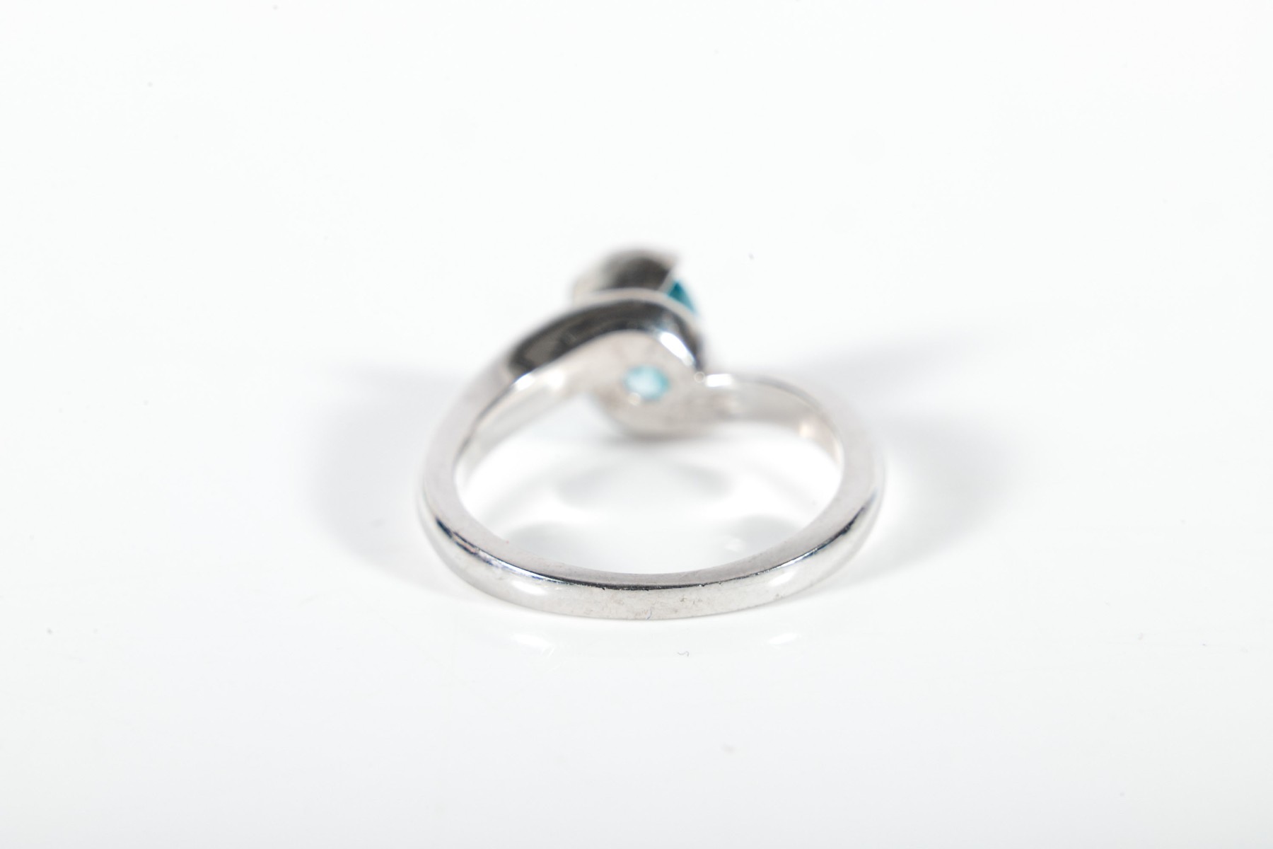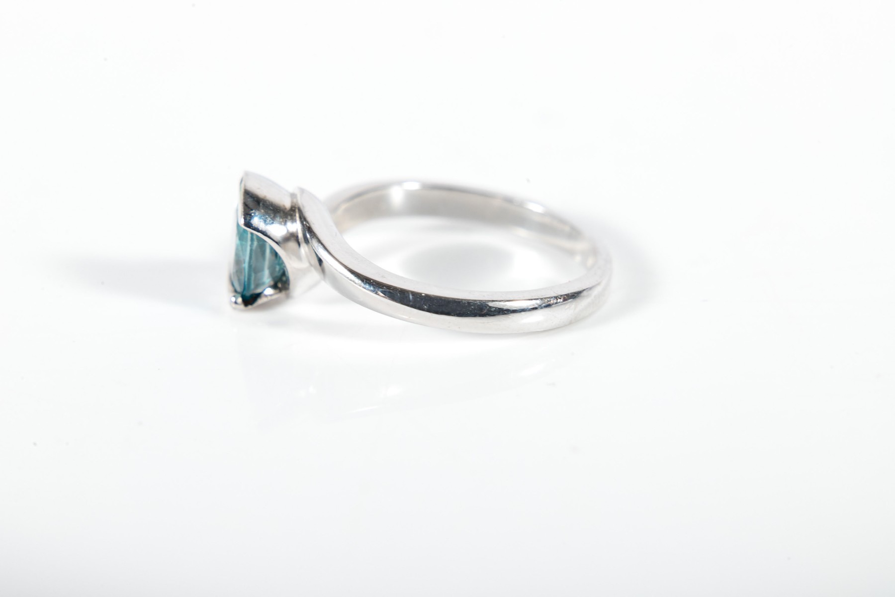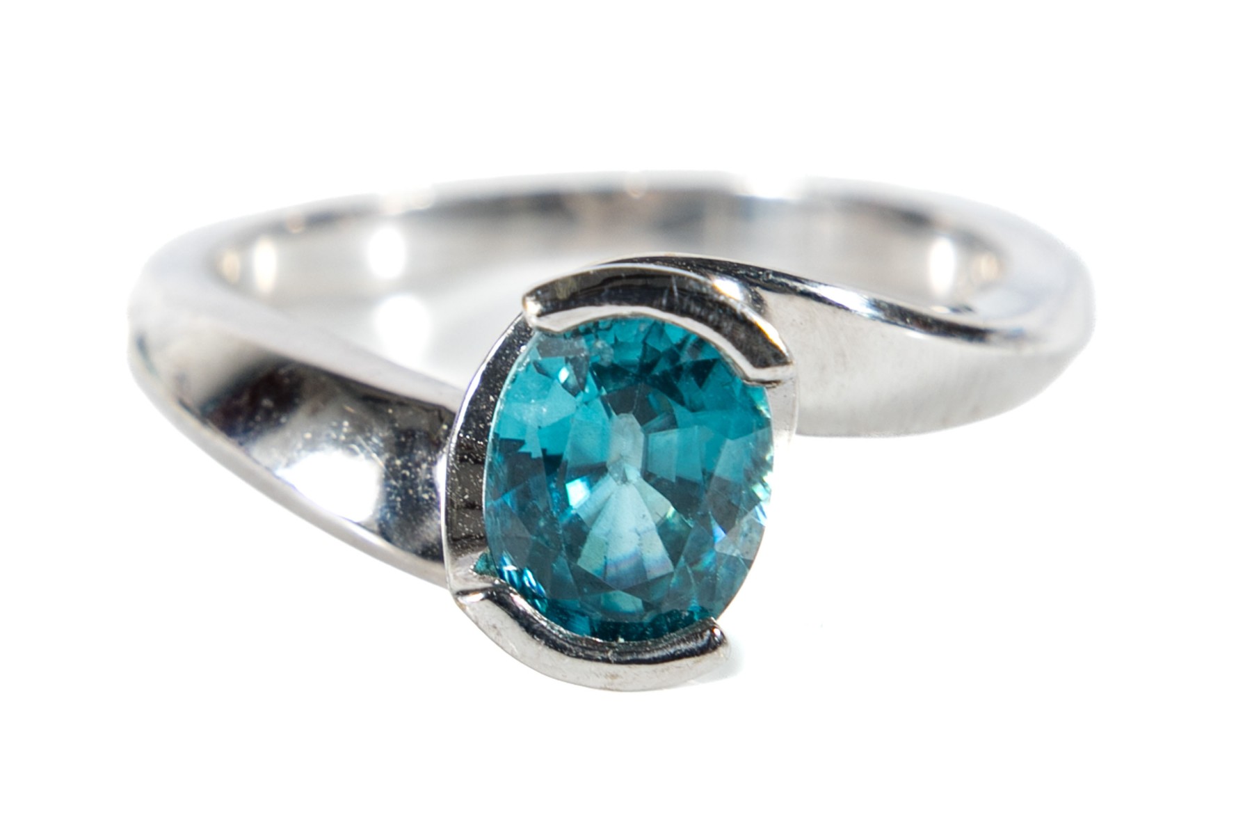 An white gold ring displaying an oval, vibrant aqua-blue topaz in a half-bezel setting along elegant bypass shoulders with gentle twists for excellent visual interest.
