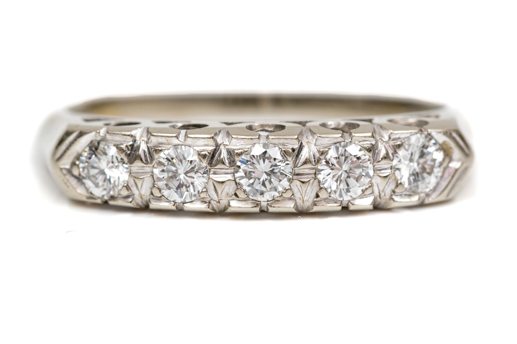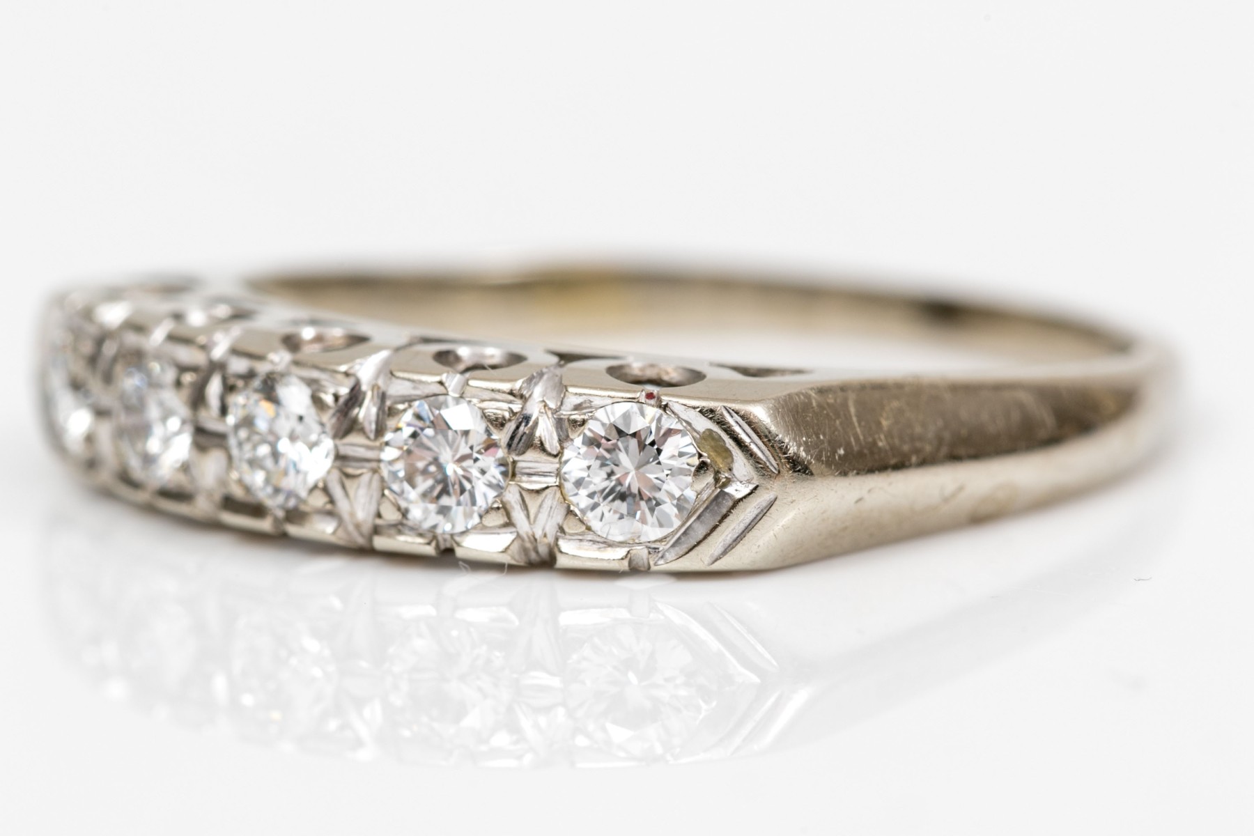 14k White Gold Classic Five Stone Diamond Band Ring, App. 0.25 TCW, Size 7.5 #258995. Black Rock Galleries provides high end estate liquidation services through online estate auctions and a 50,000 sq ft designer showroom. estate liquidator, estate sale, online auction, antiques, fine art, liquidation, clean outs, auction, consignment, interior design, fine jewelry, collectibles, appraisals, estate appraisals, estate services, decor, furniture, furniture consignment, antique center, consignment shop. We offer appraisal services and specialize in fine art, jewelry, antiques and decorative arts. Sell with us. Black Rock Galleries is the tri-state's largest estate liquidator serving New England and the greater New York City area. We are the trusted source for expert appraisals, auction services, estate sales, and consignments. Black Rock Galleries is the east coast's largest and most trusted estate liquidator, with locations in Connecticut, greater Boston, MA and Raleigh, NC, Fairfield, Southport, Apex, TX. We are the best source for expert appraisals, auction services, estate sales and consignments. We have served thousands of families and estates with compassion, professionalism and expertise. BRG works with attorneys, executors, realtors and families to bring the greatest return on personal and estate property in the current market. Our unique combination of services make us the easy choice to get the job done in a timely and stress-free manner. We are with you from the initial consultation to the final clean out. Our house-built online auction software platform offers clients a dynamic approach to liquidating their personal property. This venue is most successful in bringing the best return with the least amount of disruption for our clients. See our services page for a complete description of this offering. 14k White Gold Classic Five Stone Diamond Band Ring, App. 0.25 TCW, Size 7.5 #258995