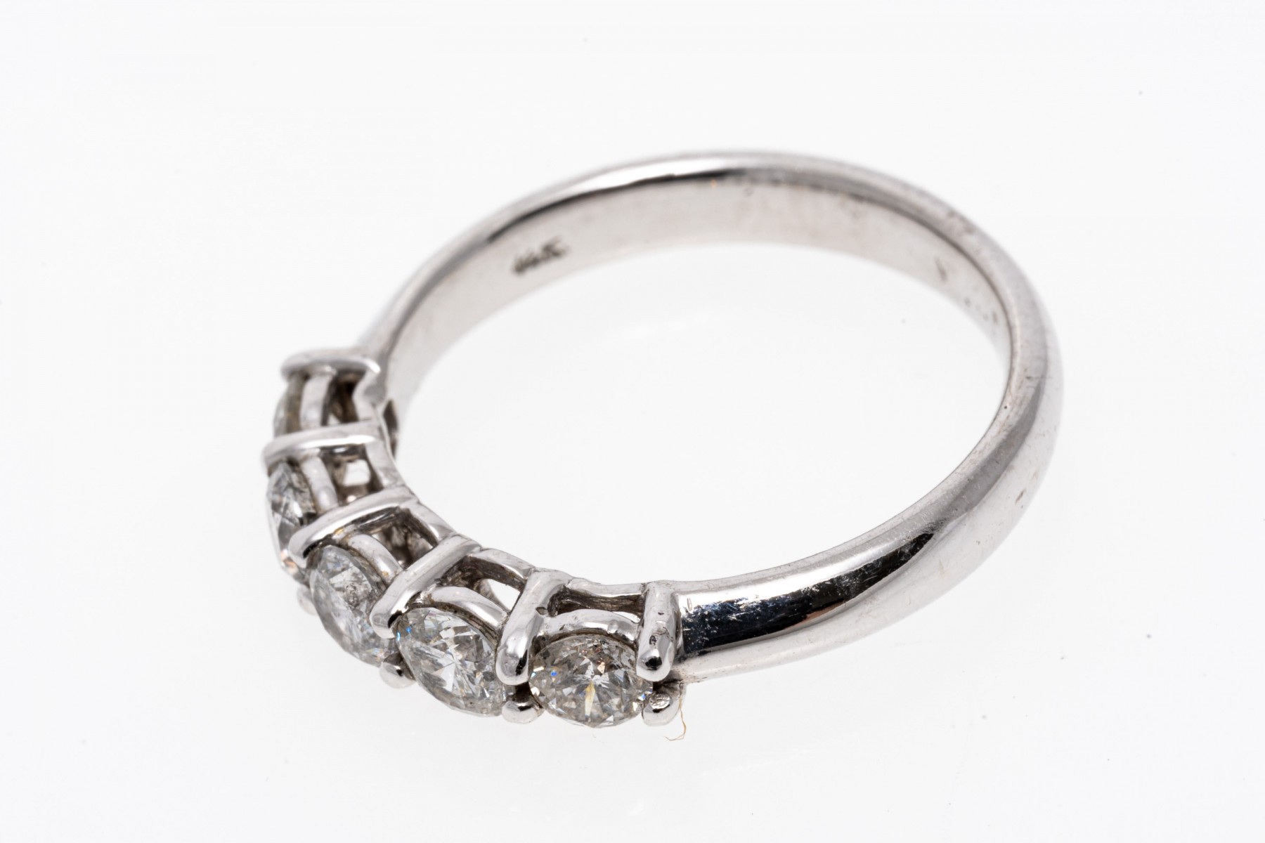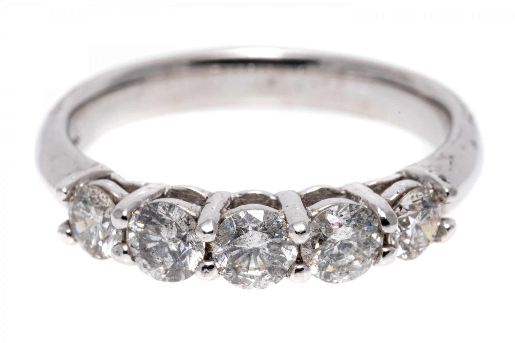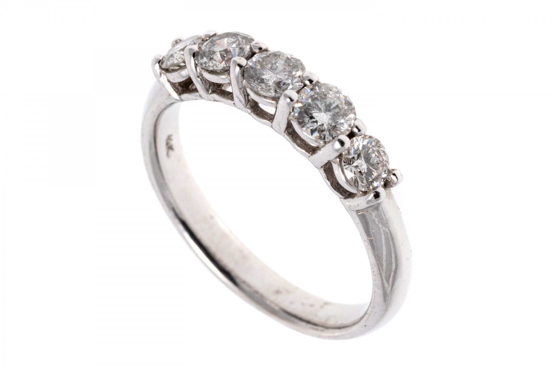 14k white gold ring. This classic white gold band ring is set with a row of five round brilliant cut diamonds, prong set, approximately 0.80 TCW.