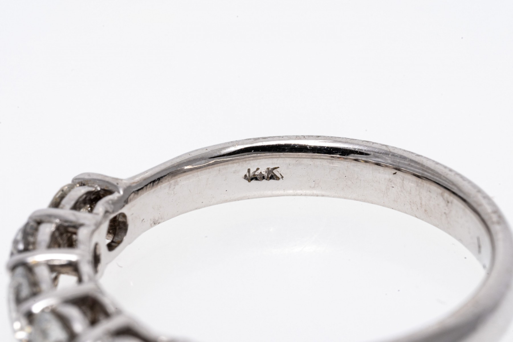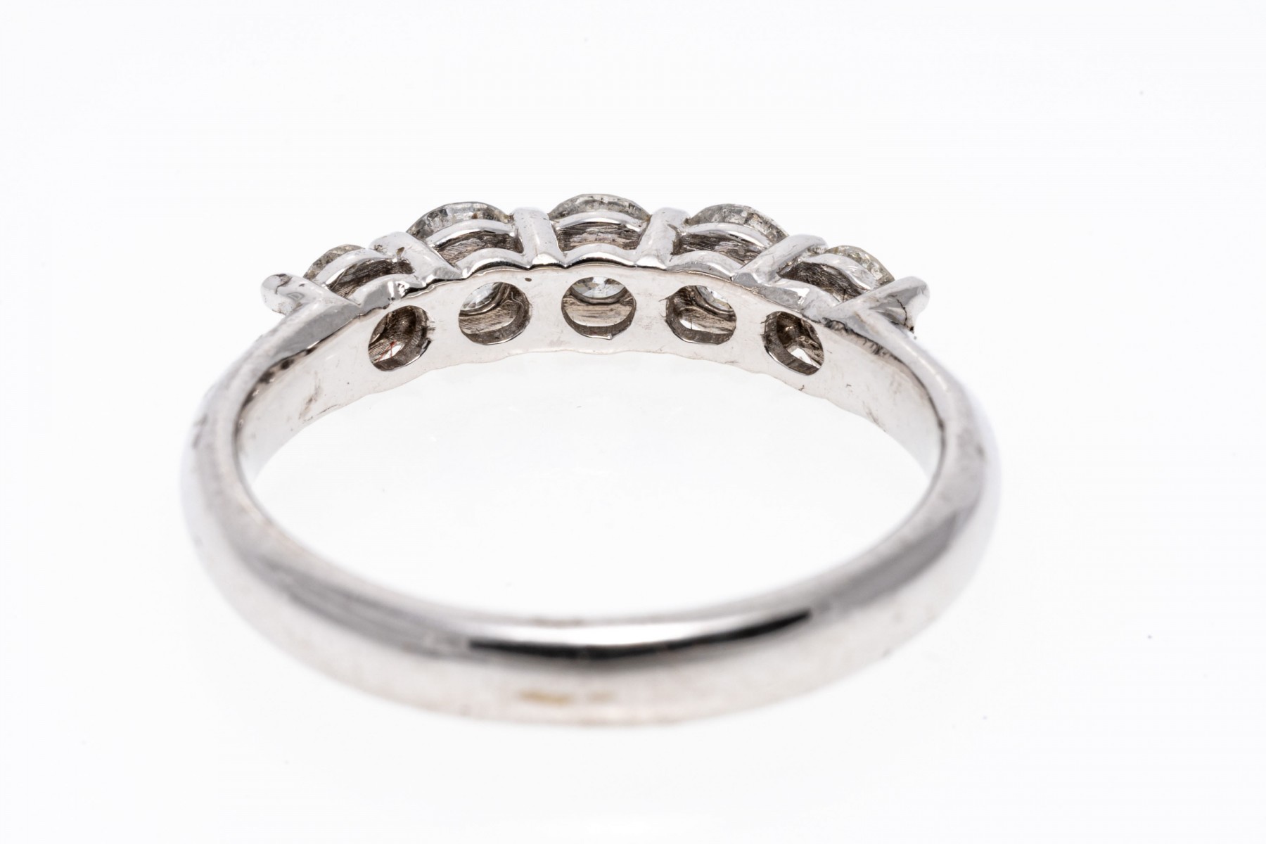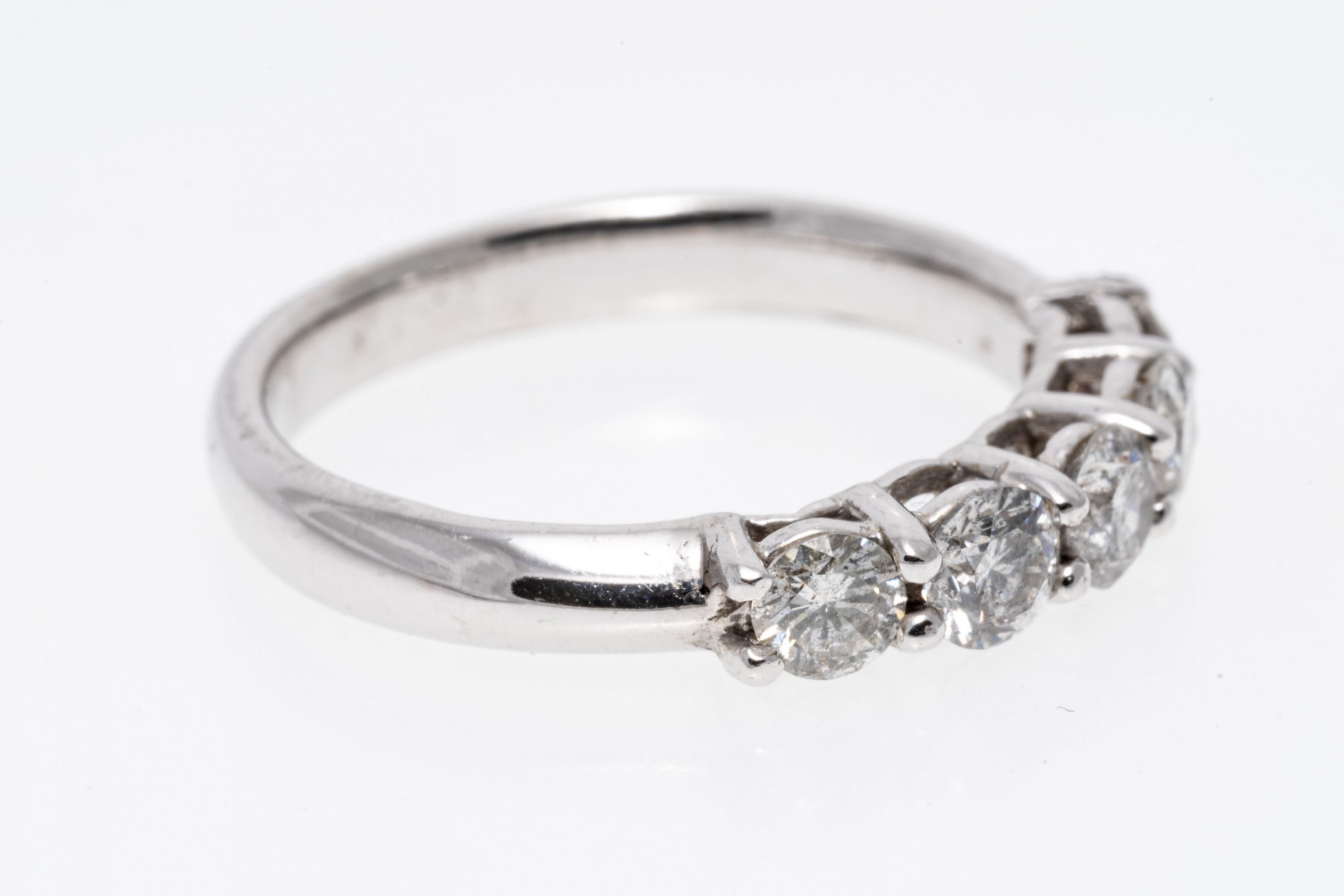 14k white gold ring. This classic white gold band ring is set with a row of five round brilliant cut diamonds, prong set, approximately 0.80 TCW.