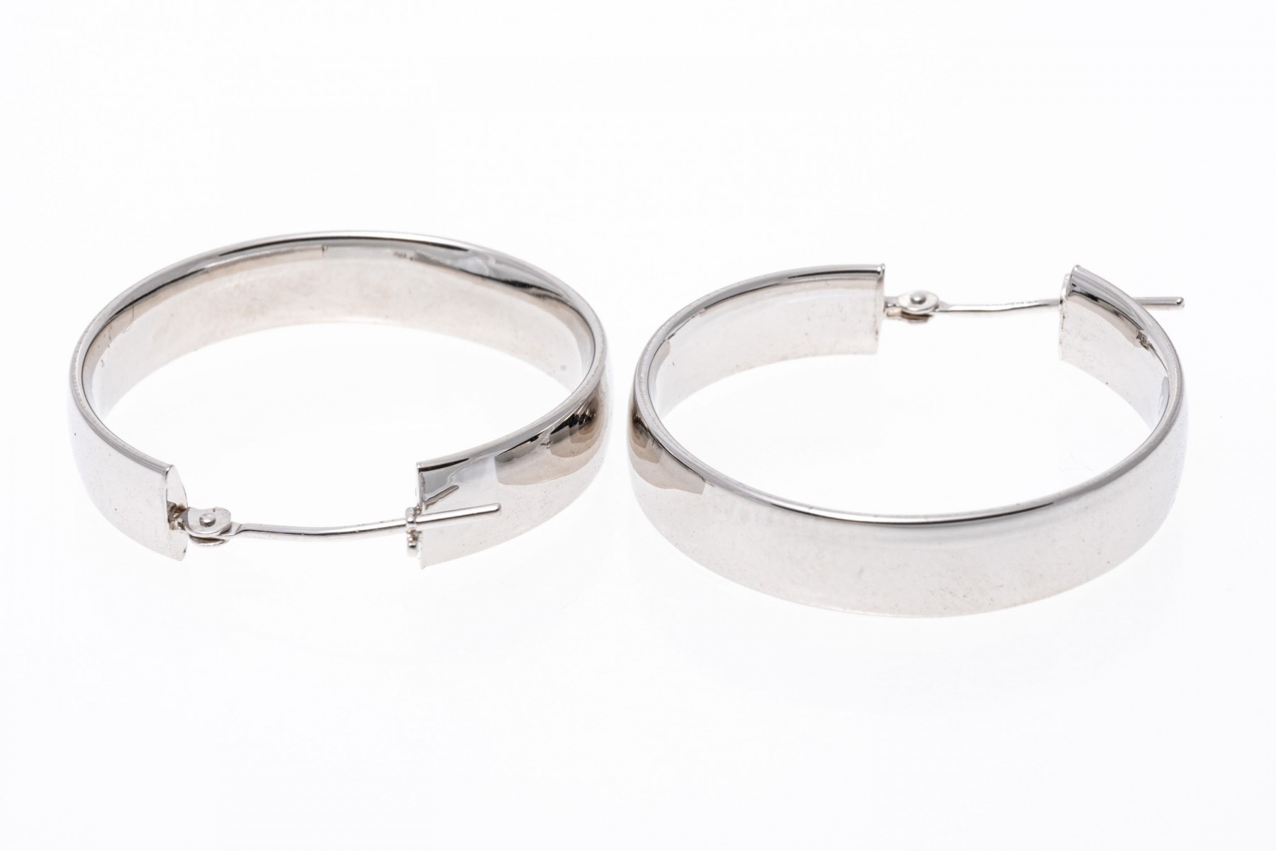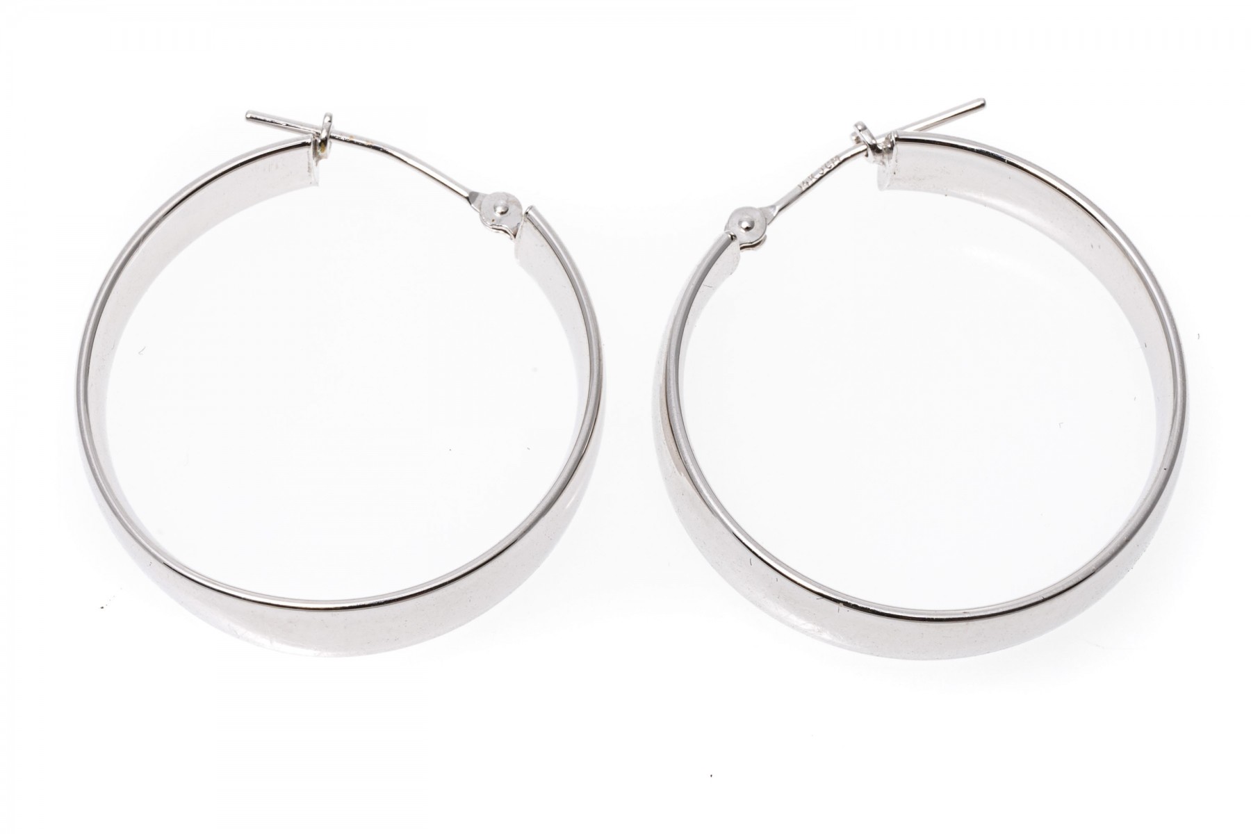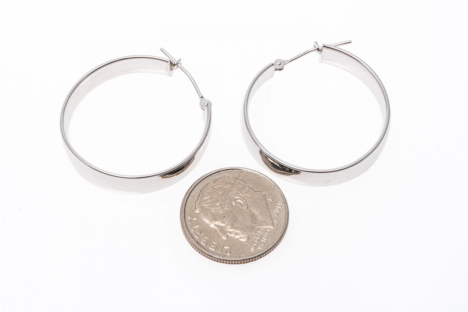 14k white gold earrings. These classic simple earrings are a round, high polished hoops, finished with hinged ear wires with "u" hook style closures.