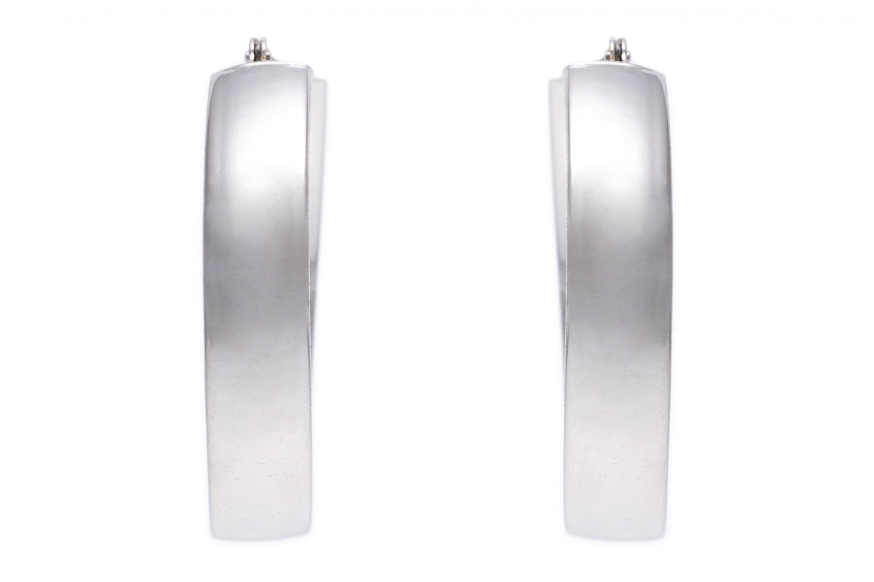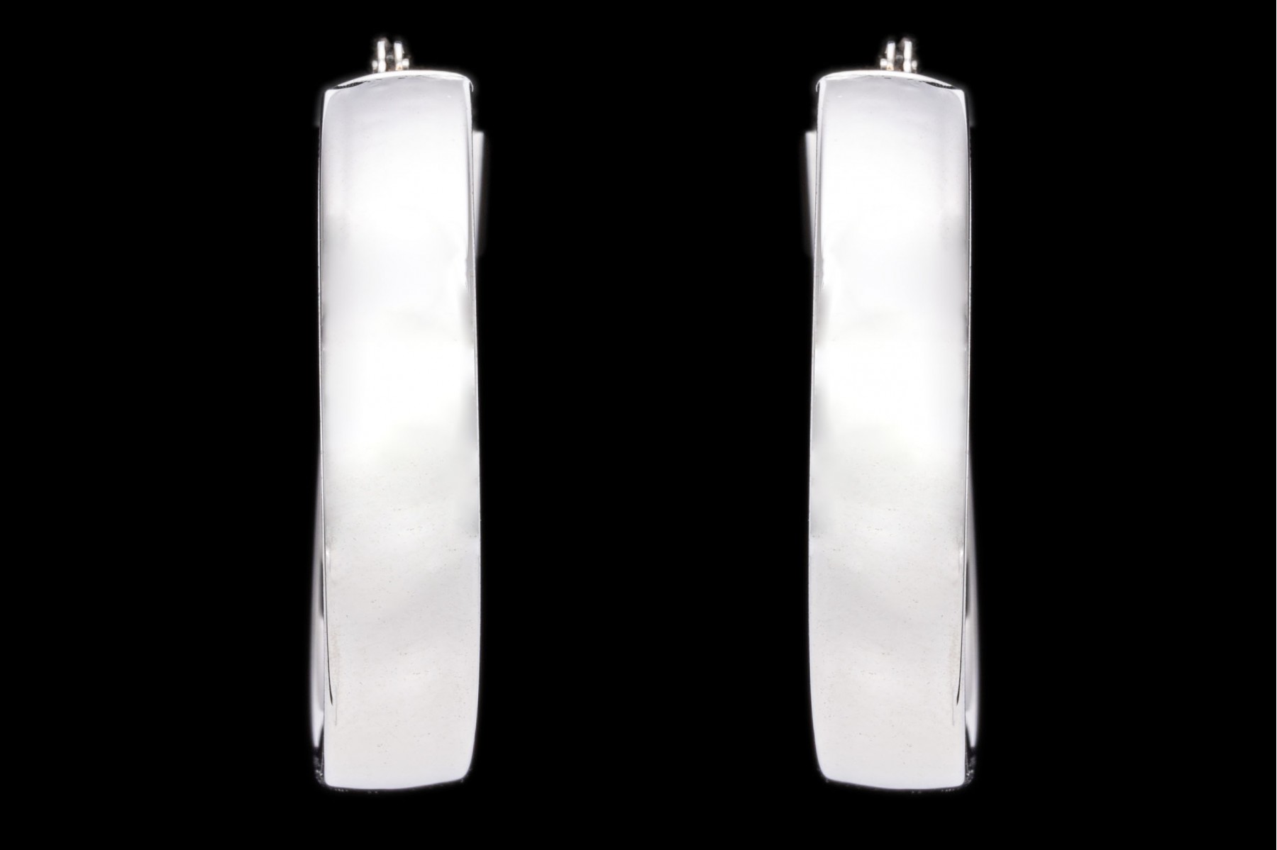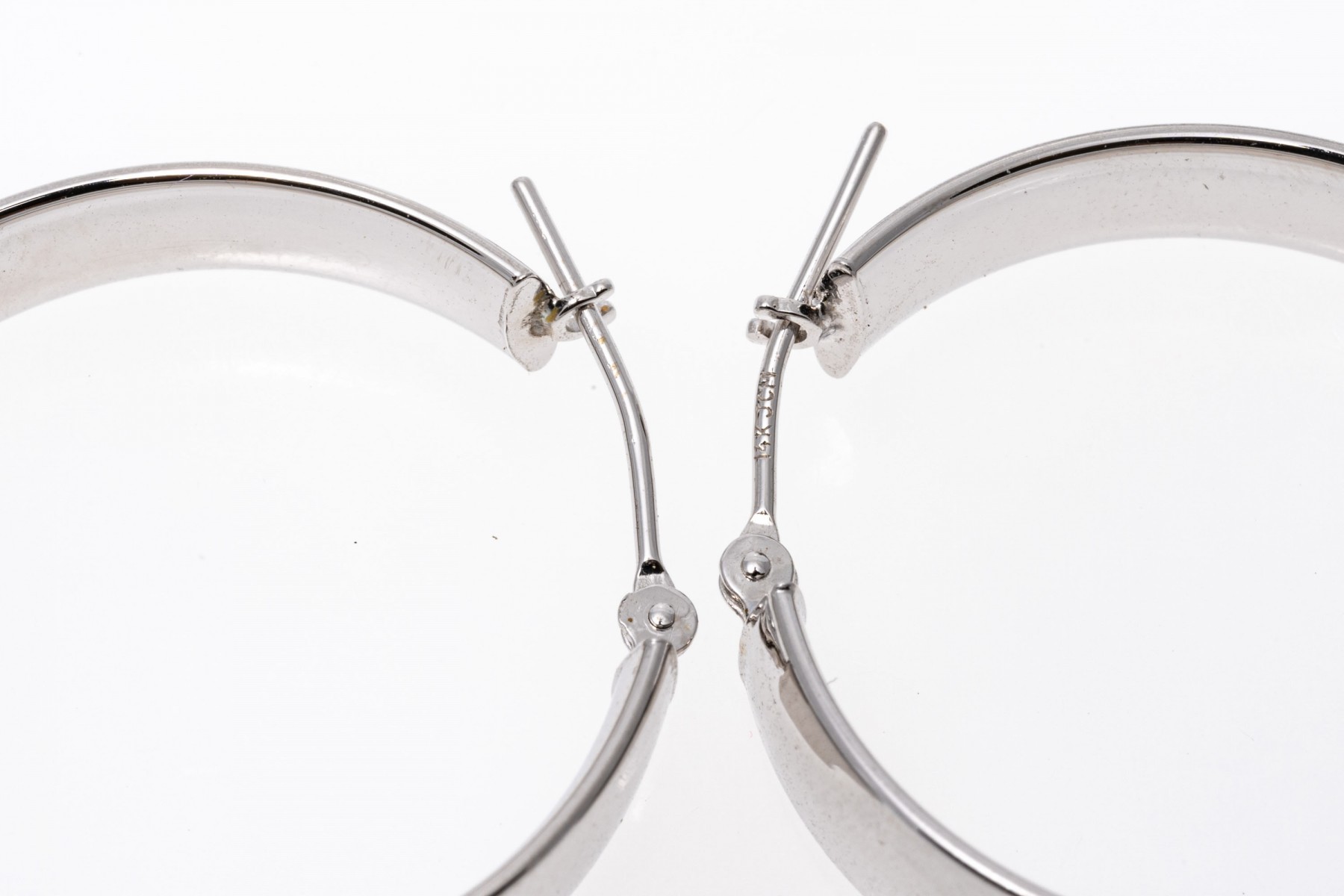 14k white gold earrings. These classic simple earrings are a round, high polished hoops, finished with hinged ear wires with "u" hook style closures.